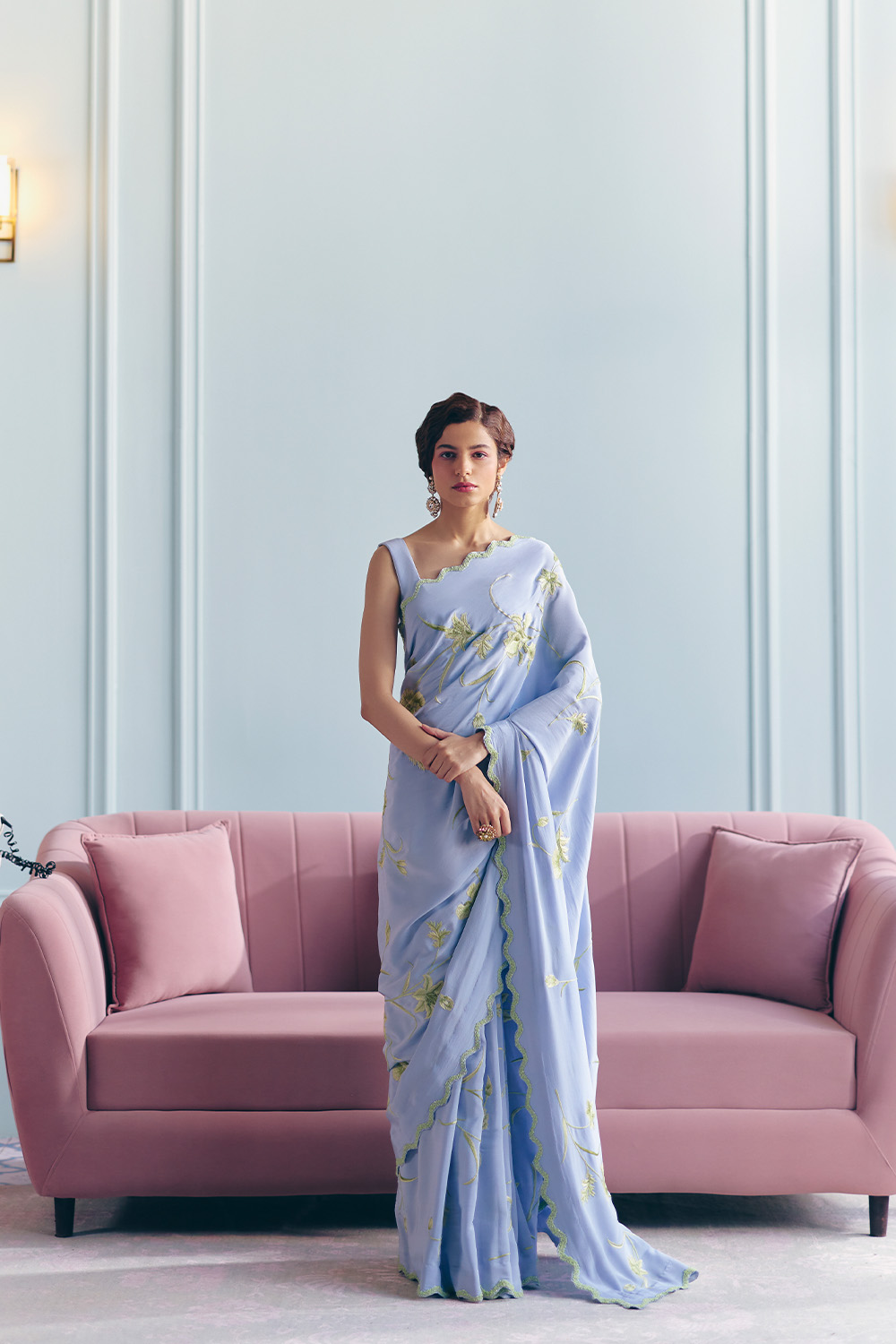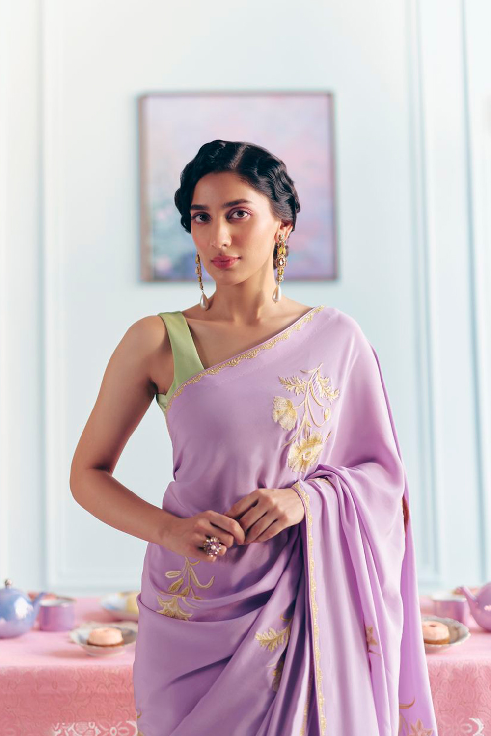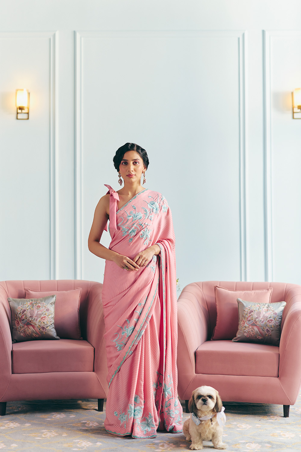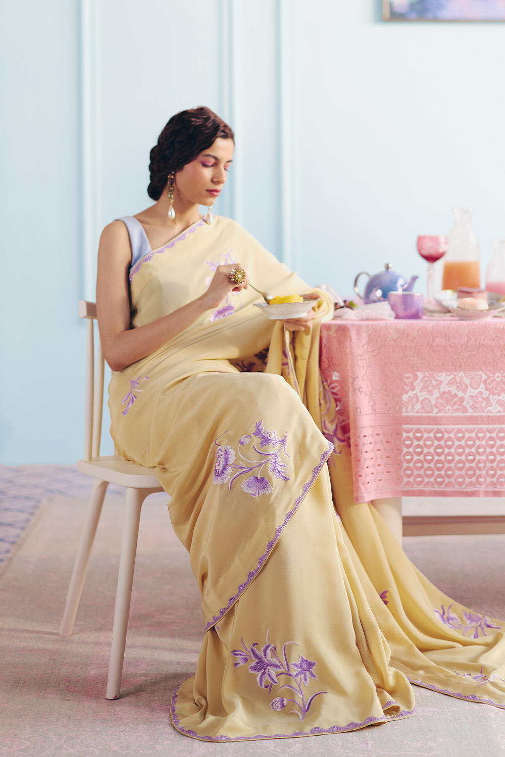 From Audrey to Bridgette, and Shirley to Marylin—we imagine these beautiful women arriving in the lobby—draped in our gloriously light yet glamorous saris, with their perfectly made up faces and their vintage travel cases in tow.