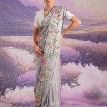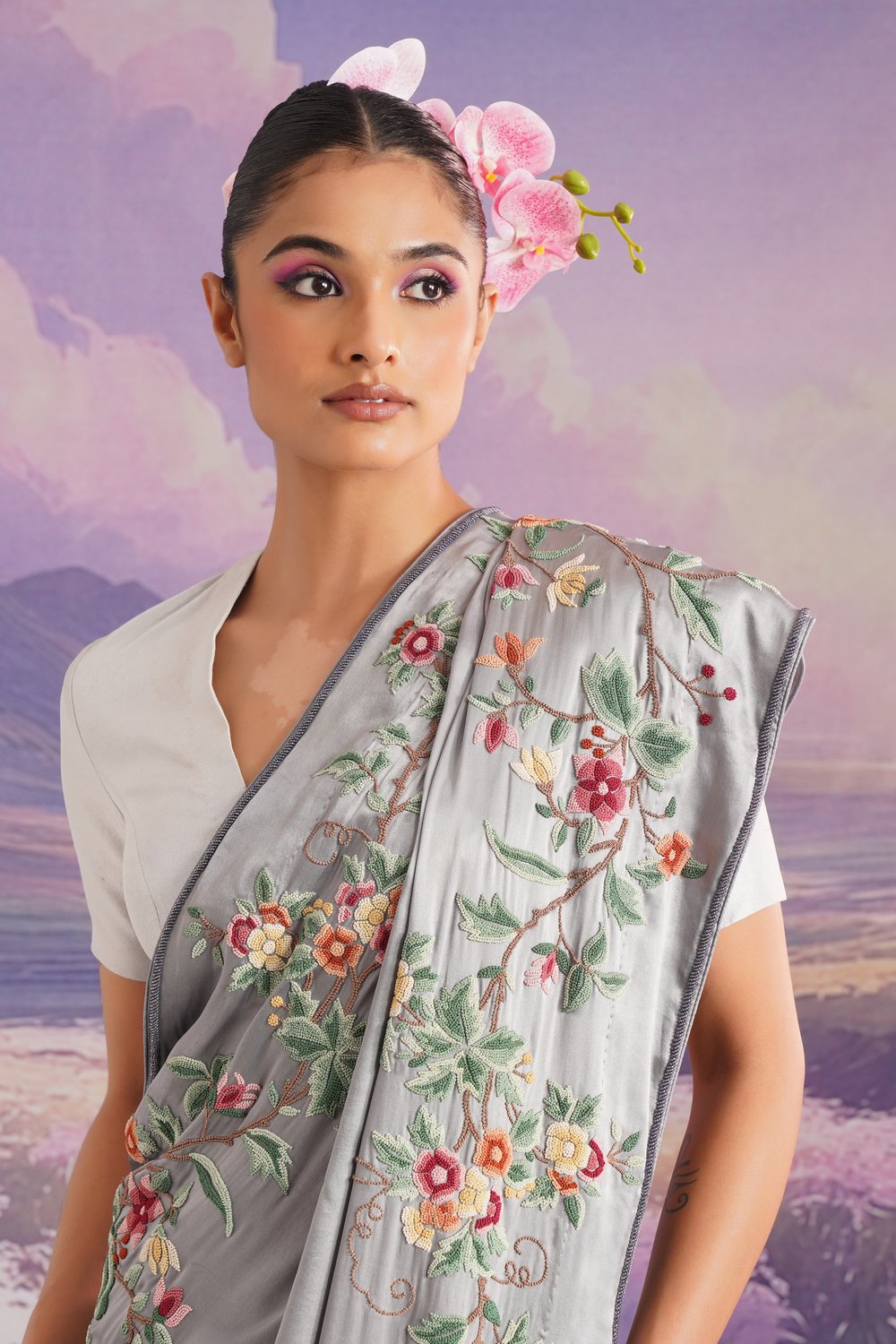 Lush florals cascade down the length of our Two Hundred Flowers french knot sari crafted from Stone Grey satin.