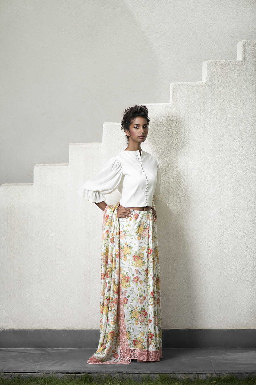 Our bahaar print saris have been inspired by spring flowers. The saris have a contrast, floral gara border, which is hand-embroidered on net. These easy, breezy saris are perfect for the day!