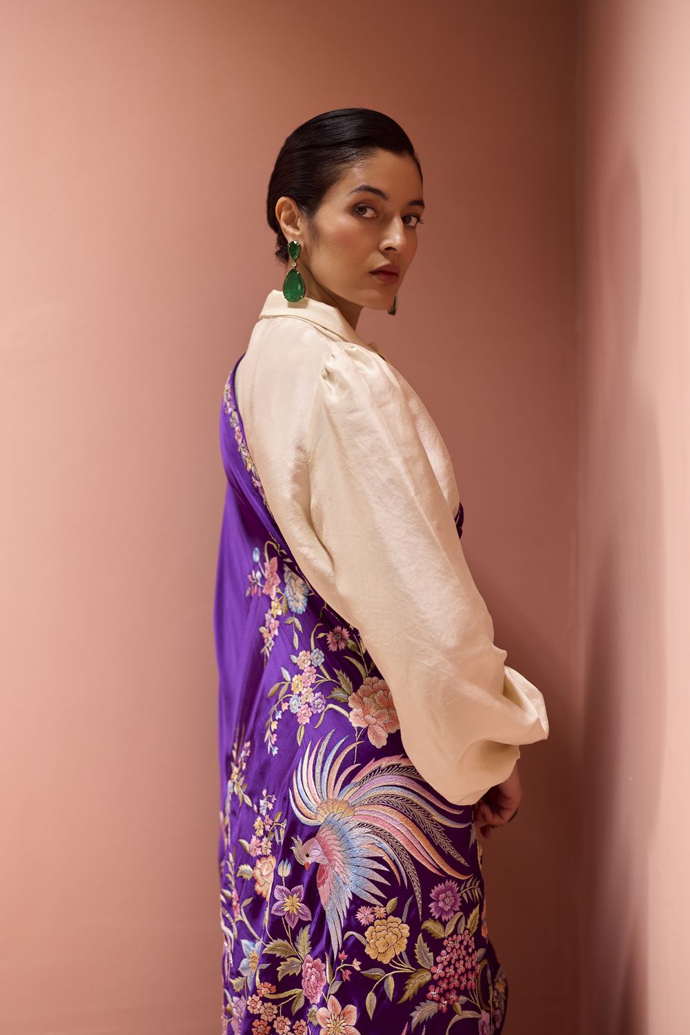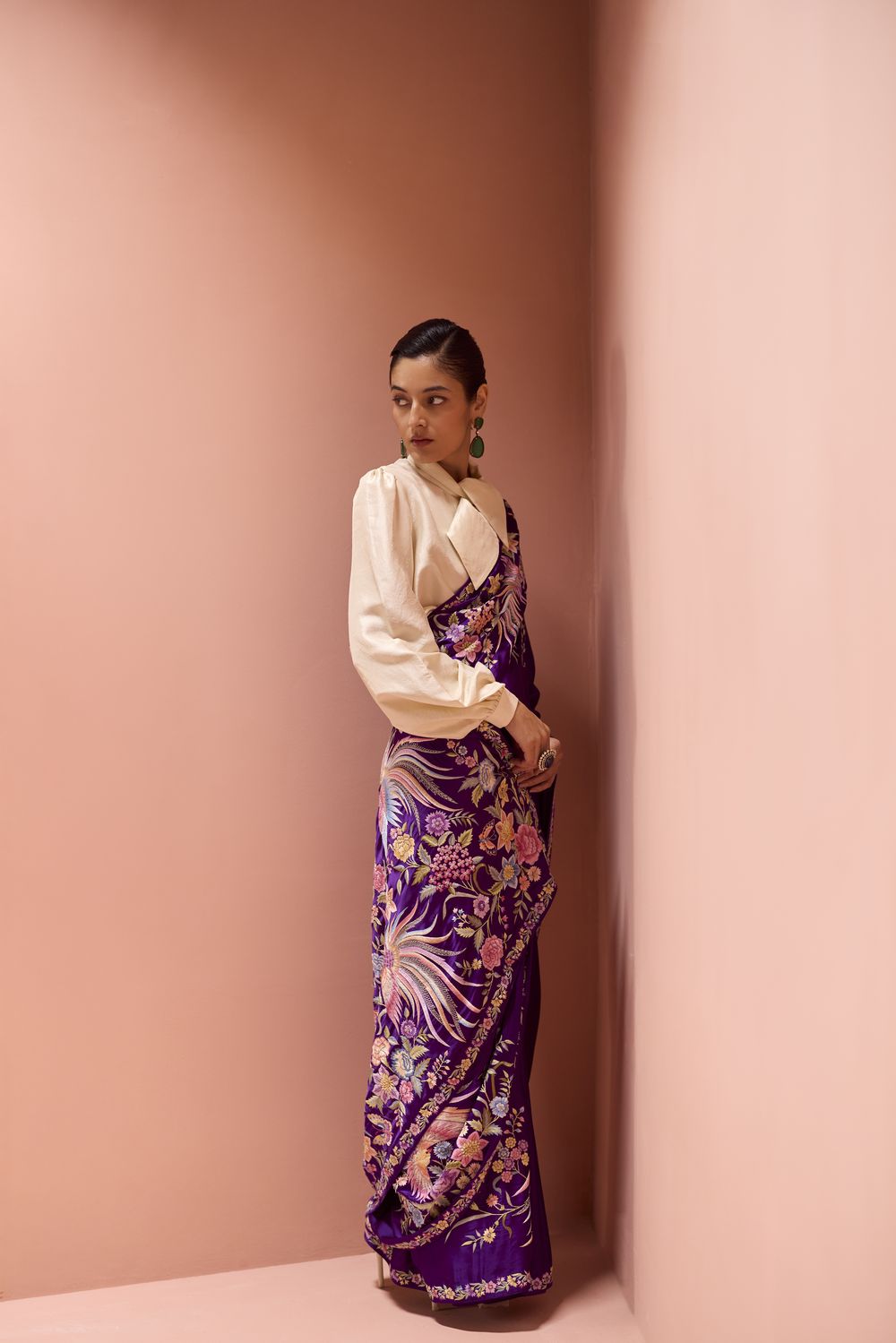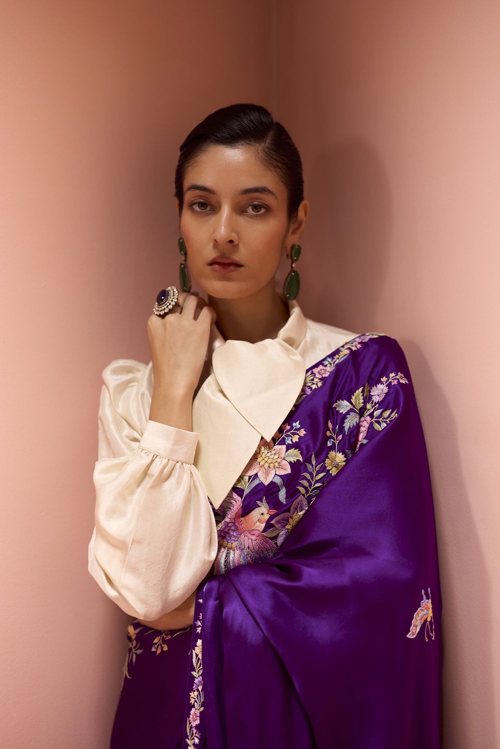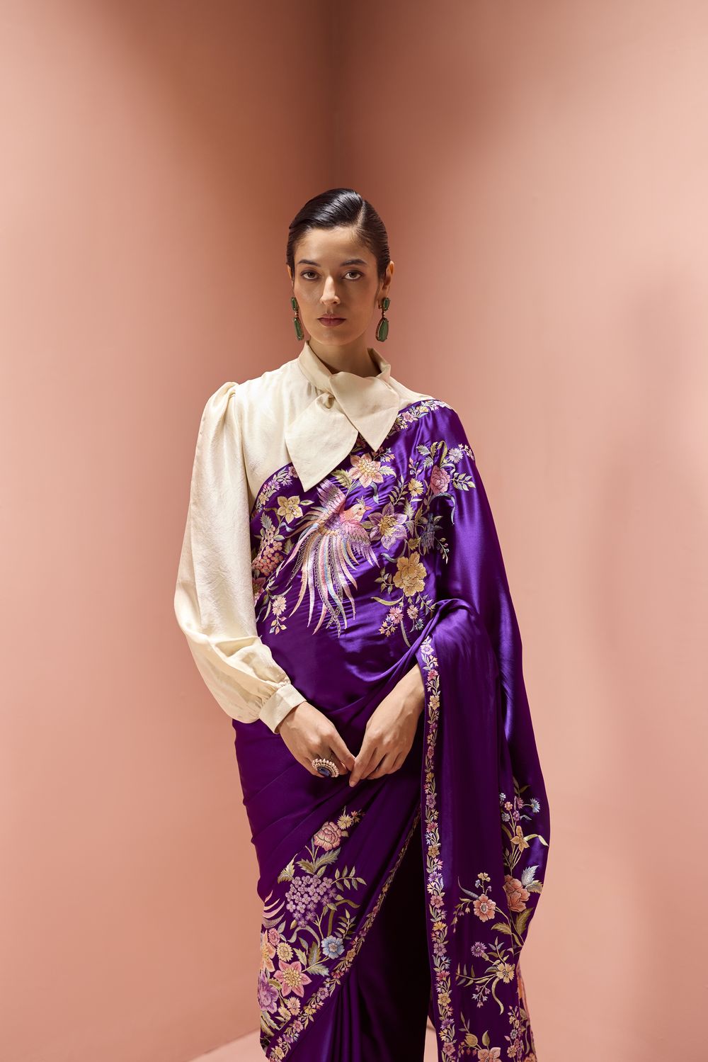 In the pursuit of any art form, you arrive at a point where elegance crosses over to mastery. We love to push our aesthetic and craft to that fine point where the balance is just right. Our Alice saree in a lush shade of amethyst adorned with pastel birds of paradise and florals is a good example. A subtle sheen that lands gently on the heart.