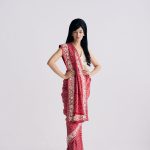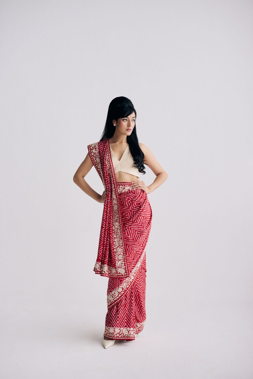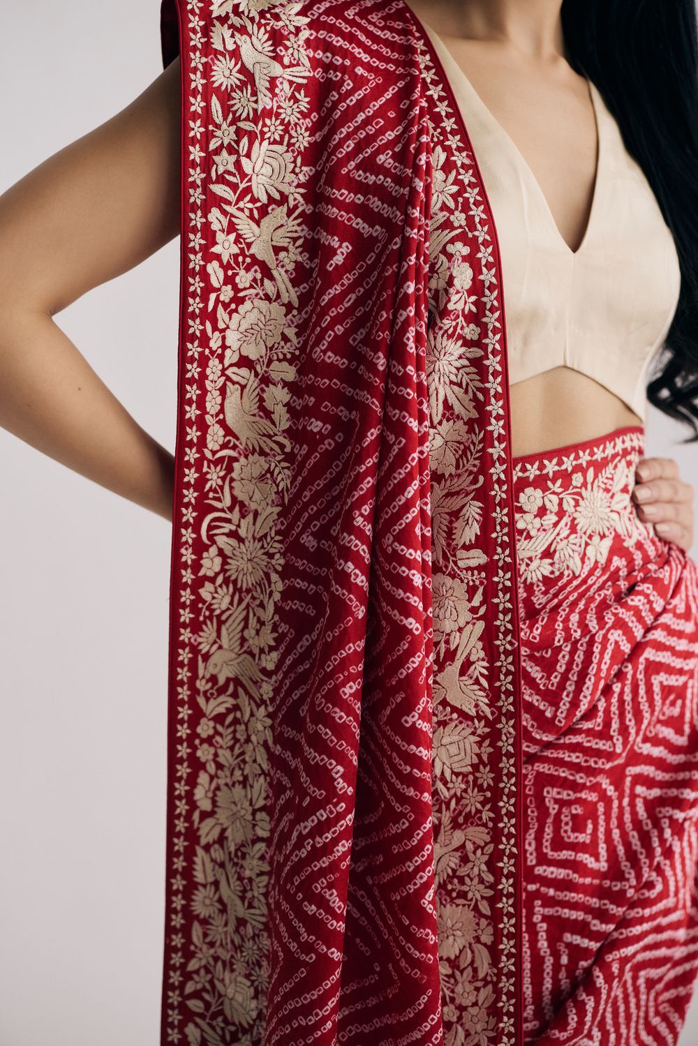 The Asha sari features delicate bandhani dots arranged in leheriya-style geometric lines and a parsi gara border with flowers & birds.