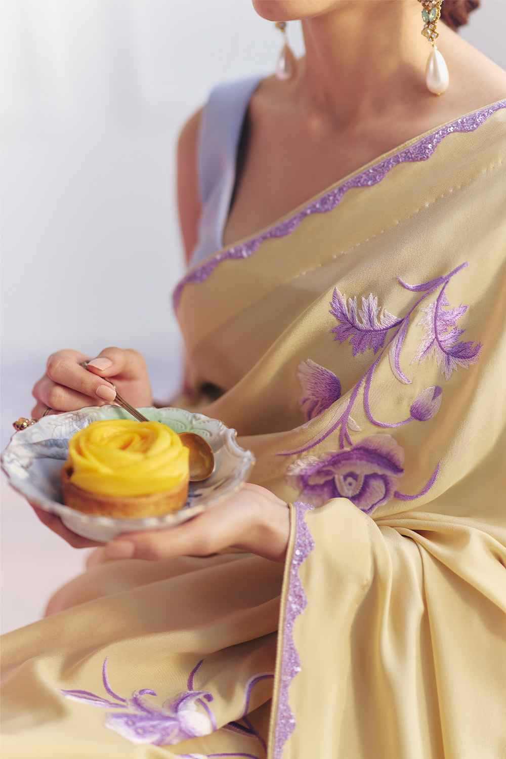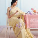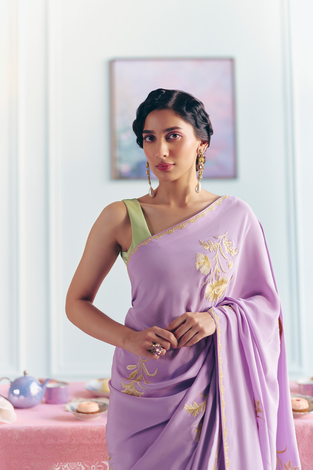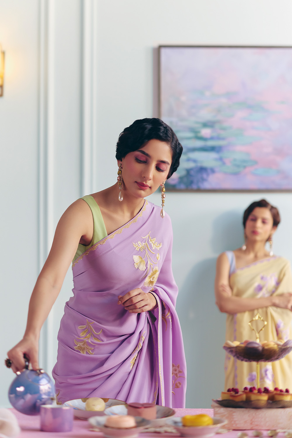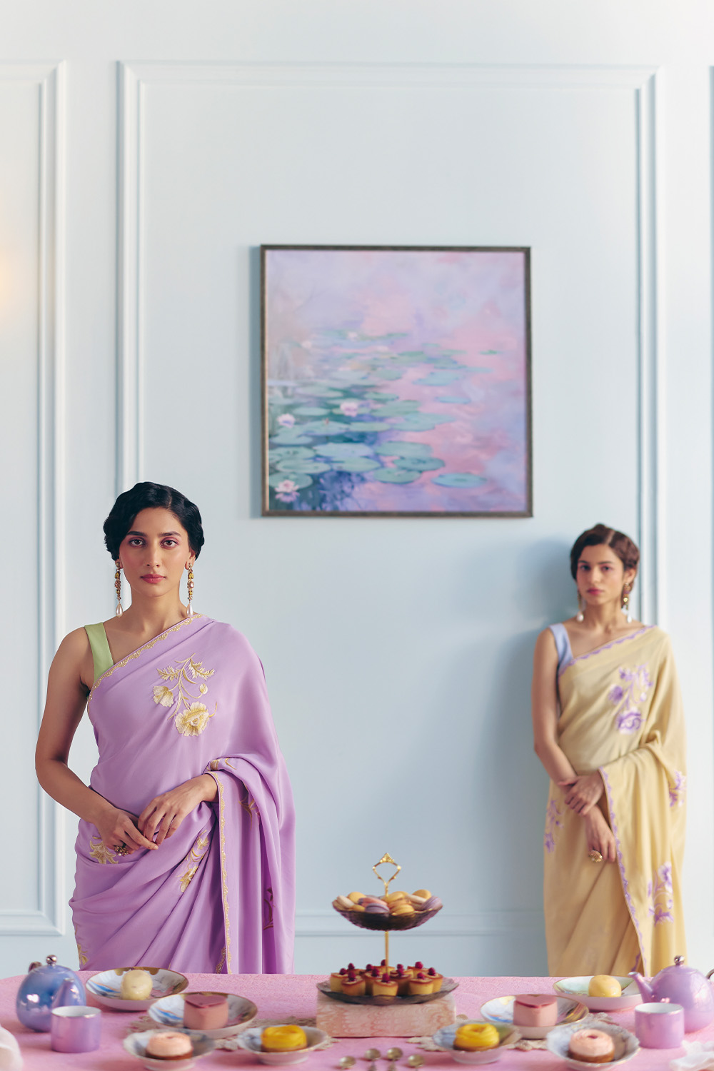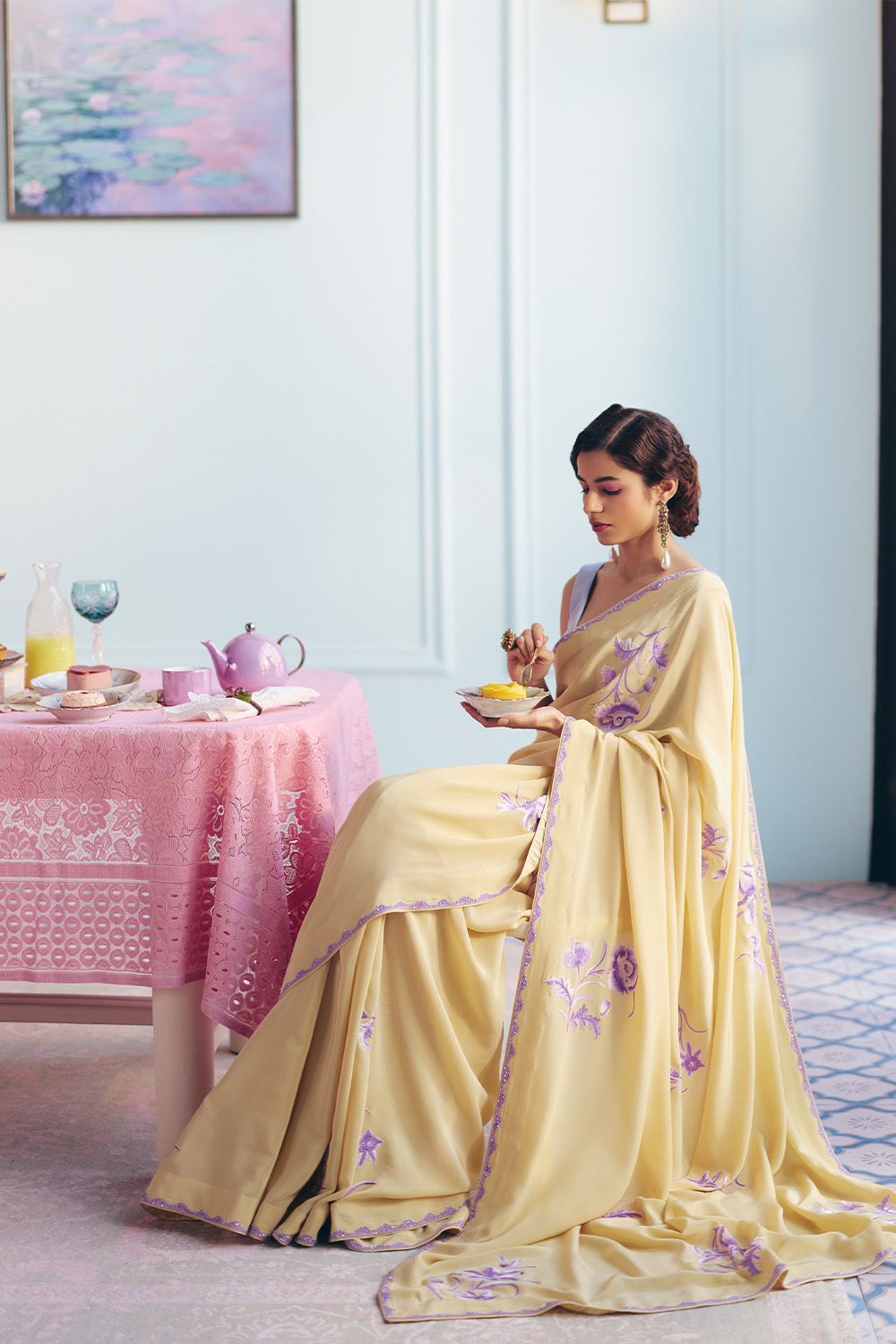 Our buttery soft Pineapple crepe ‘Bridgette’ sari is decorated with delicate florals hand-embroidered in a contrasting Iris shade. Style it simply with a strappy blouse, plus your favourite danglers and you’re all set.