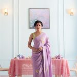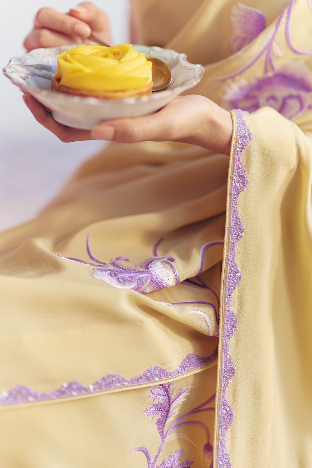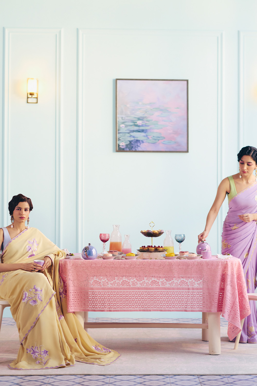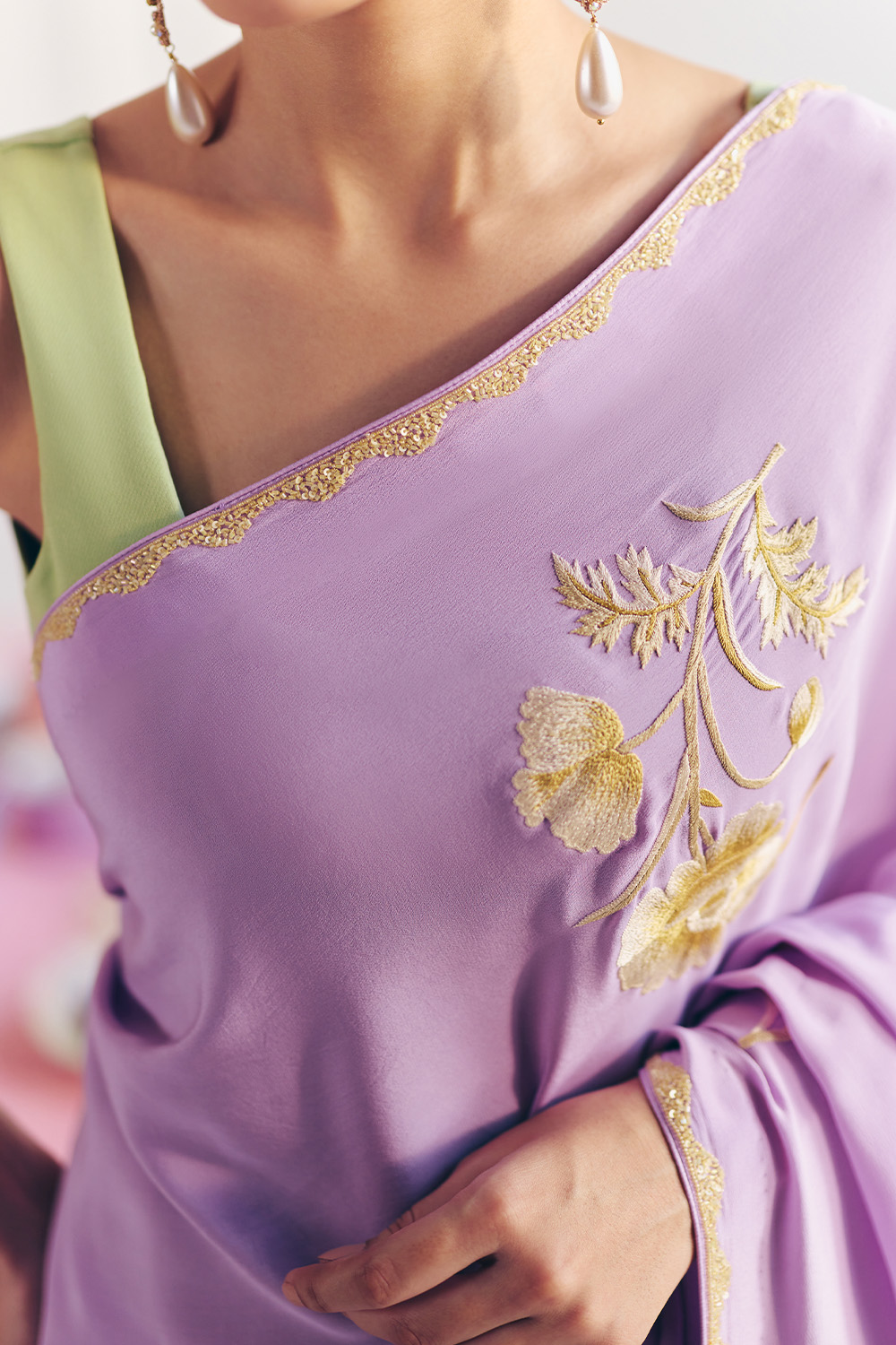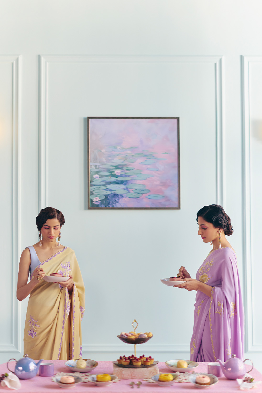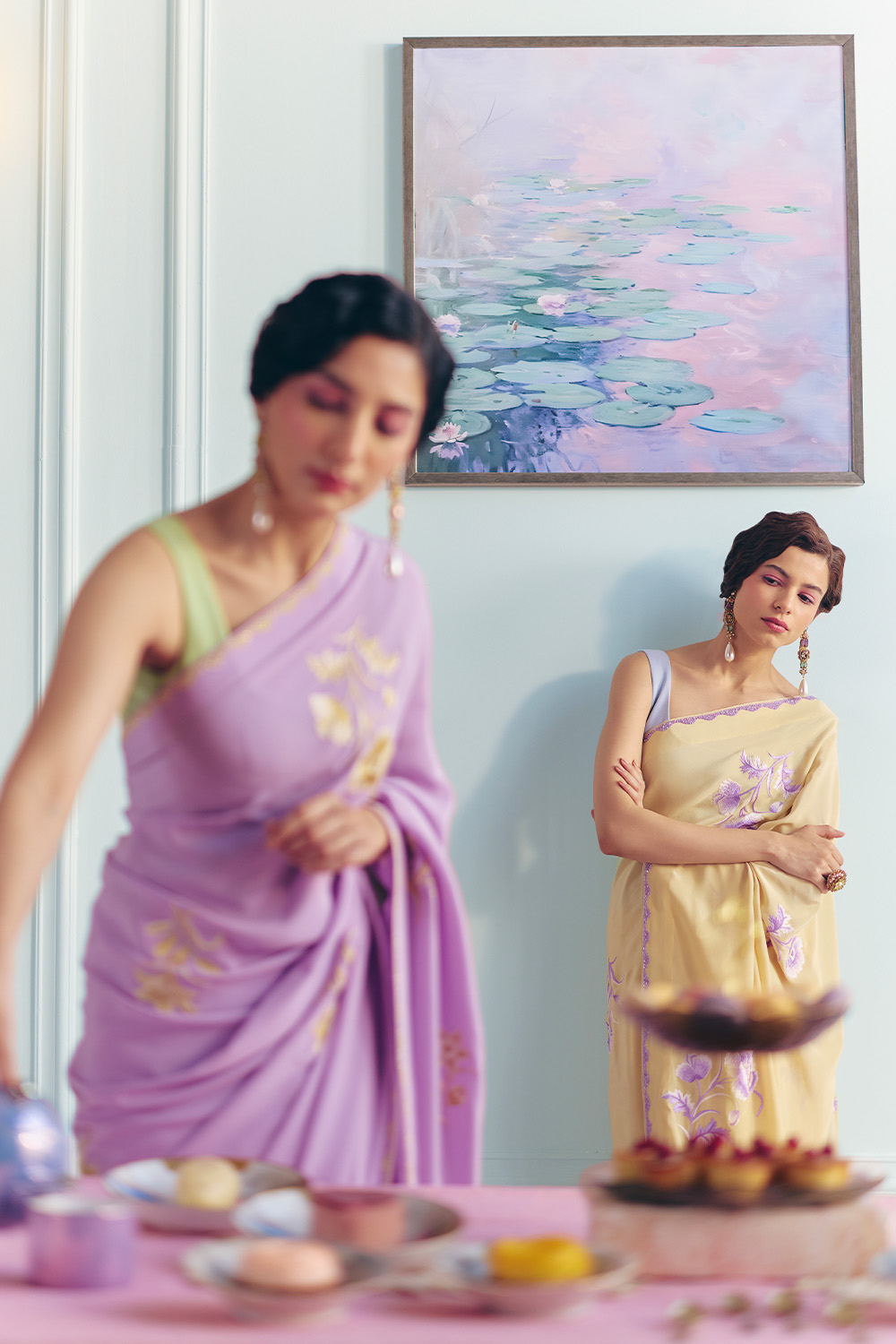 Our buttery soft Pineapple crepe ‘Bridgette’ sari is decorated with delicate florals hand-embroidered in a contrasting Iris shade. Style it simply with a strappy blouse, plus your favourite danglers and you’re all set.
