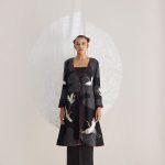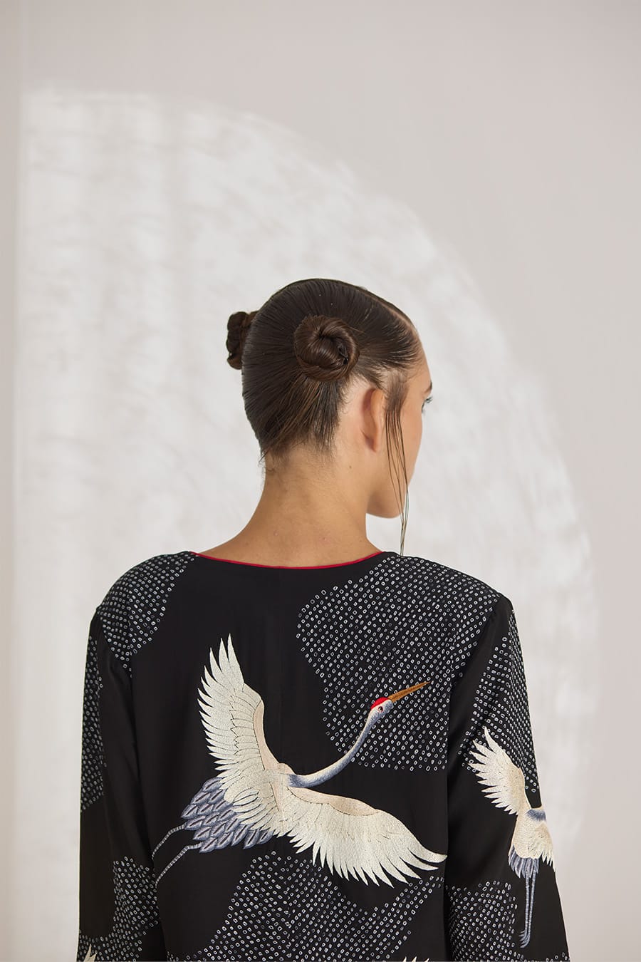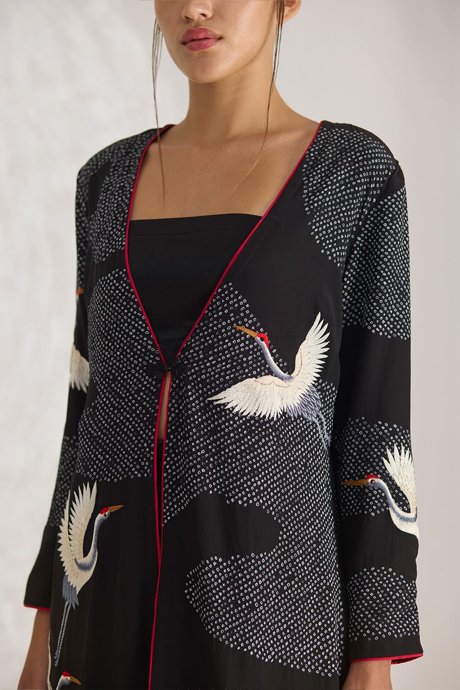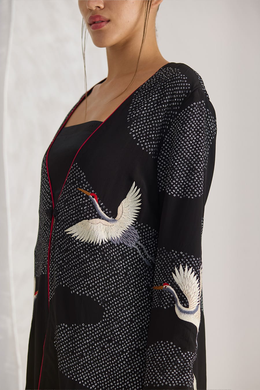 Say hello to our ‘Crane’ jacket in classic ebony. The longline cut and soft fabric make it perfectly suited for day and night. Hand embroidered cranes are in flight over organic patterns formed by bandhani dots.
