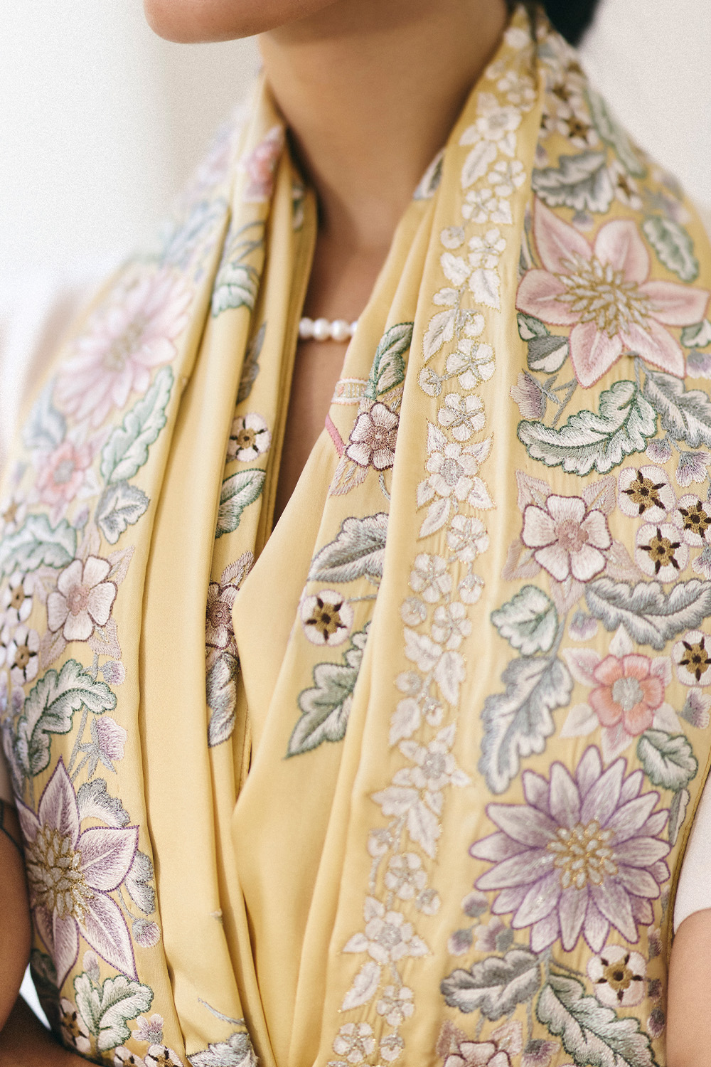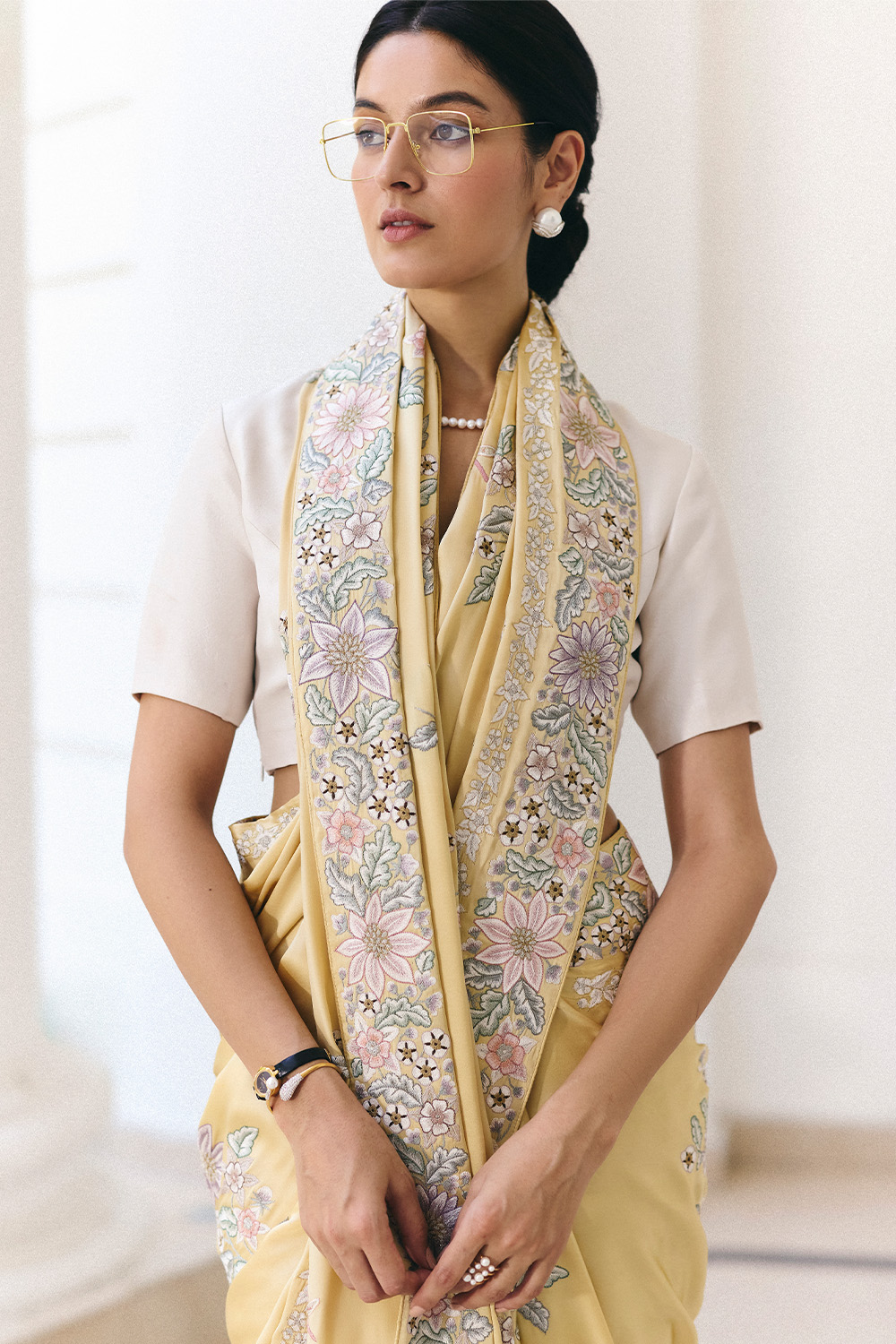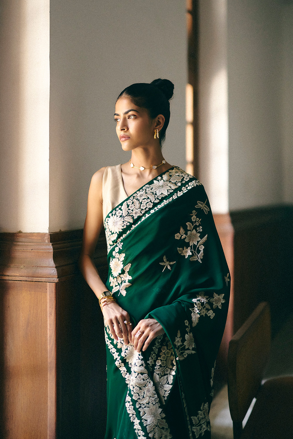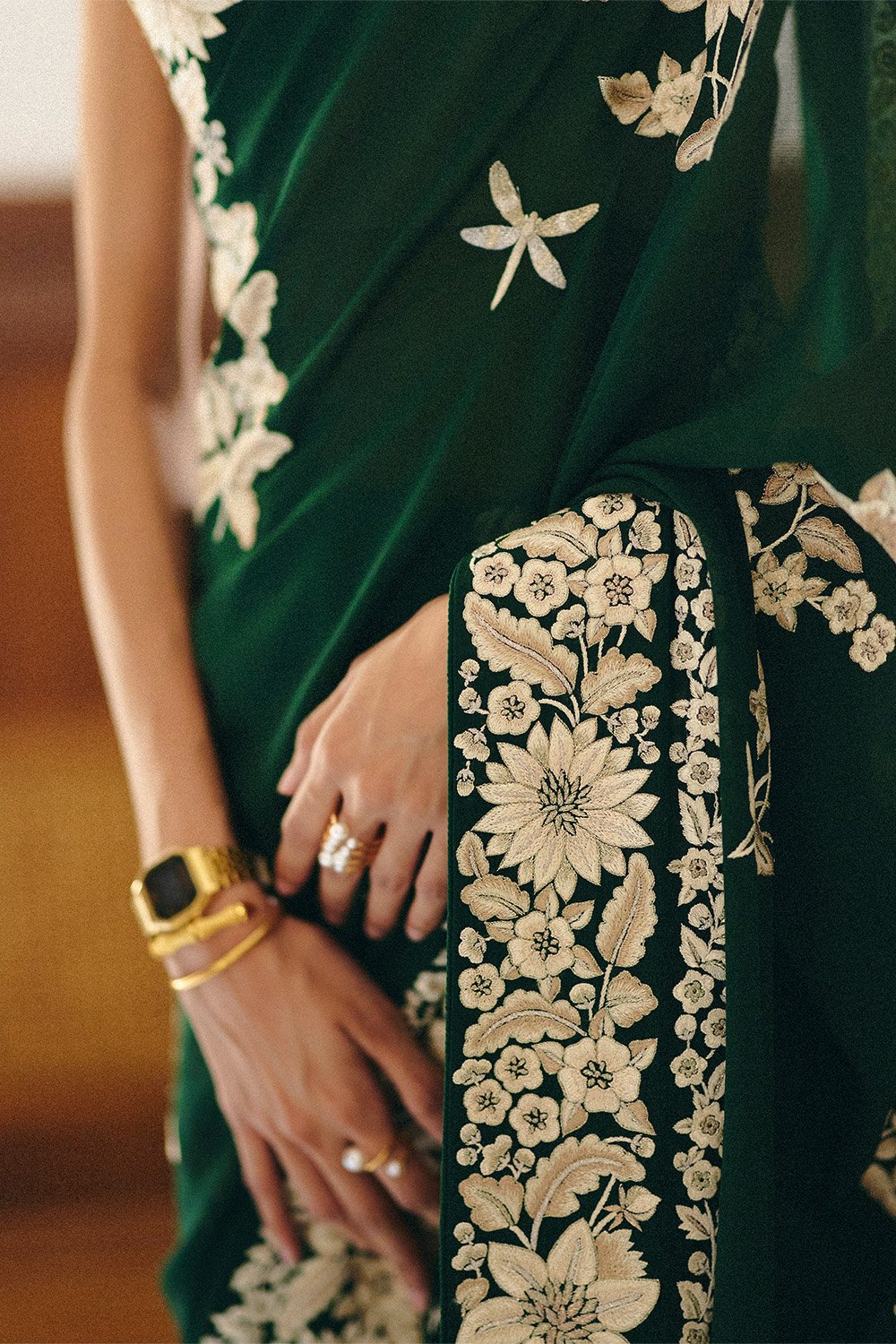 Our Damselfly sari in Fern Green georgette from our latest ‘Wildflowers’ collection features damselflies and blooms framed by a rich floral border. All hand-embroidered at our atelier in glorious shades of off white, cream, beige, silver & gold.