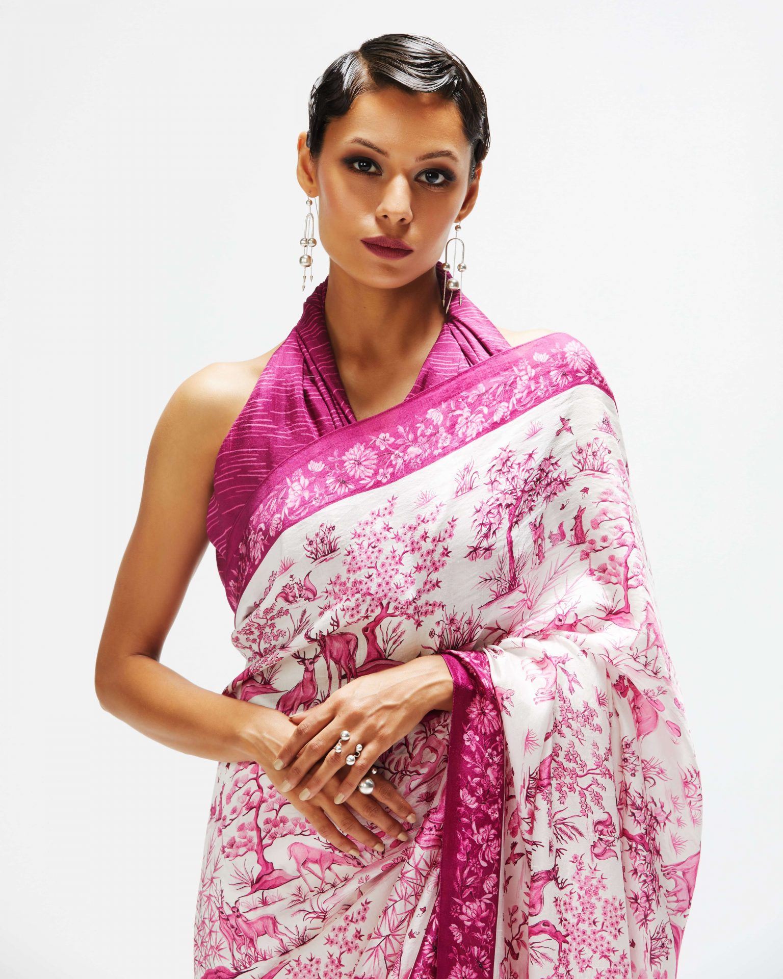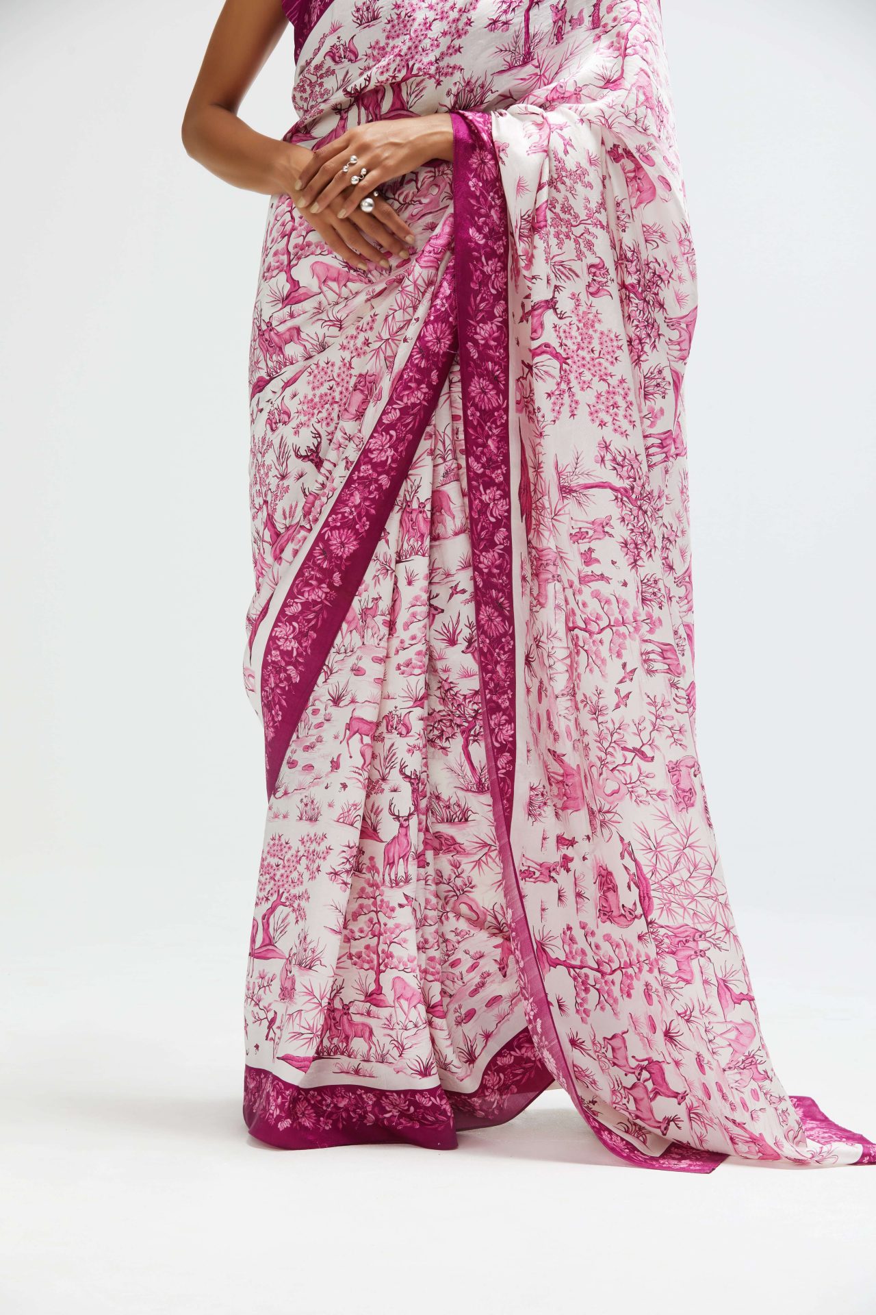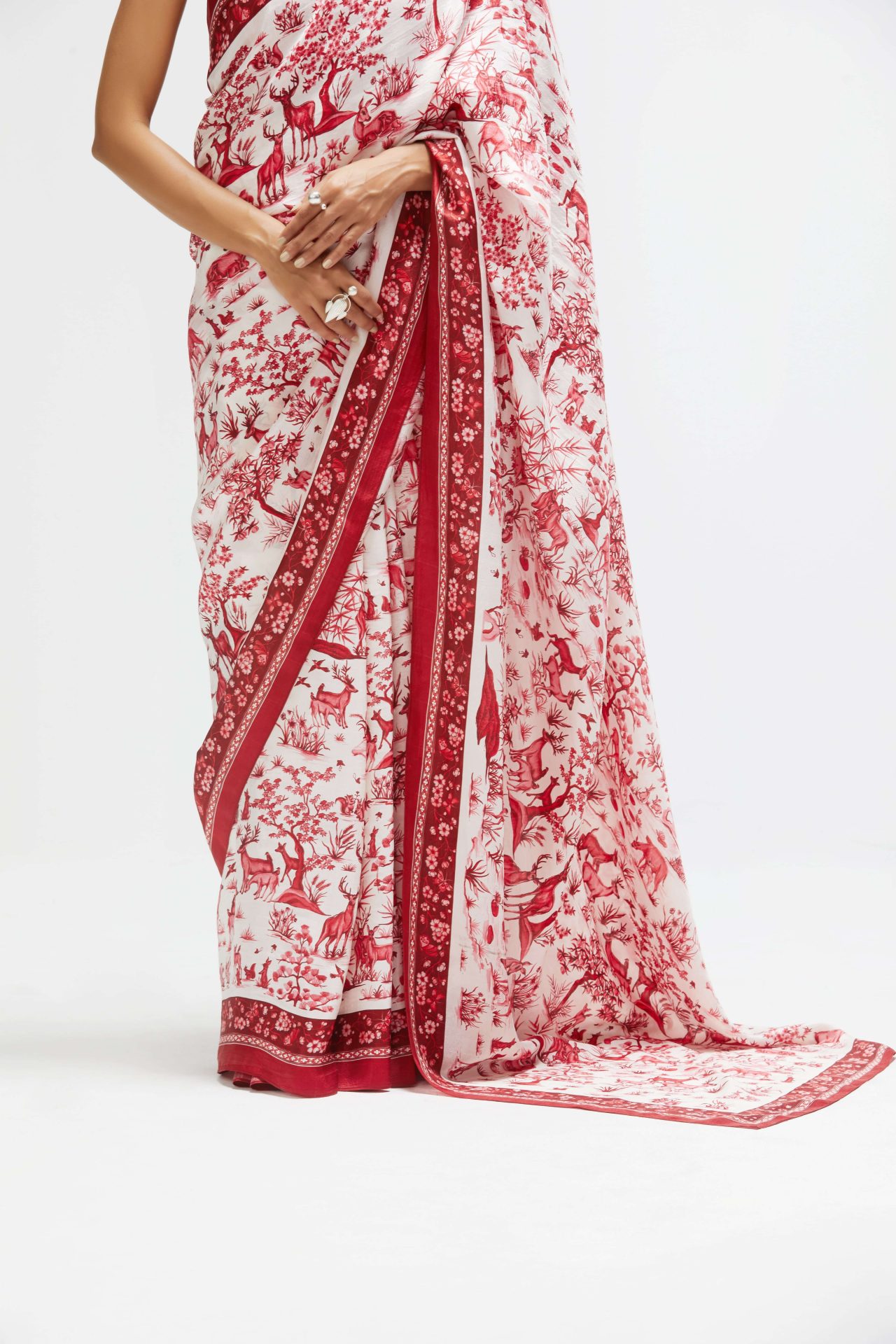 Ballerina Ritika Chandra’s expansive movements meet the fantastical ‘Eden’ sari in a classic white and red colour way from Rhythm & Blues- our Summer 2022 print collection