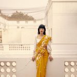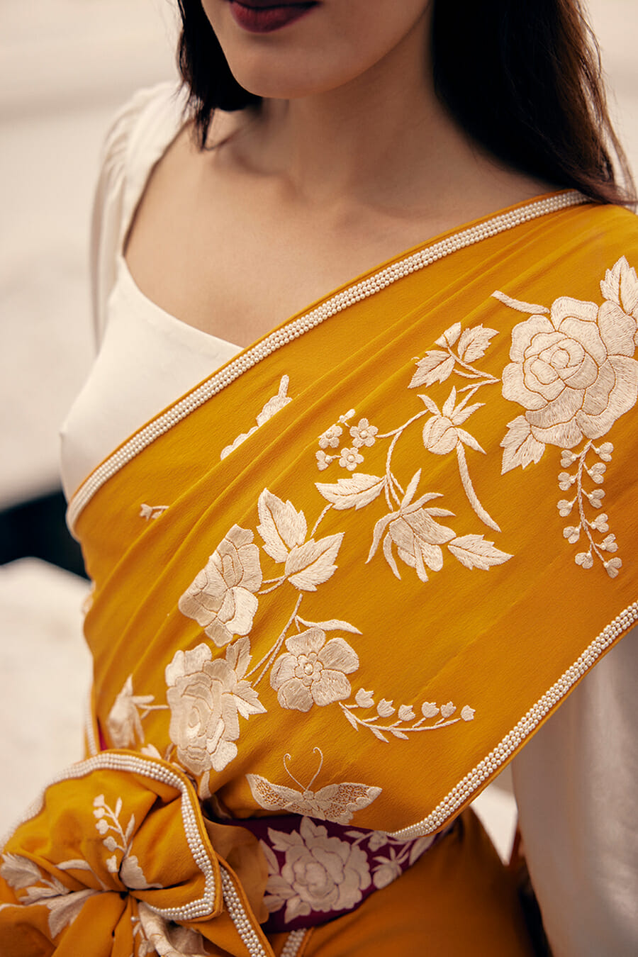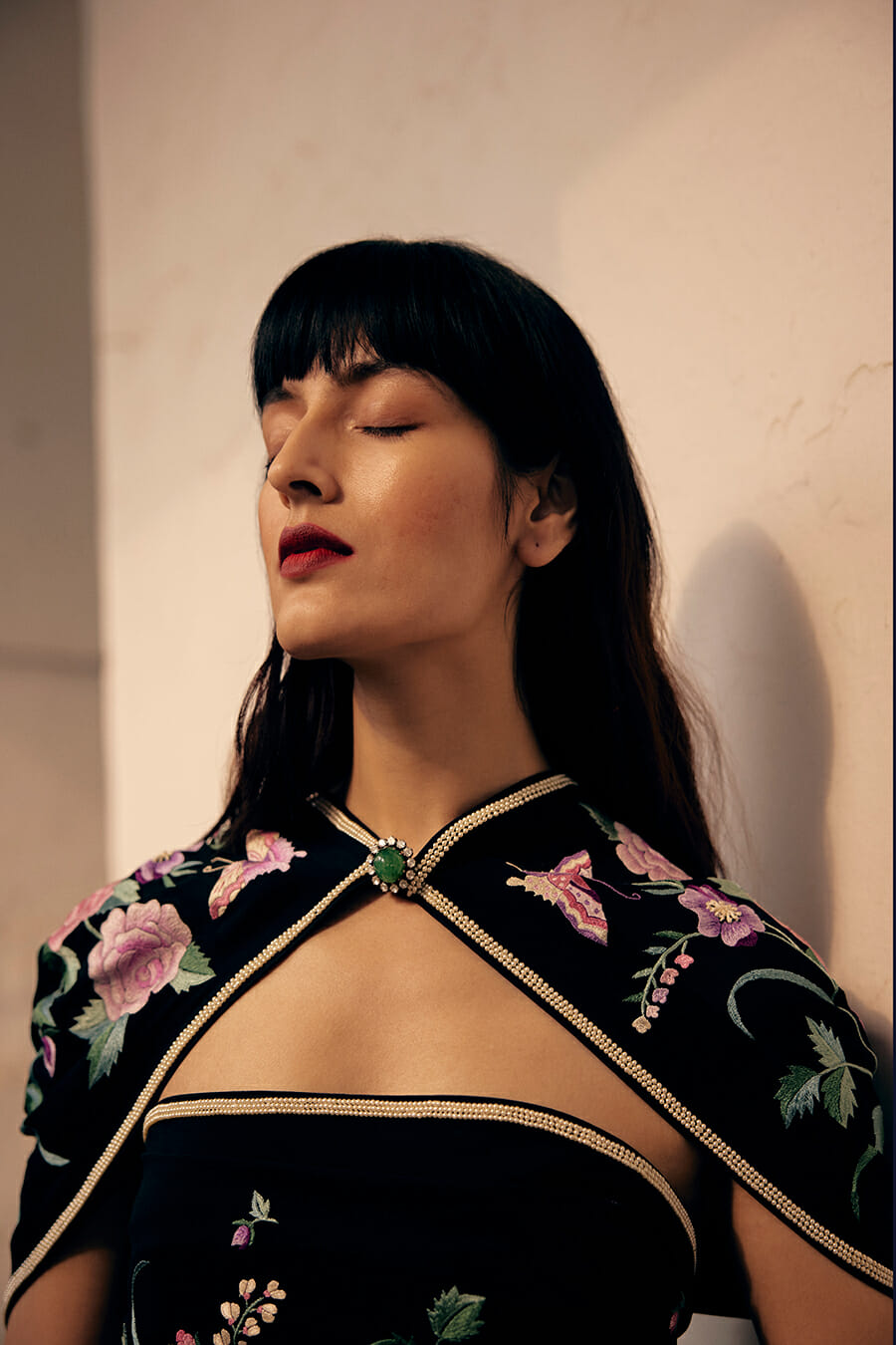 If there’s one sari that encapsulates the spirit of our spring 2023 collection, it’s got to be the Evening Rose sari handcrafted in black crepe.