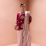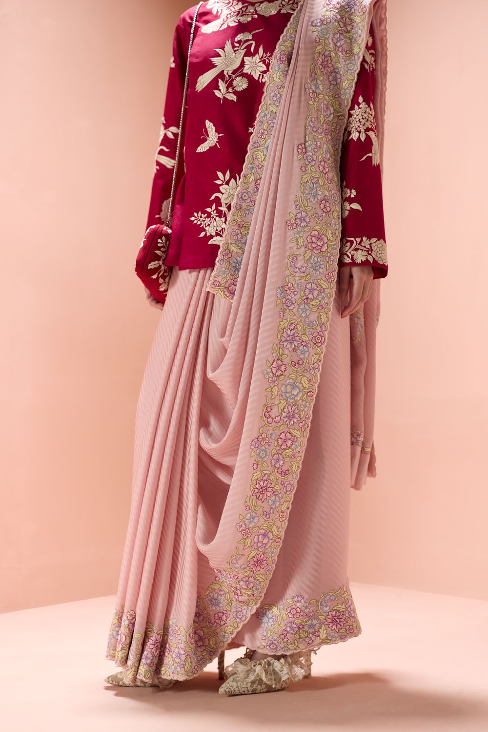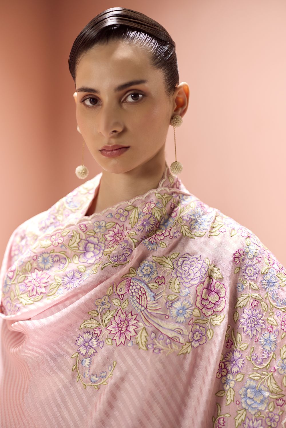 Our Freya saree features a broad scalloped floral border hand-embroidered delicately to give off the effect of lace. What could be lovelier than a bouquet of pastel blooms on a rose quartz backdrop with a subtle striped pattern.