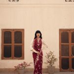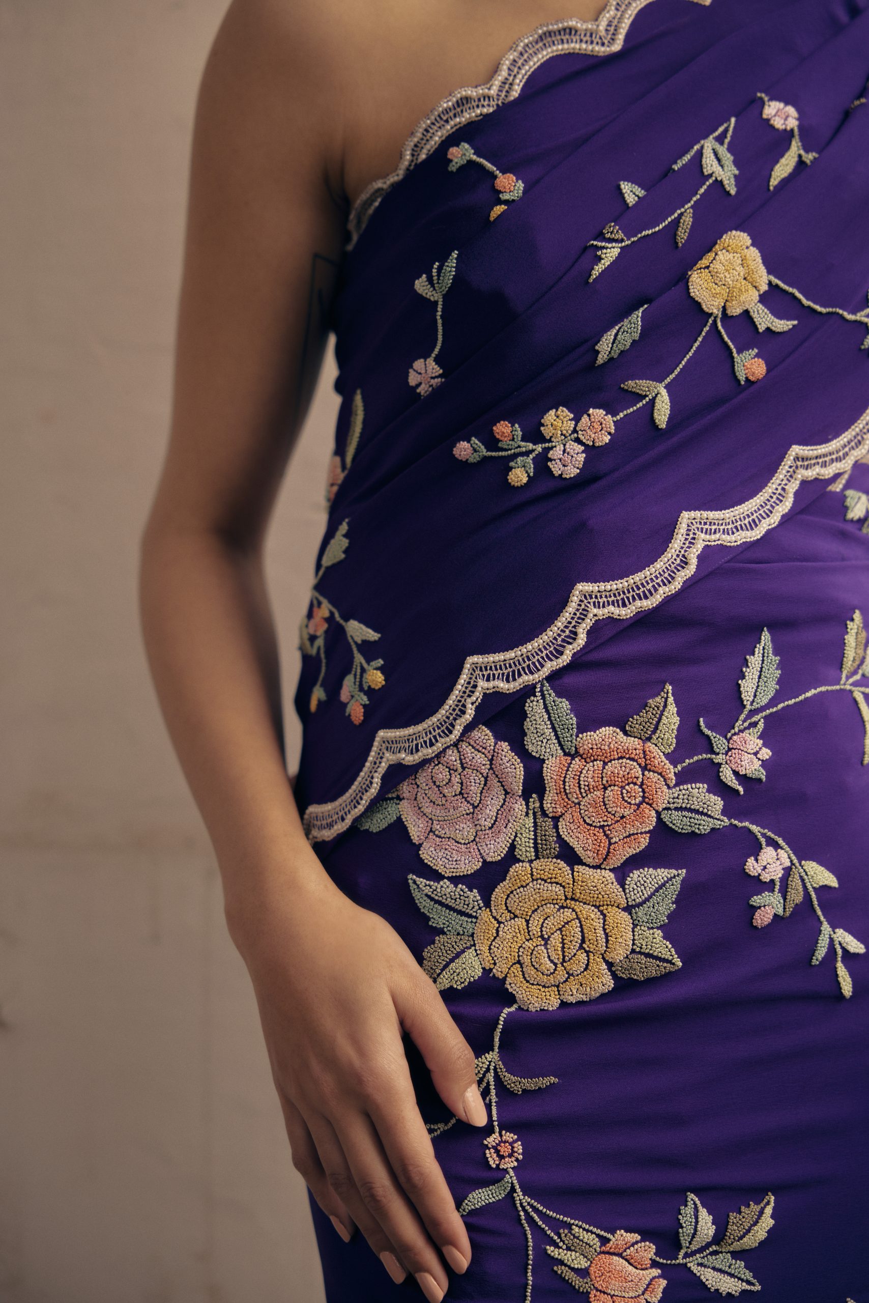 The sari features delightful pastel rose compositions across the body and tiny roses lined up along the border.