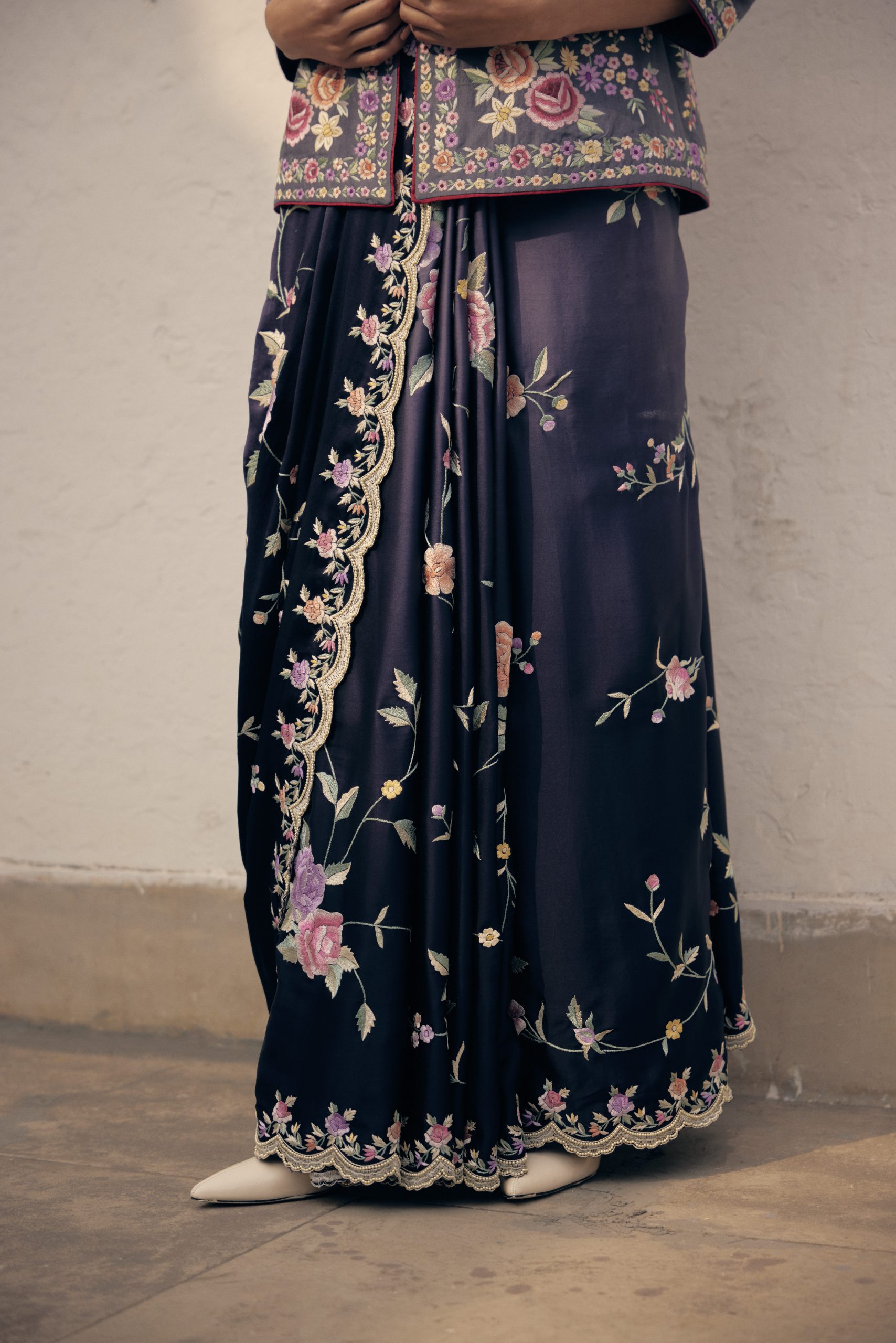 Our scallop-edged Gulshan Jaal sari, is handcrafted in satine in the most sublime sand grey to midnight blue ombré.
