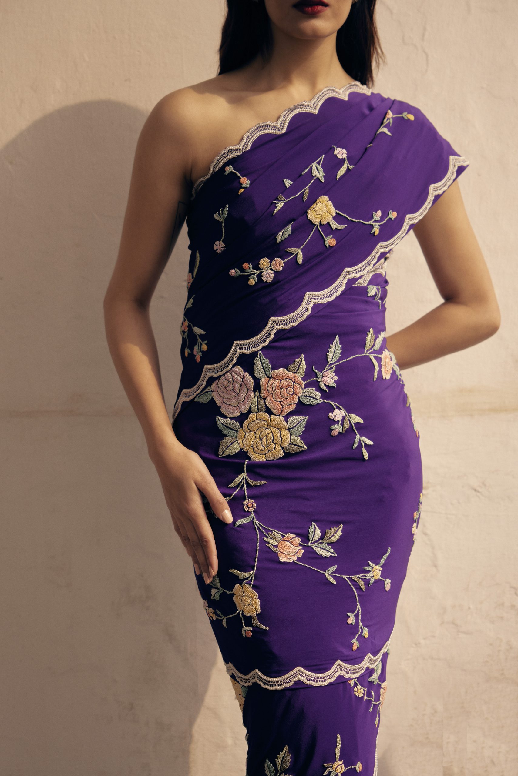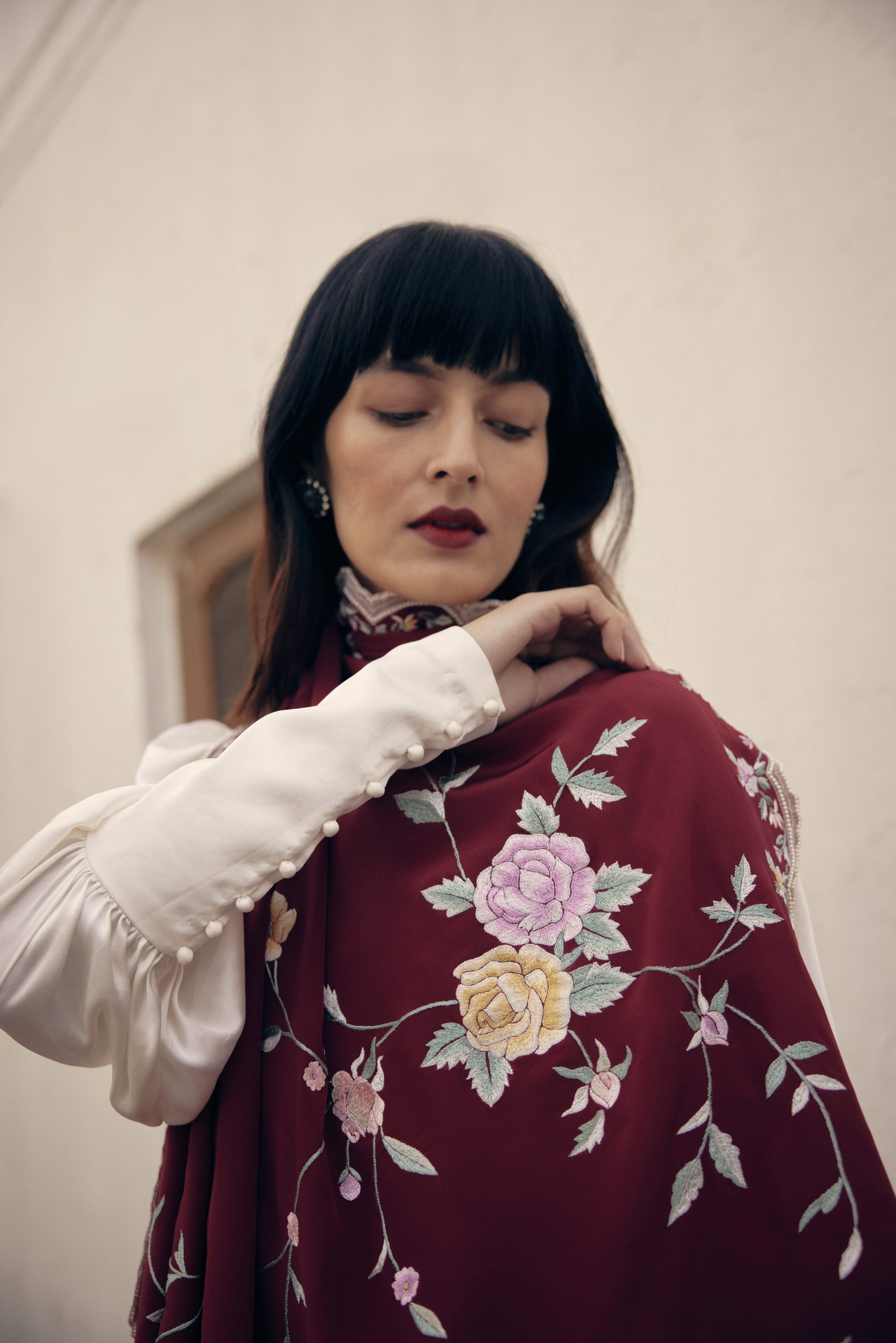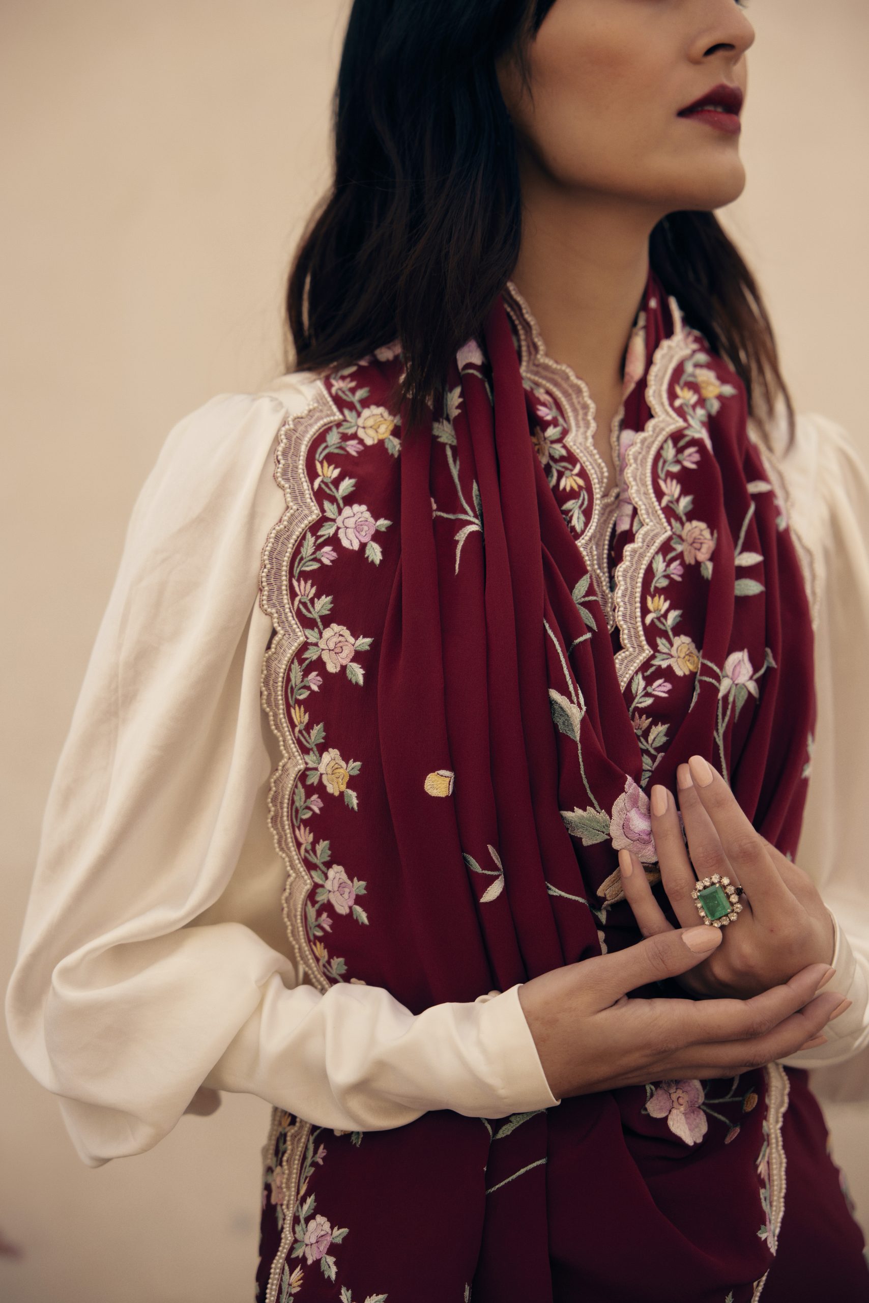 The subtle sheen on the material, the muted tones & the embroidery make it a great choice for both night & day.