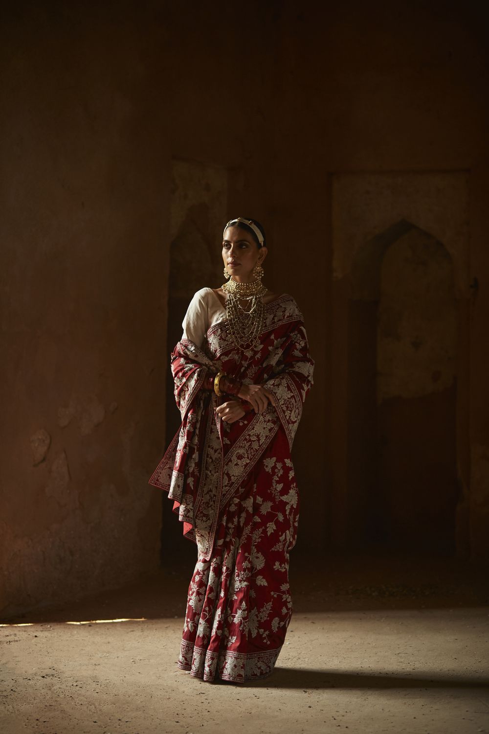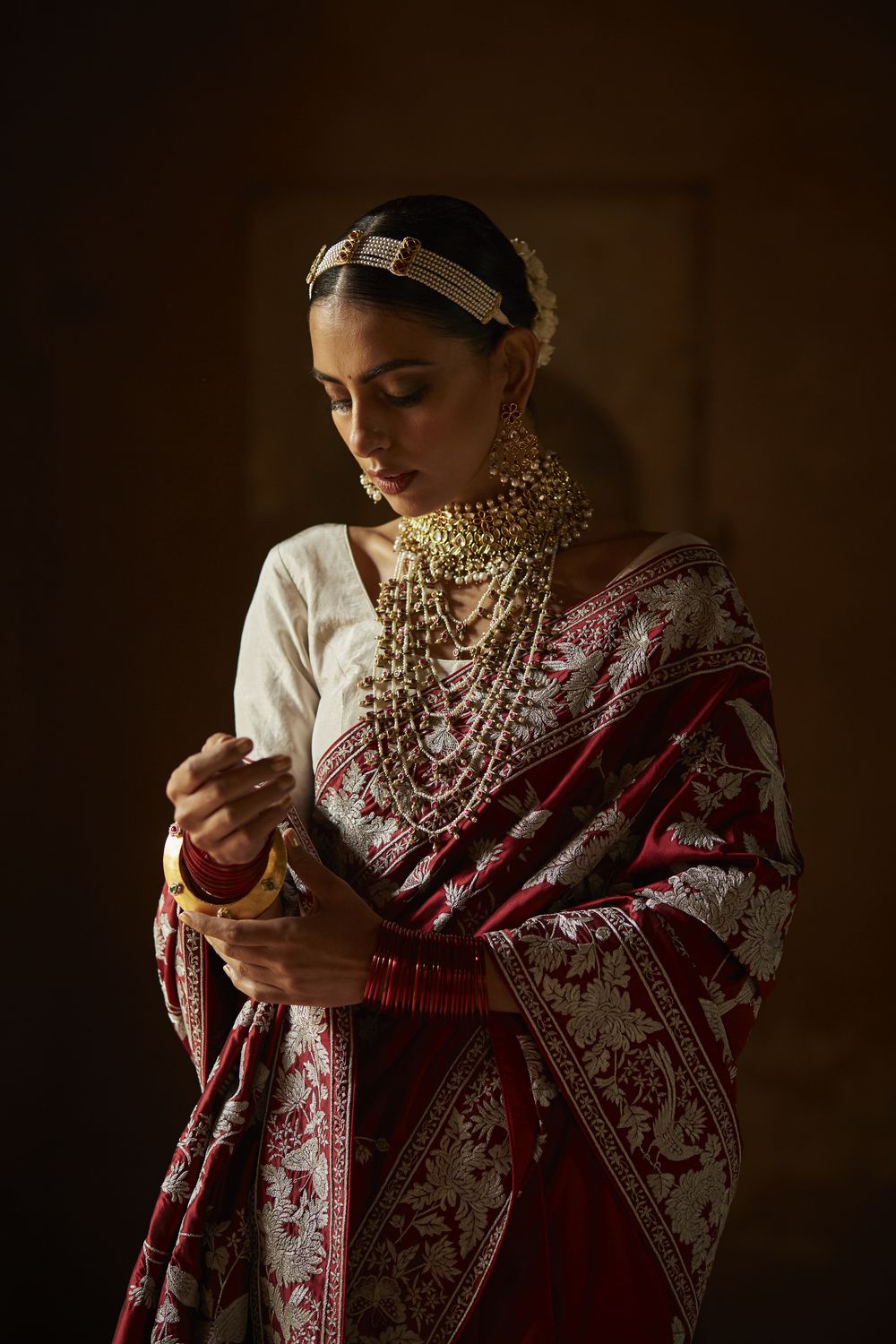 Here’s your favourite Kiku Jaal sari reimagined in a sumptuous लाल or red, perfect for today’s multicultural bride.