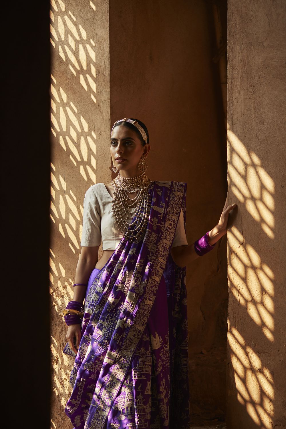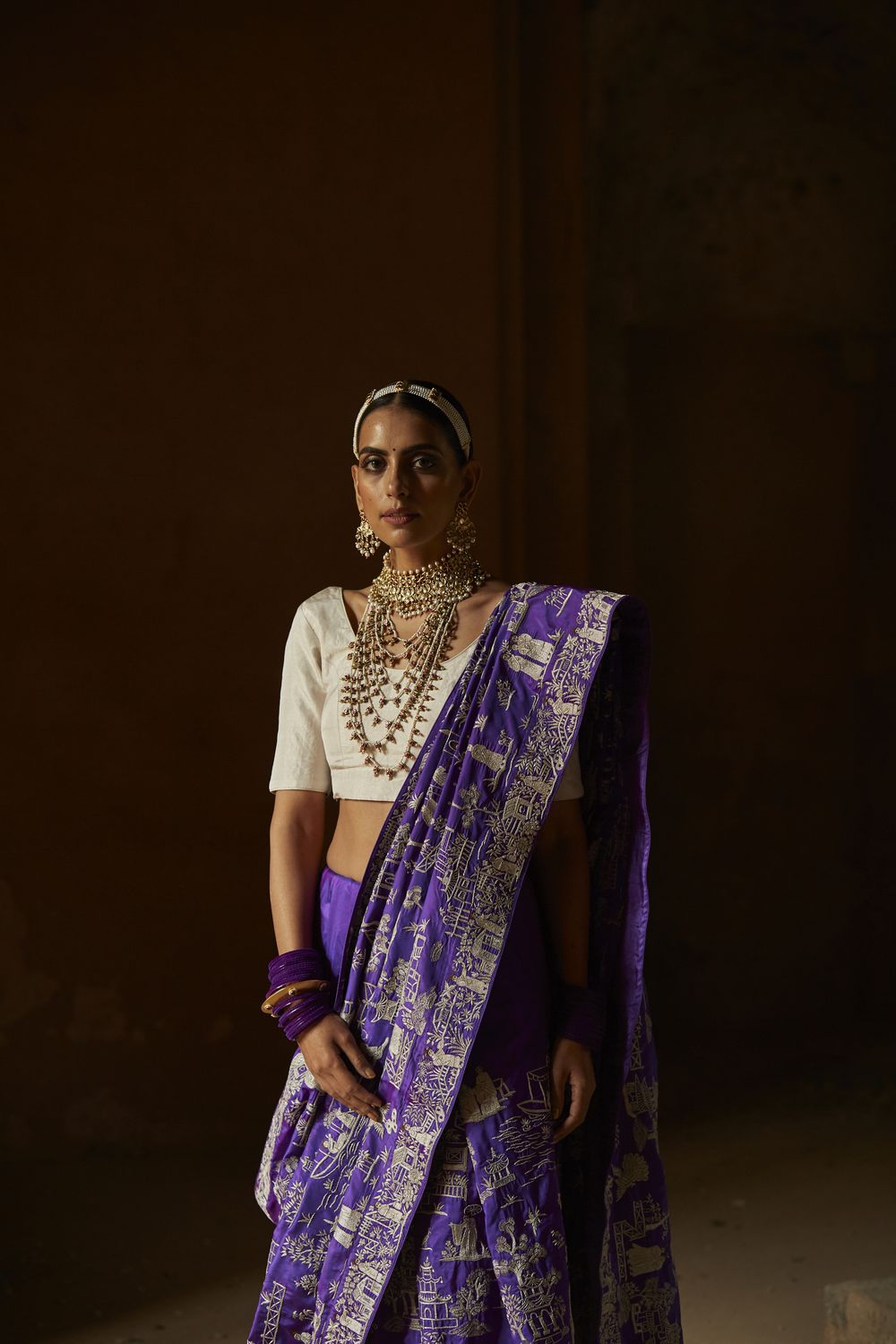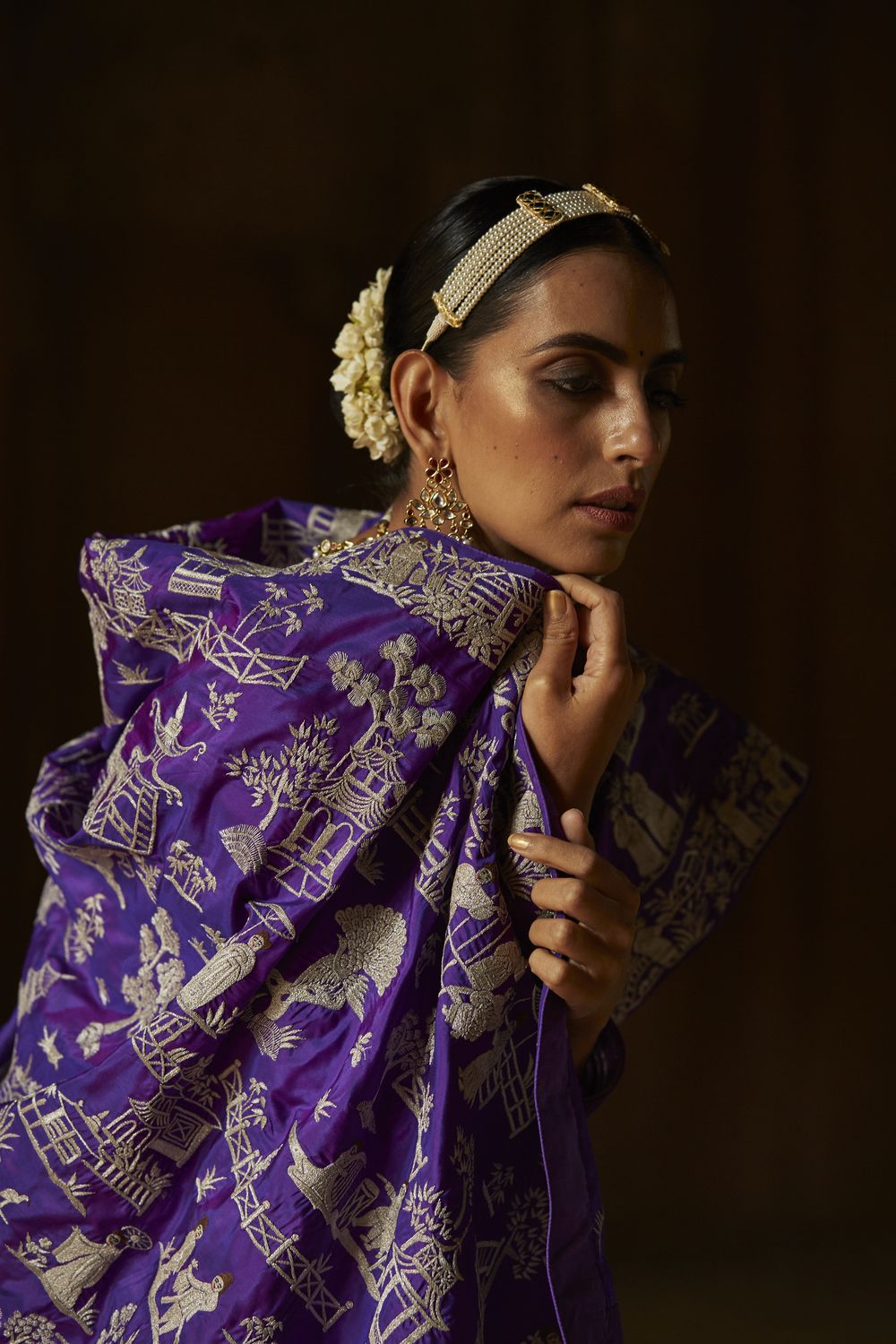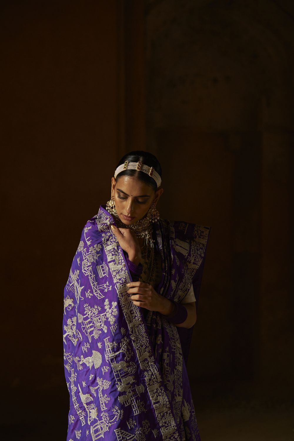 Meet our all-time-favourite Cheena Cheeni sari with the most astonishingly intricate embroidery story, in a new avatar, this time in royal purple or जामुनी रंग.