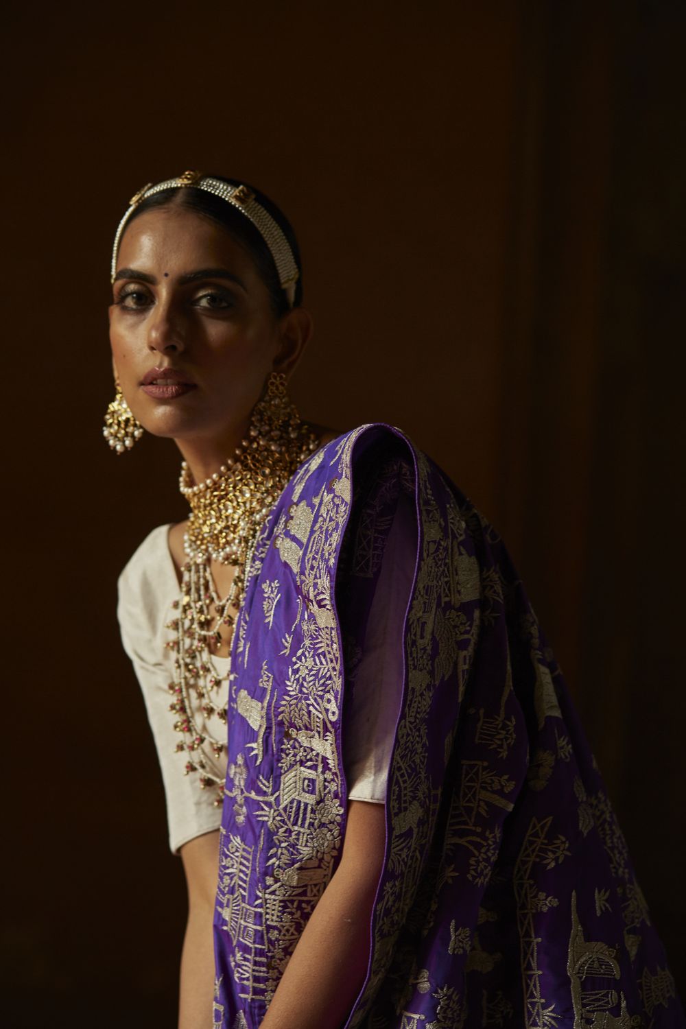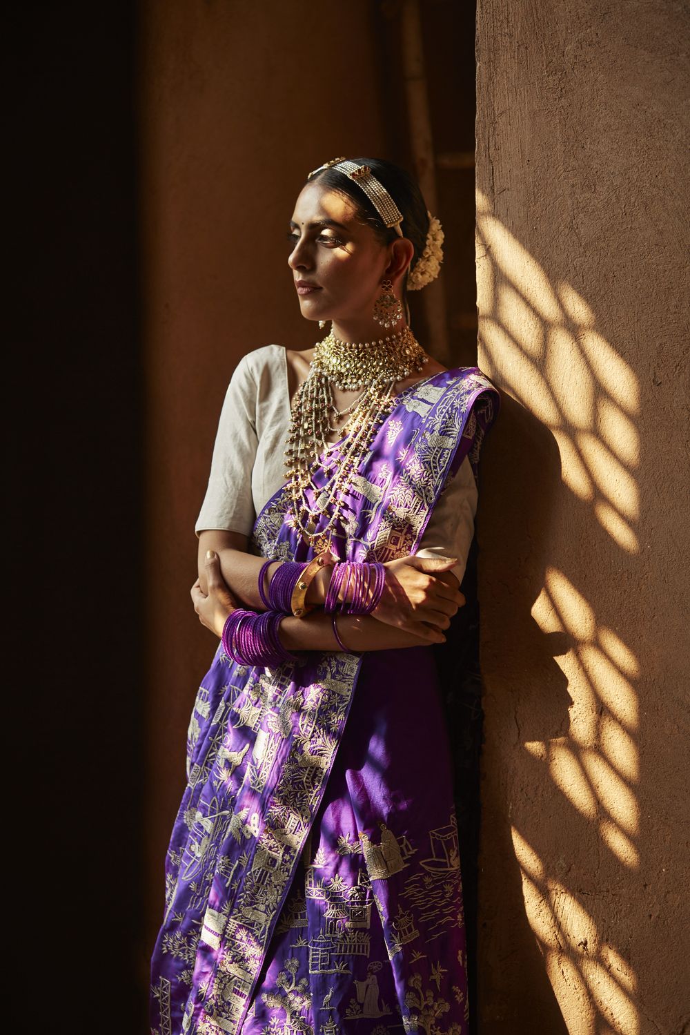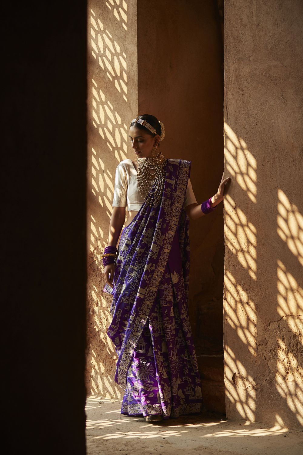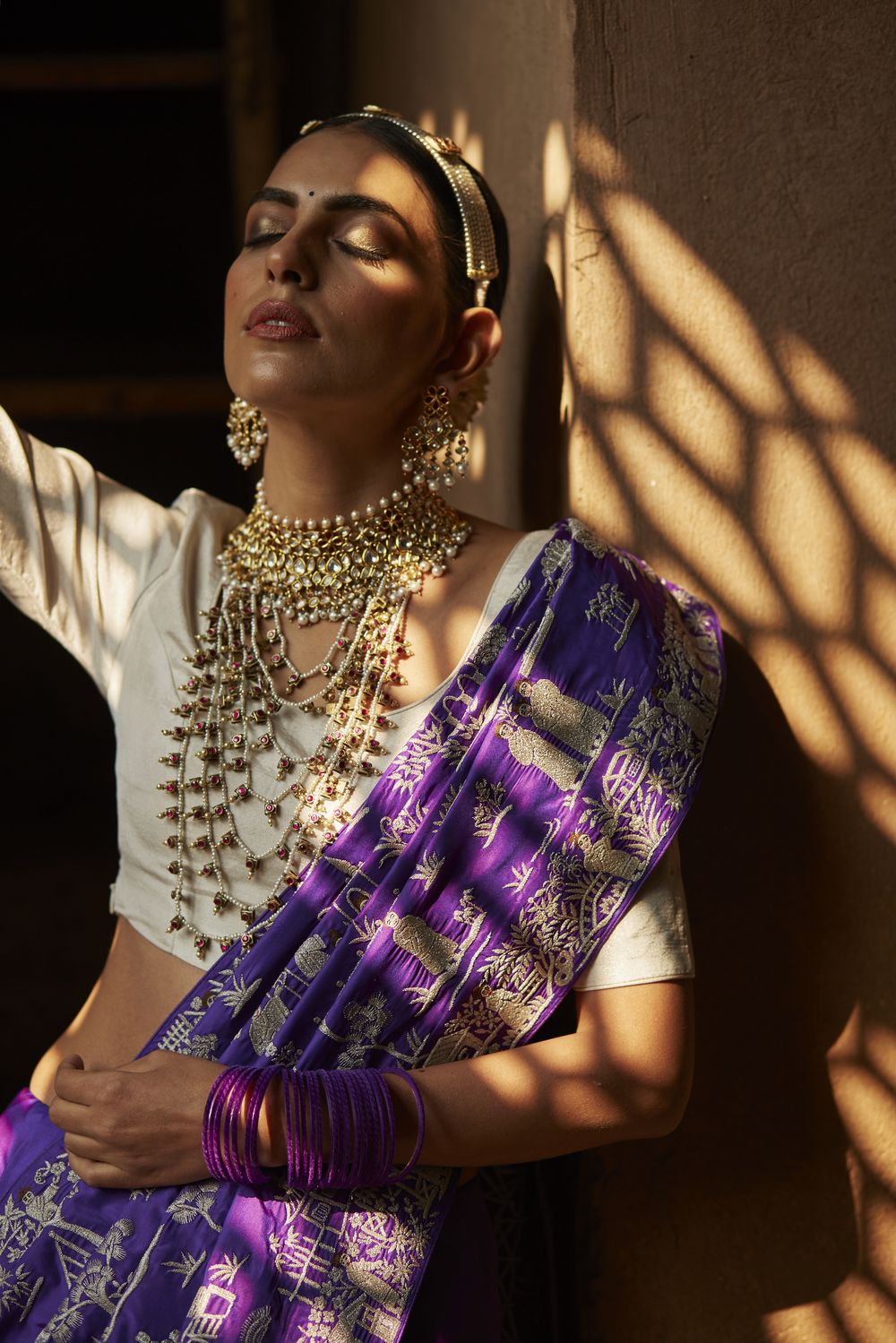 Meet our all-time-favourite Cheena Cheeni sari with the most astonishingly intricate embroidery story, in a new avatar, this time in royal purple or जामुनी रंग.