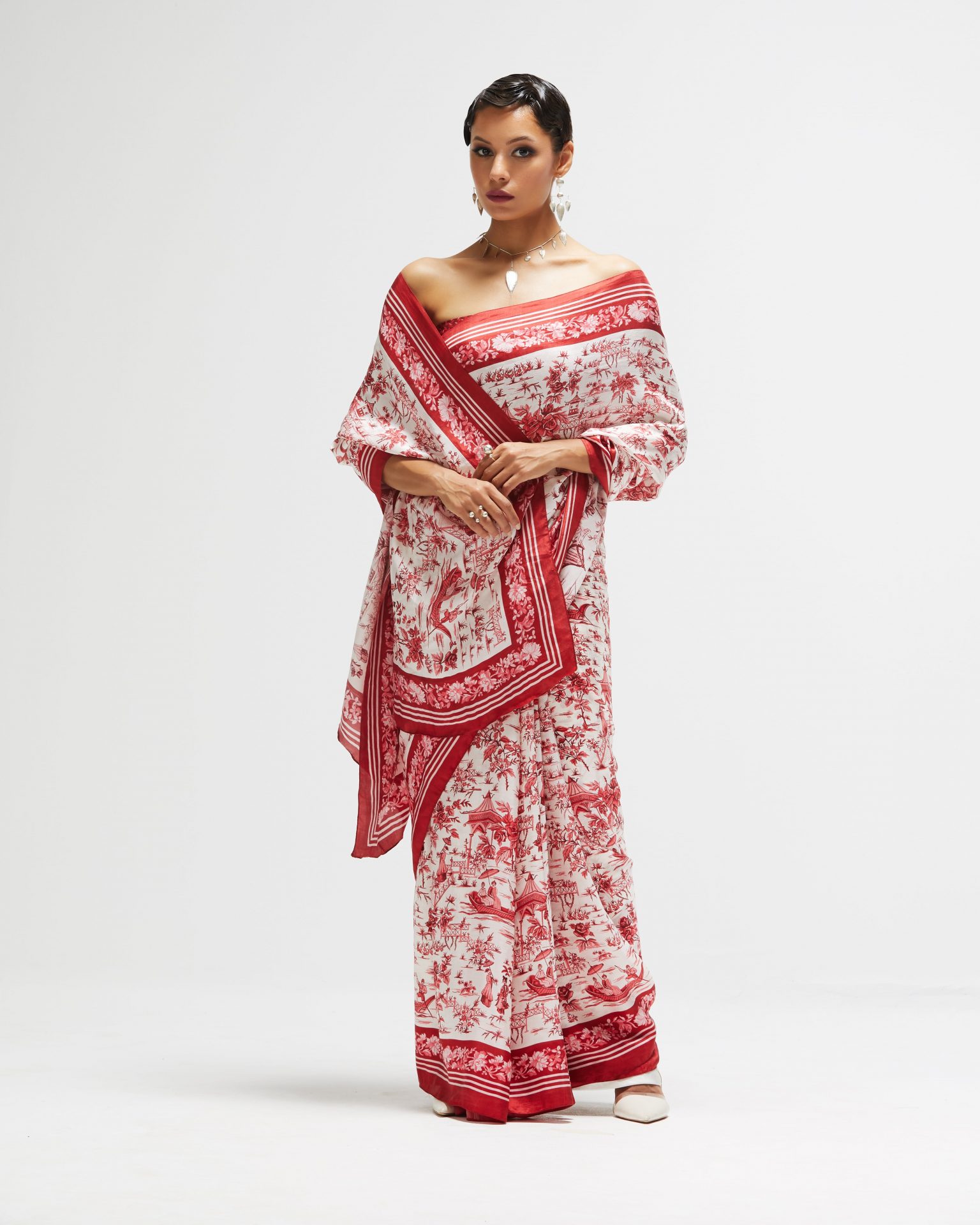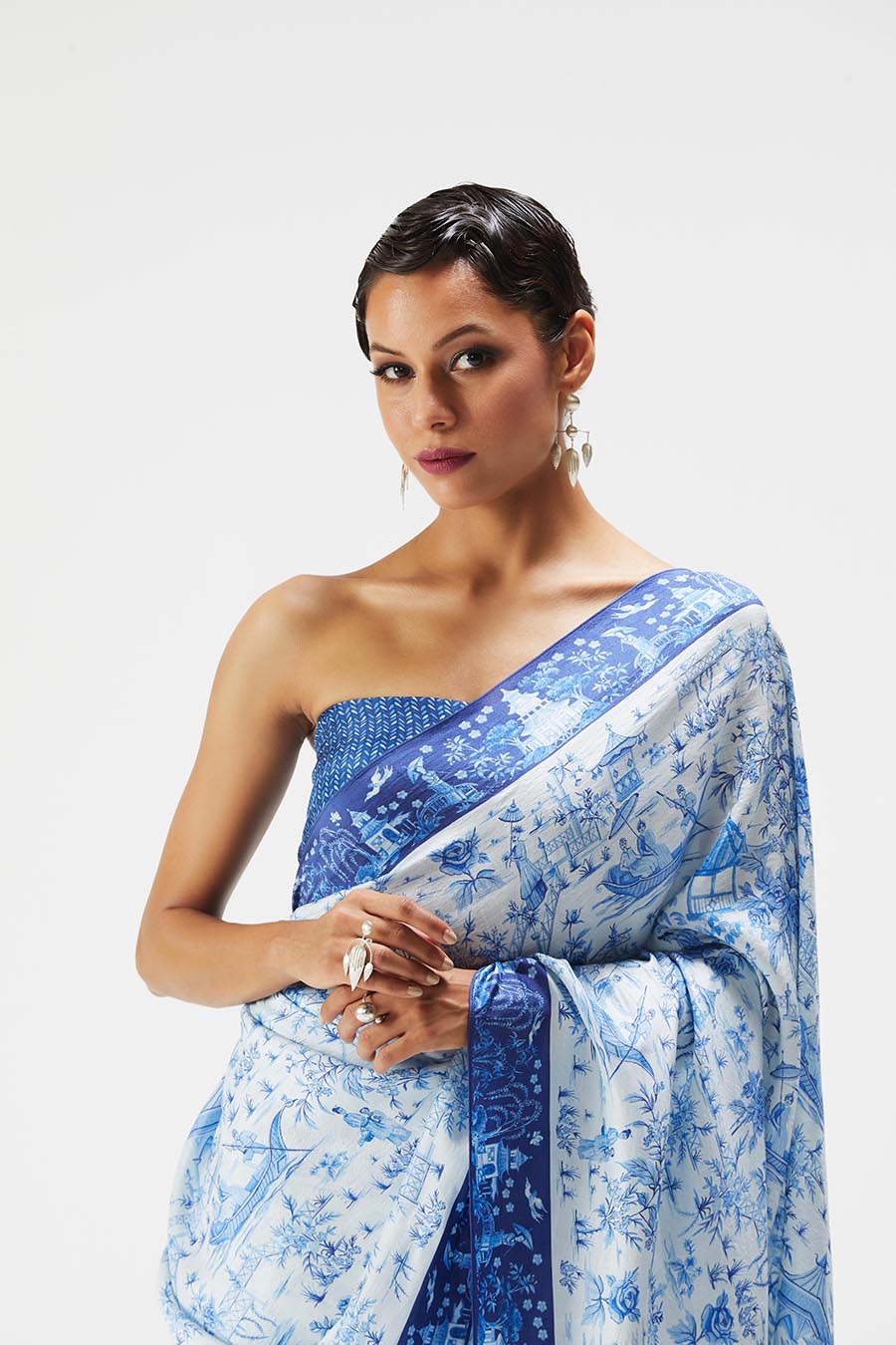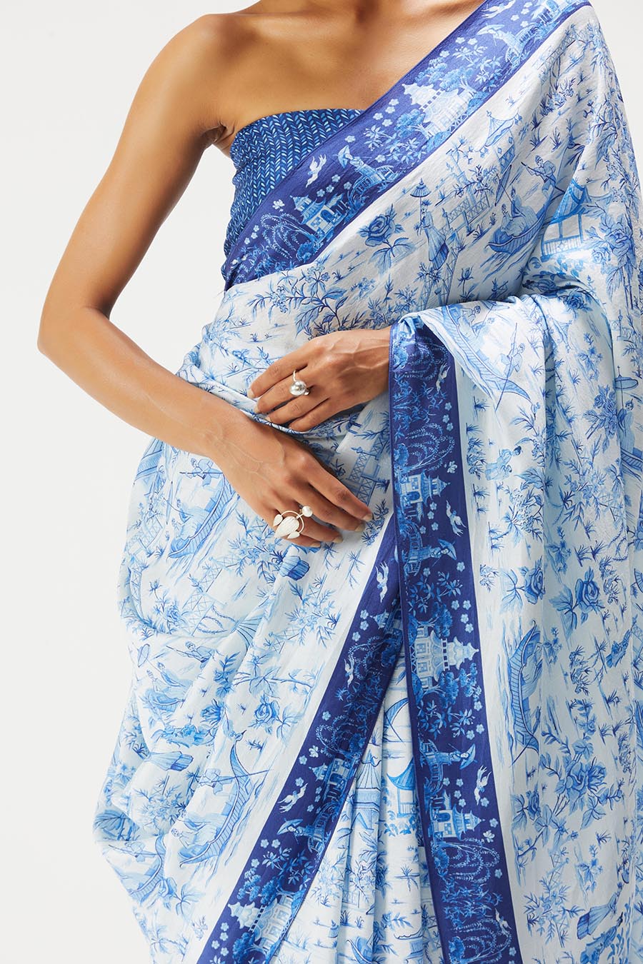 The popular Cheena Cheeni set of Gara motifs that includes pagodas, bridges, plantations and men and women at work, finds a new expression when rendered in a two-colour blue-pottery inspired style.