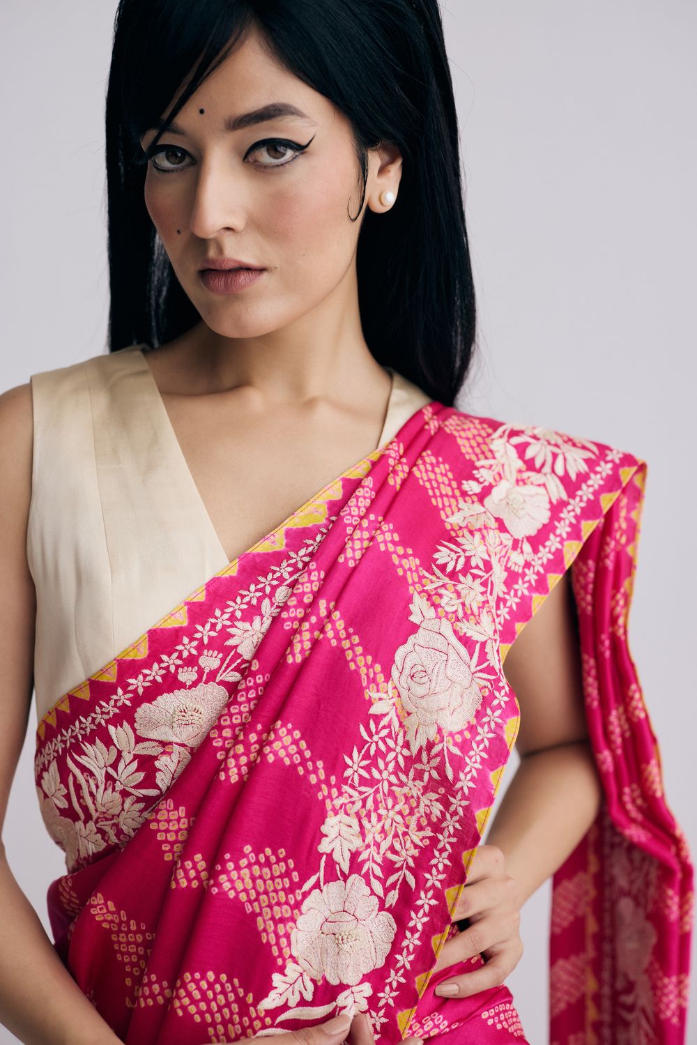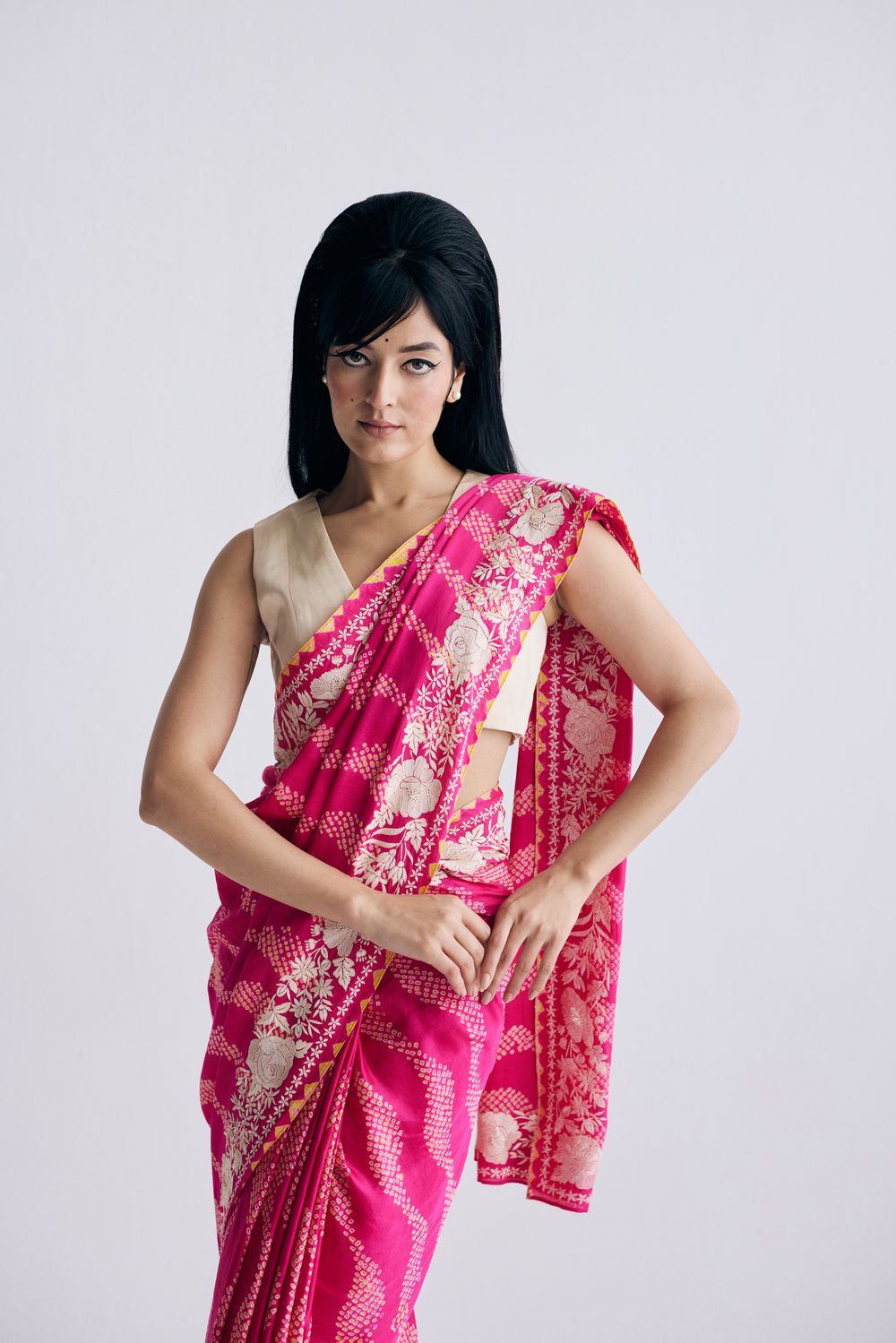 This Barbie knows how to look dressed up and chilled out at the same time in our Mumtaz sari from the Bombay Talkies collection. Bandhani waves meet sweet Parsi Gara florals like they’ve known each other forever. Utterly charming!