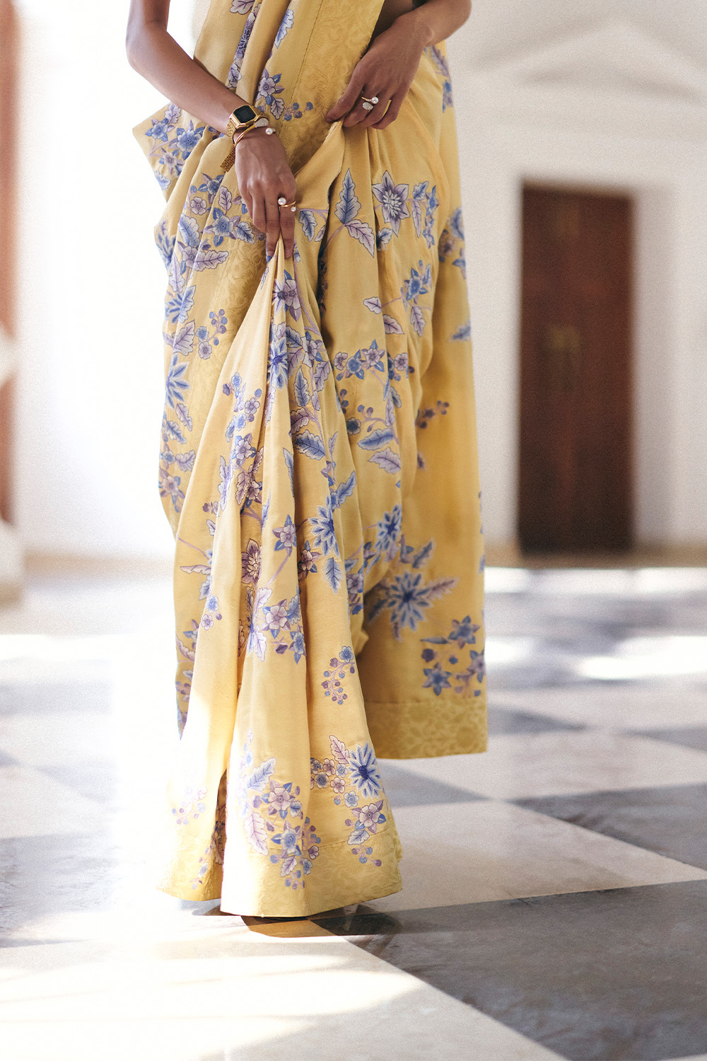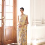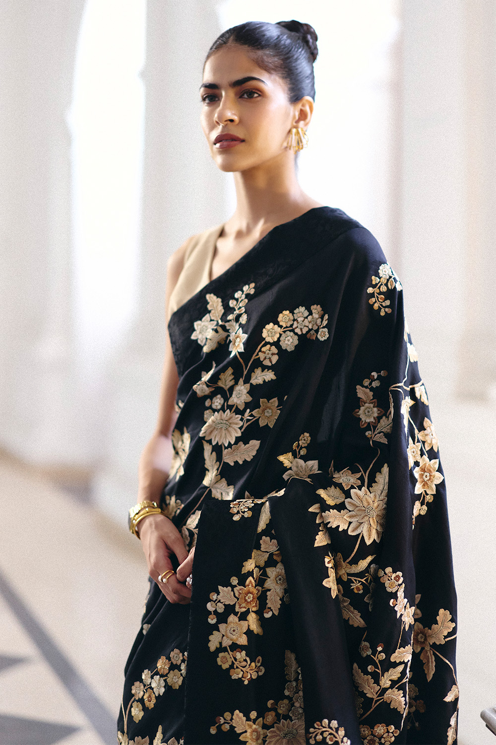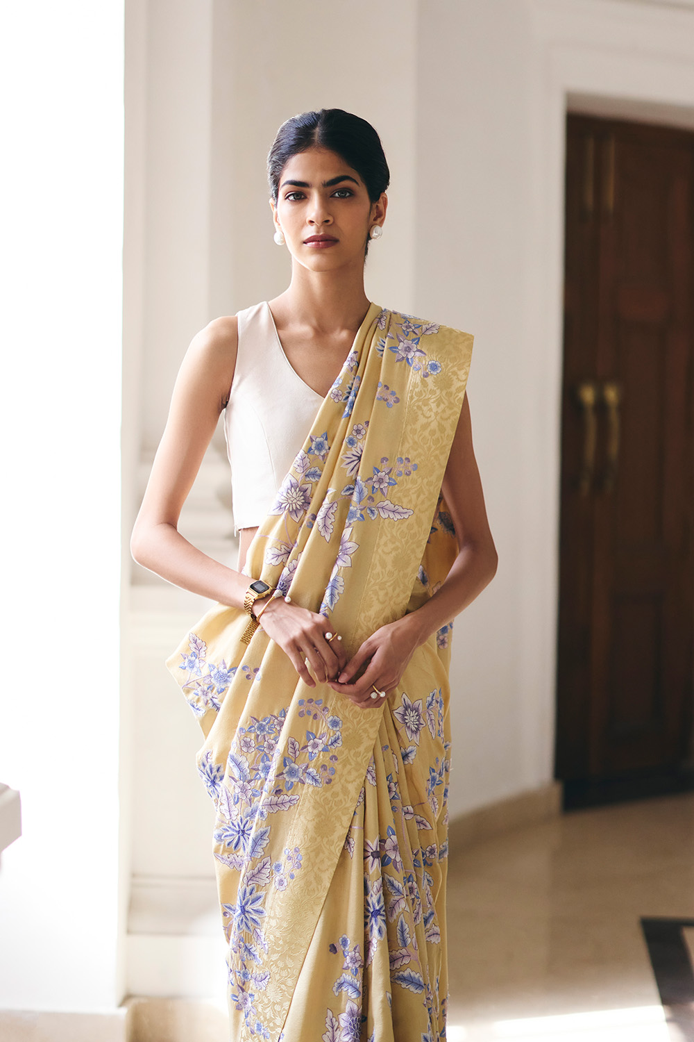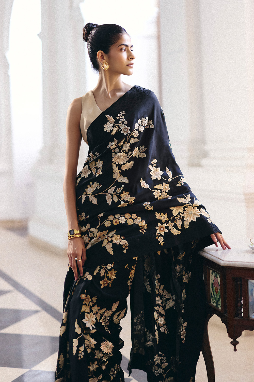 We created a new classic for the evening. Our Nishat sari from the ‘Wildflowers’ collection has been lovingly crafted from raw silk with tanchoi edging.