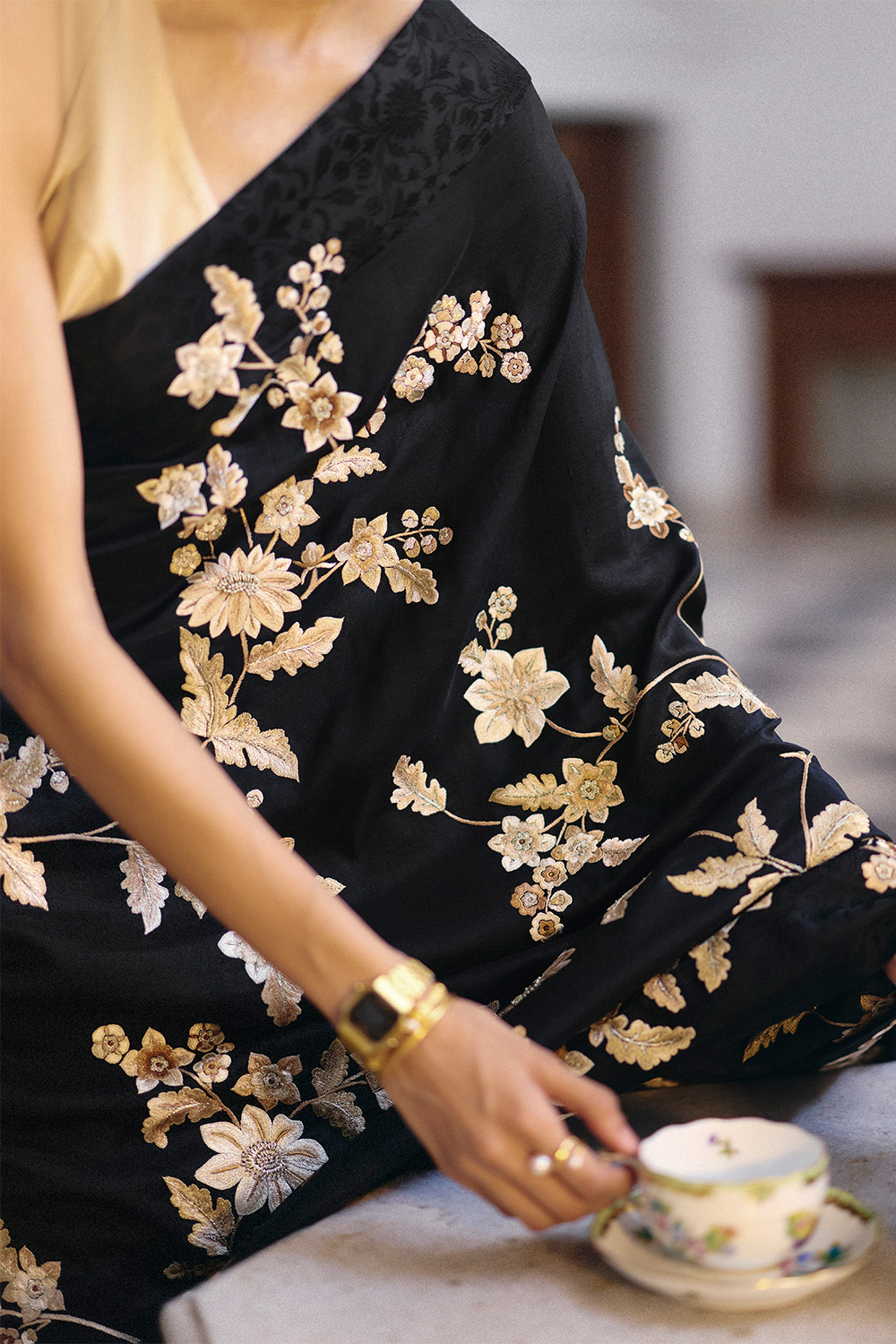 Embroidered with columbines, forget me nots and clematis blooms, this black and gold number is a dream to drape and dance the night in.