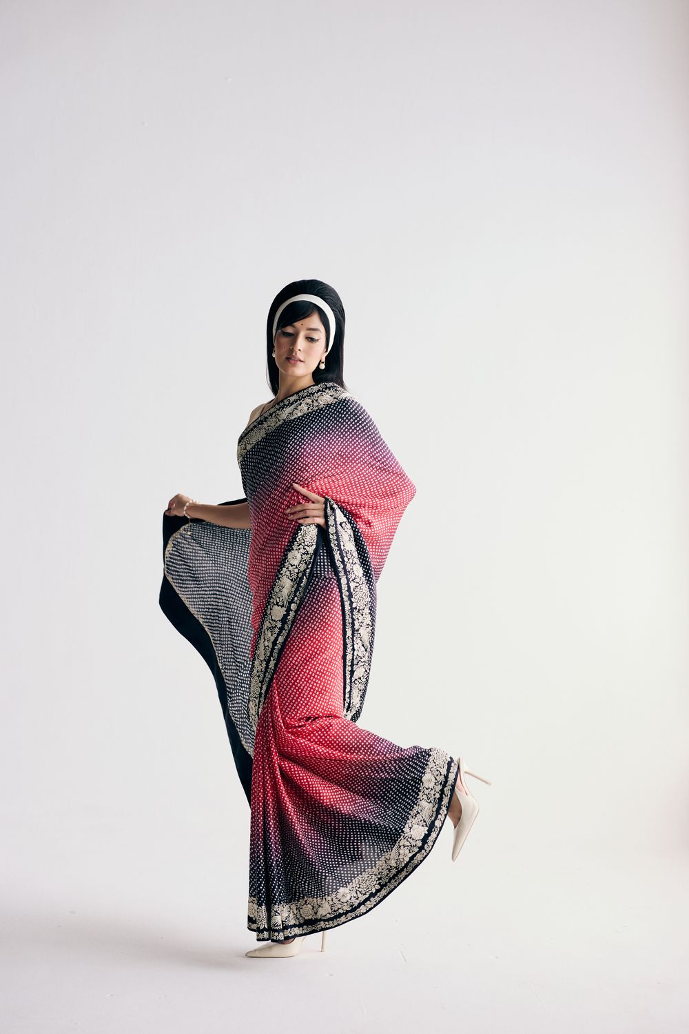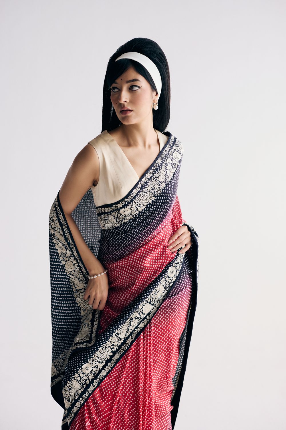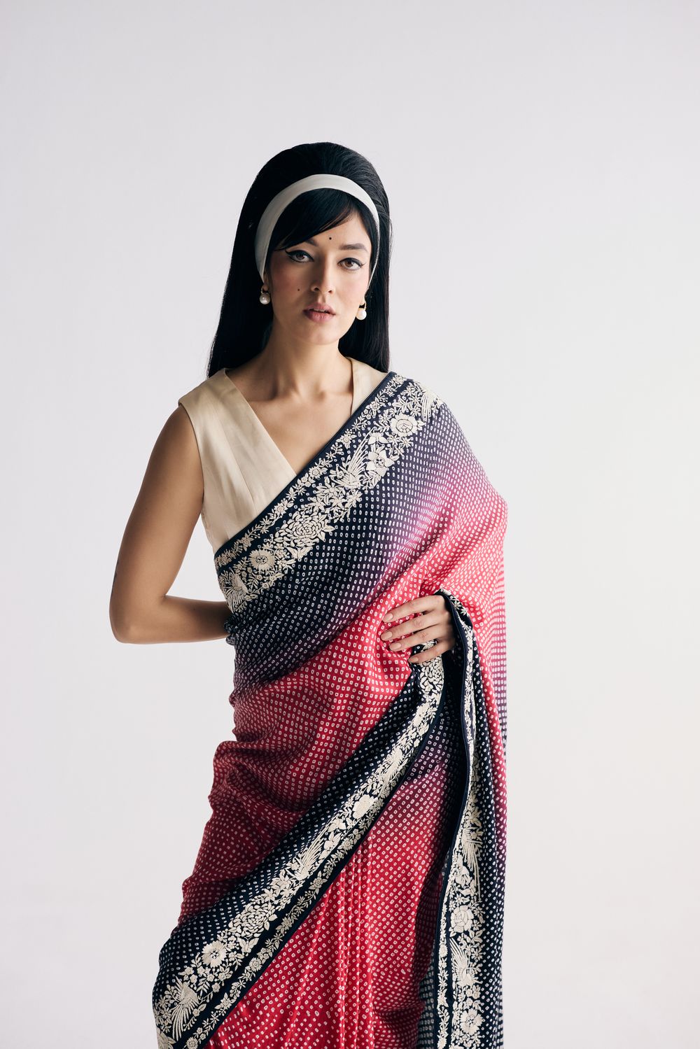 Our Nutan sari in a dramatic dual colour ombre features bandhani dots dancing all over it framed by a hand-embroidered and Parsi gara double border with elegant florals. The lightweight fabric makes it a dream to move in.
