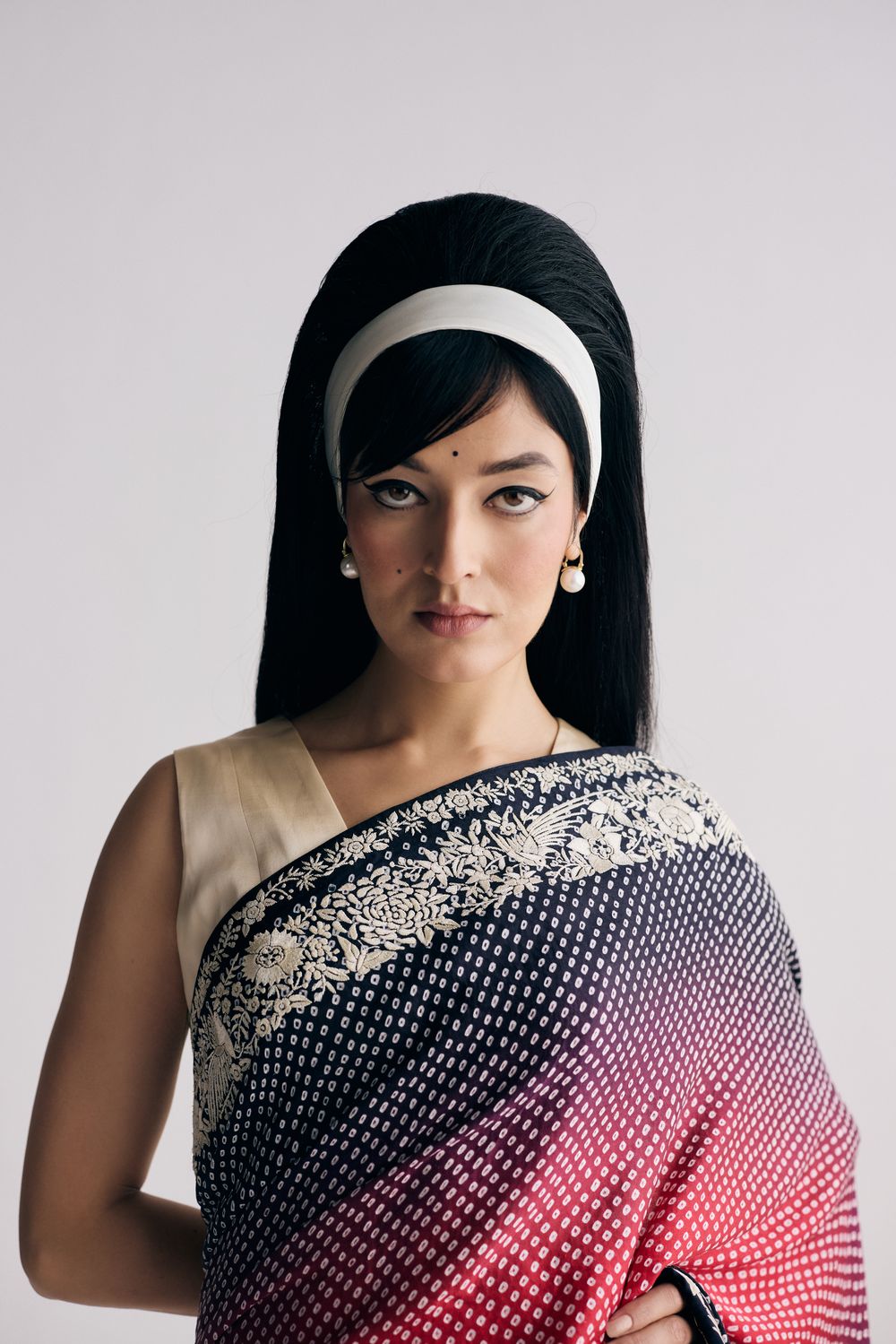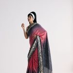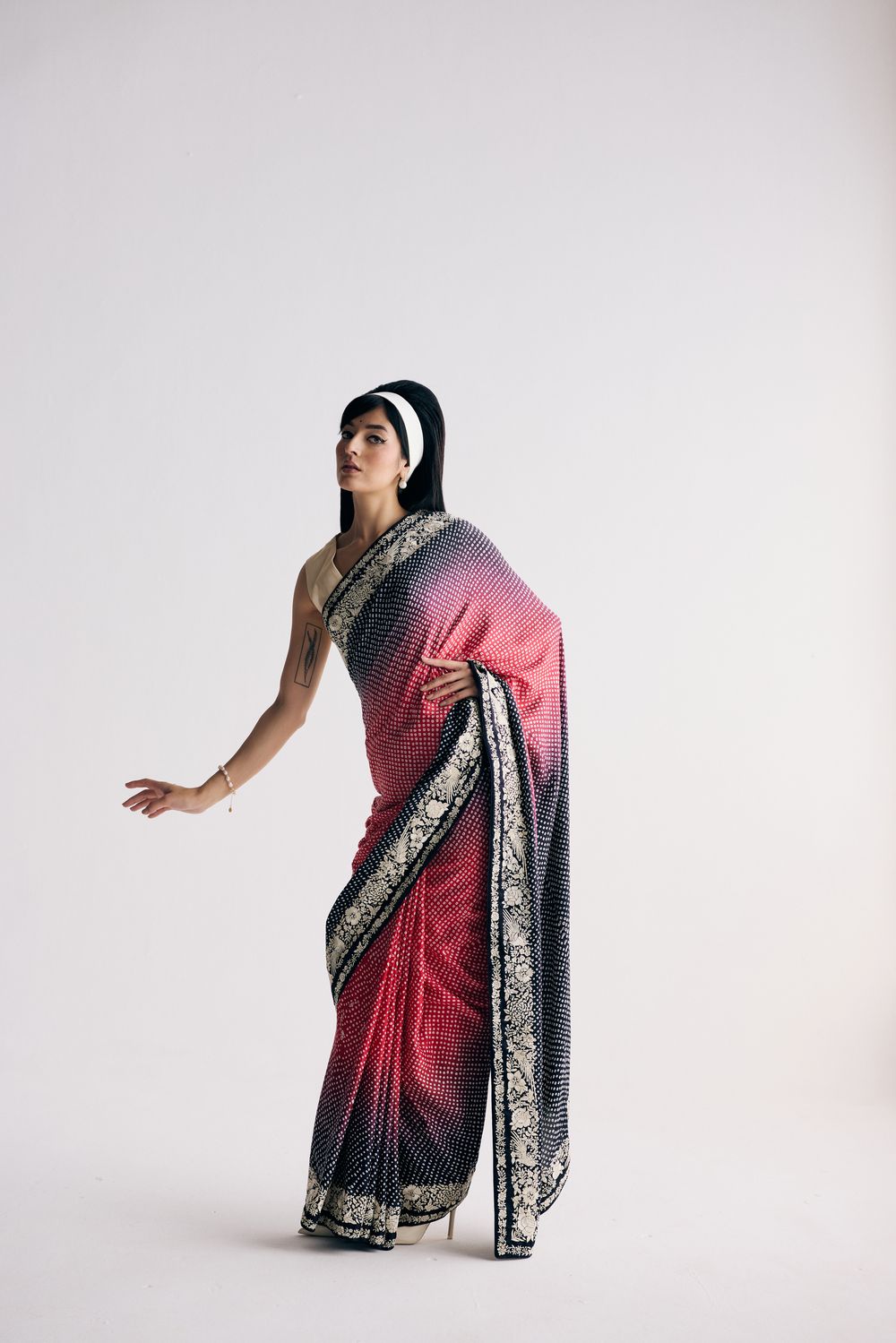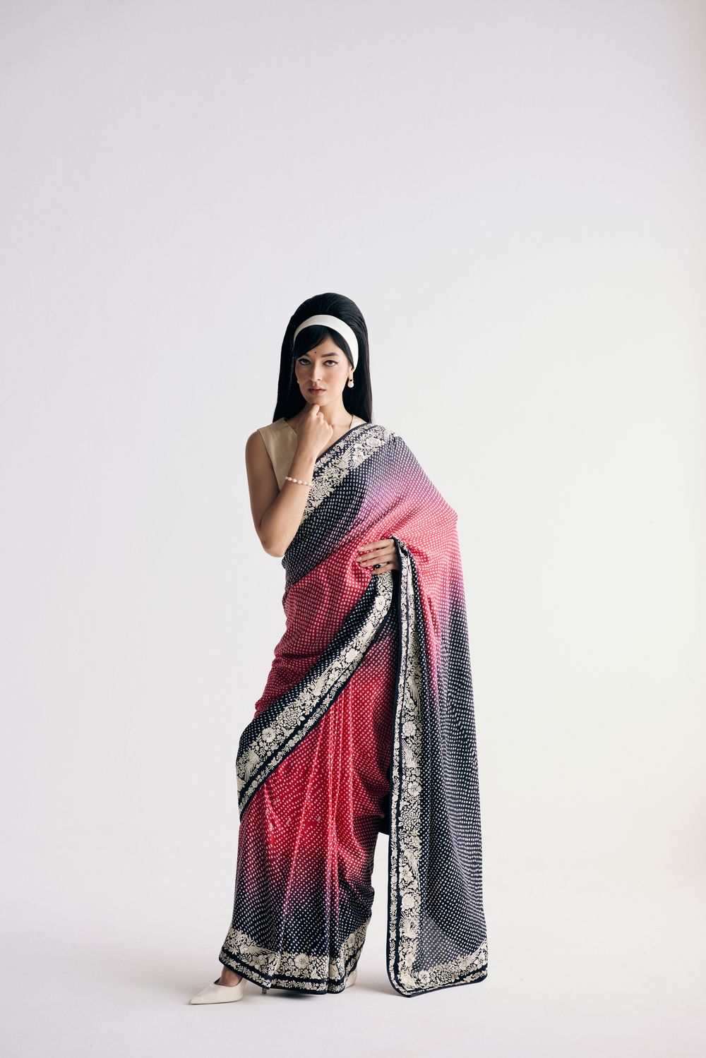Our Nutan sari in a dramatic dual colour ombre features bandhani dots dancing all over it framed by a hand-embroidered and Parsi gara double border with elegant florals. The lightweight fabric makes it a dream to move in.