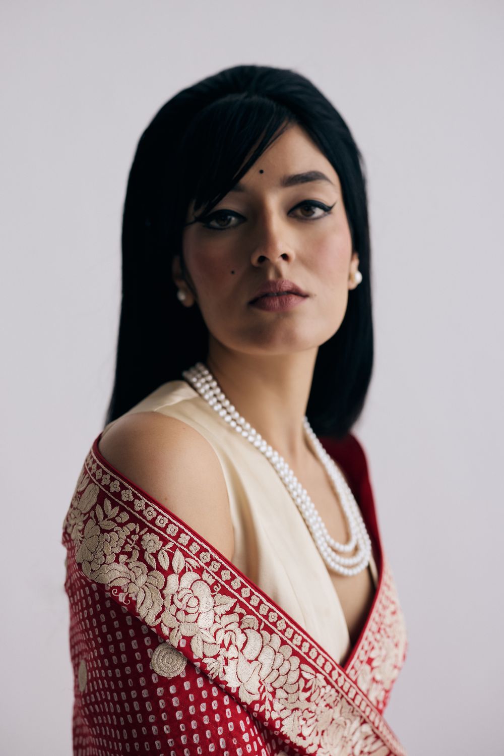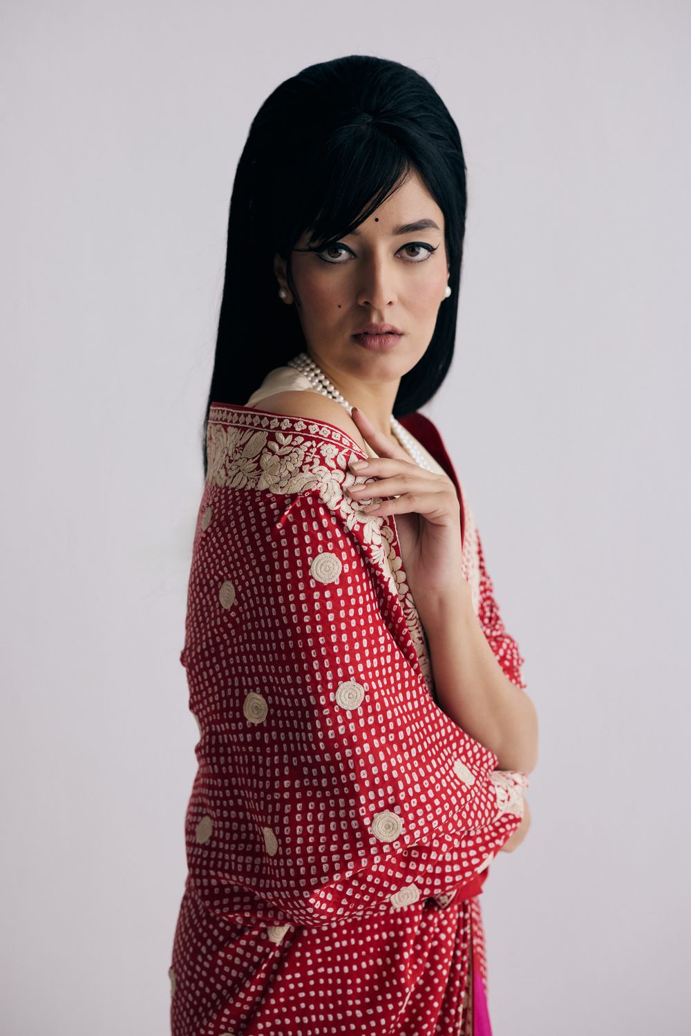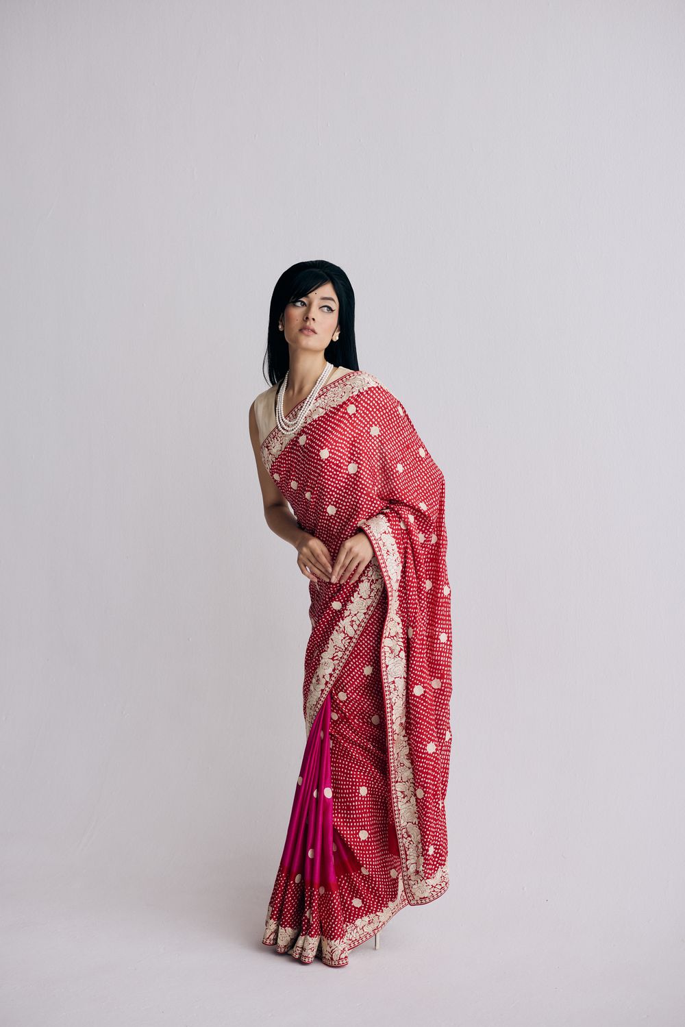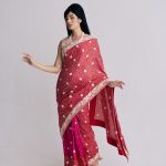 Kanda Papeta (onion & potato) is a traditional motif in the Parsi gara lexicon. Our Nutan sari features bandhani dots overlaid with hand-embroidered kanda papeta motifs and a floral border which makes it vintage & brand new at the same time.