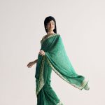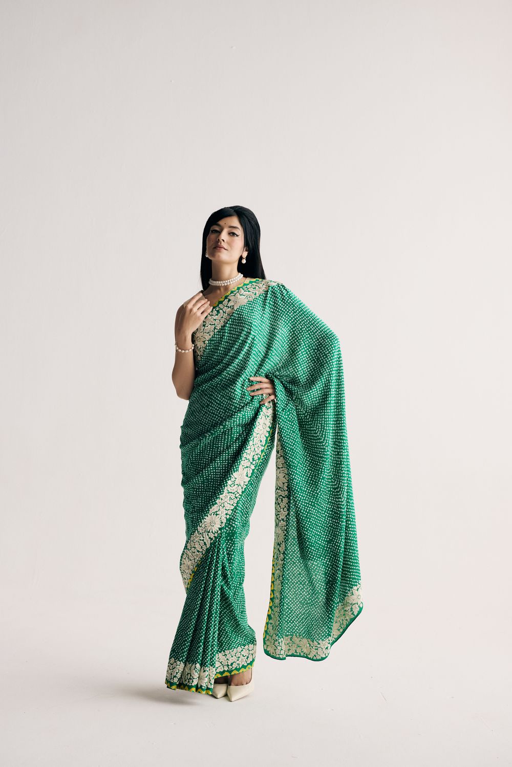 Our Nutan sari in a vibrant panna green features bandhani dots dancing all over it framed by a hand-embroidered Parsi gara border with elegant damselfly motifs. The lightweight fabric makes it a dream to move in.