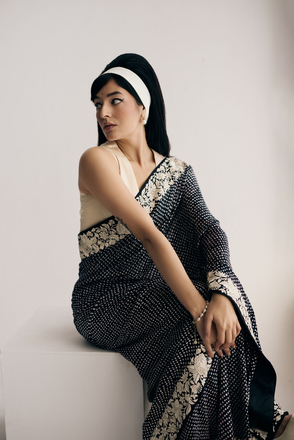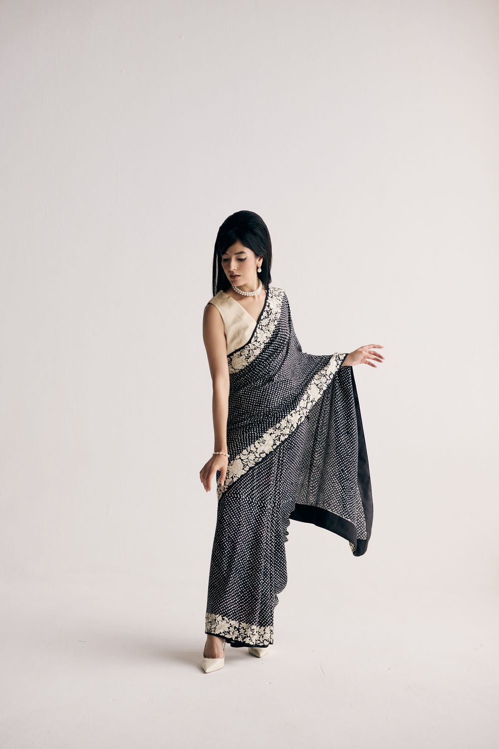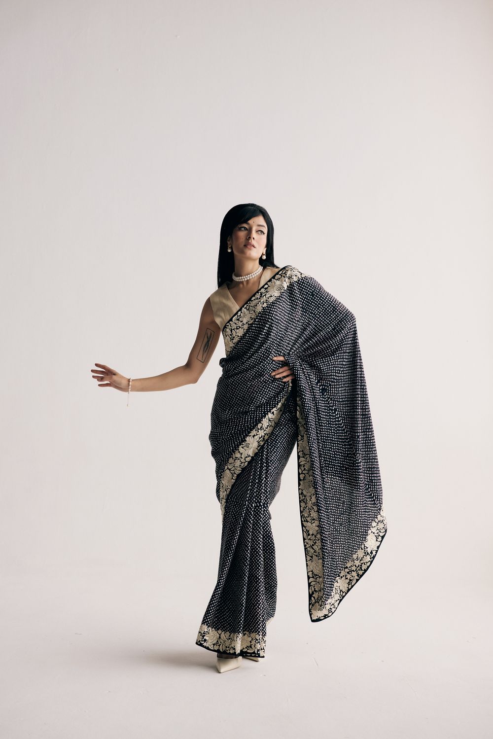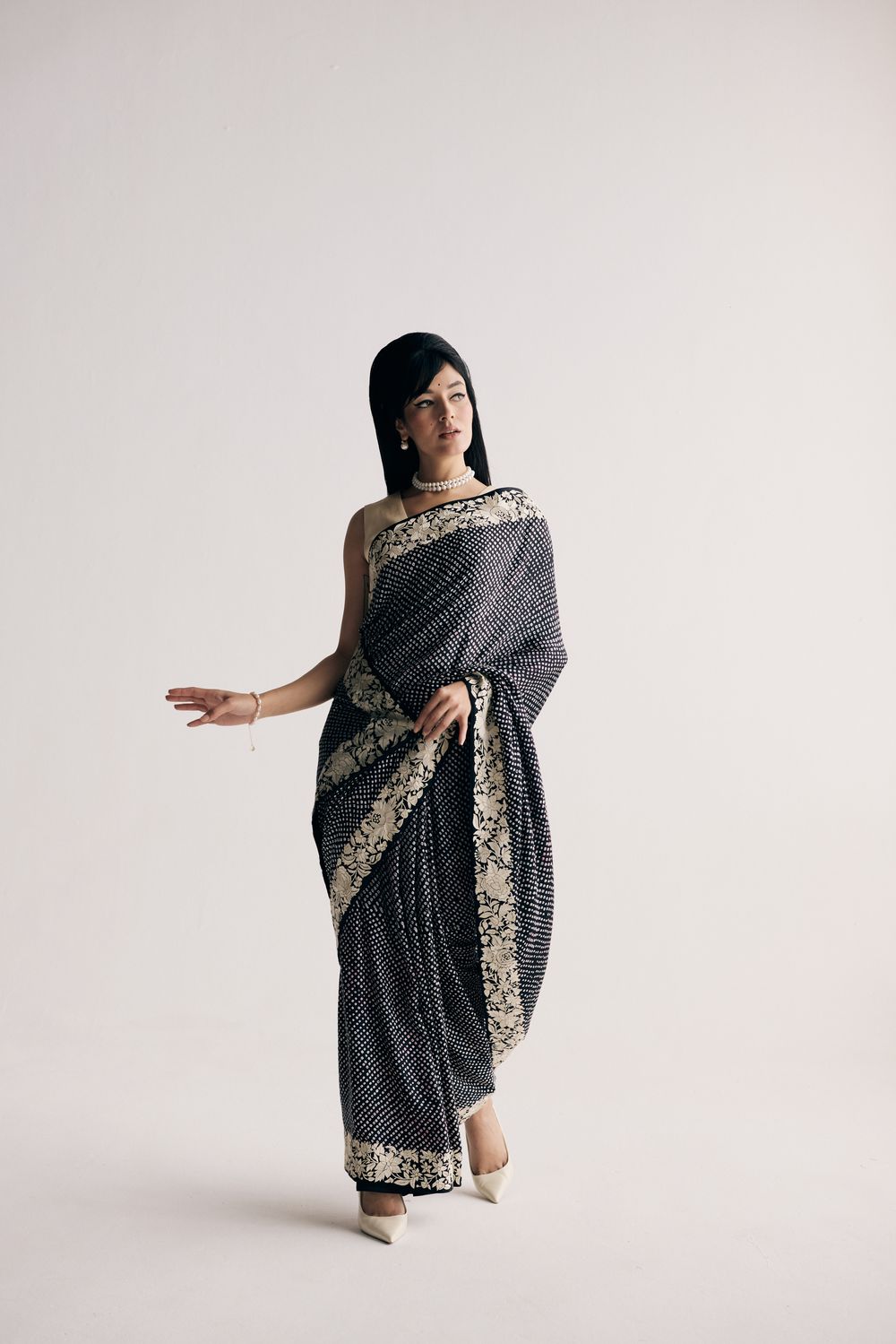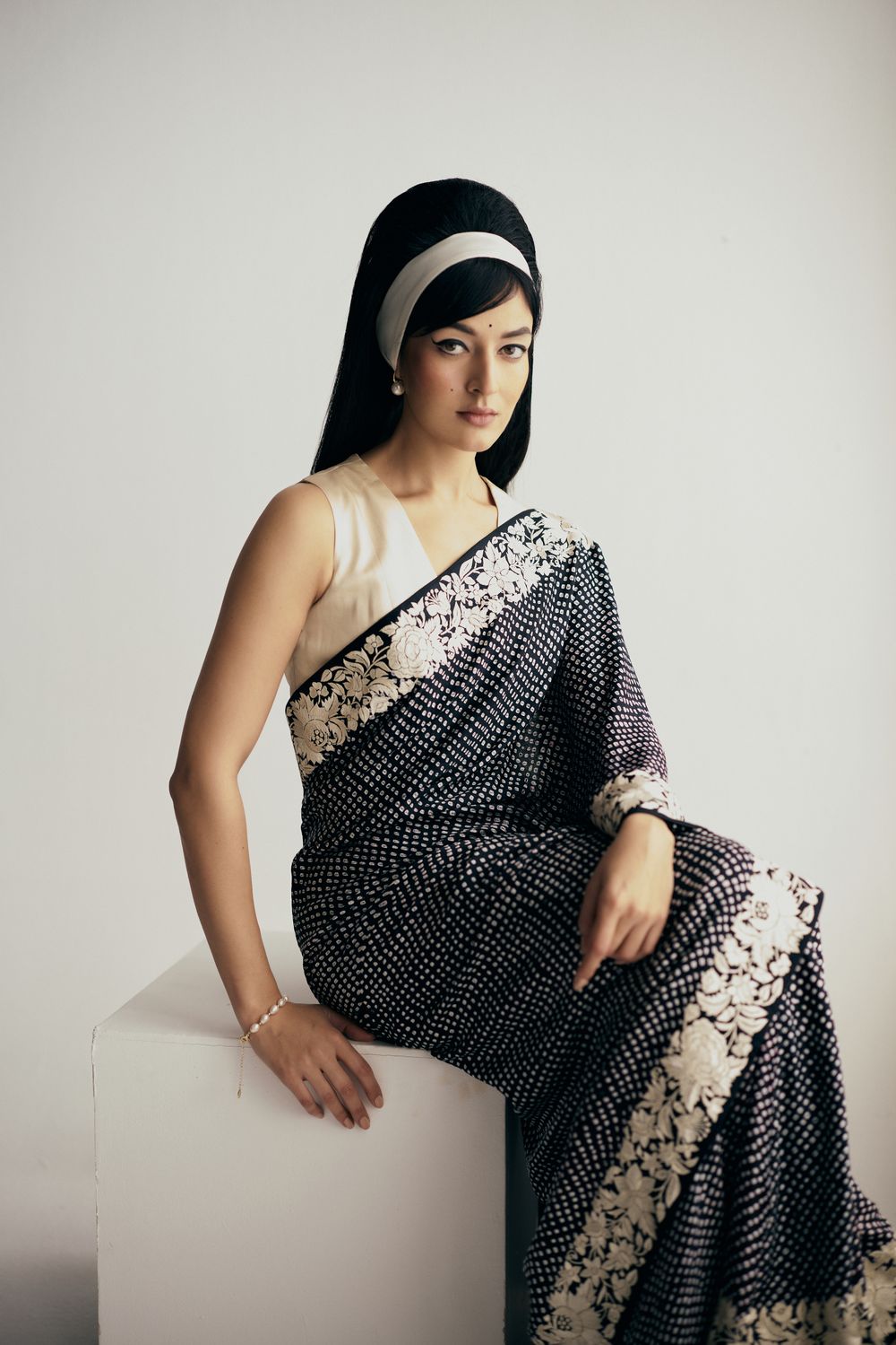 Our Nutan sari in a dramatic dual colour ombre features bandhani dots dancing all over it framed by a hand-embroidered and Parsi gara double border with elegant florals. The lightweight fabric makes it a dream to move in.
