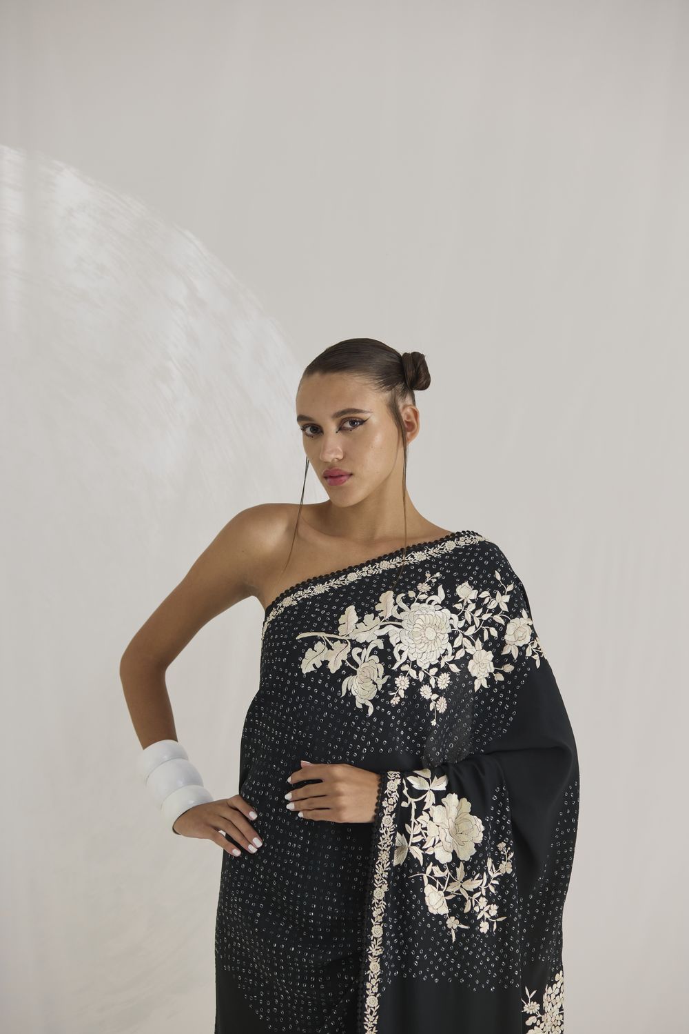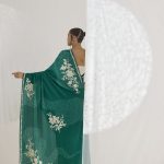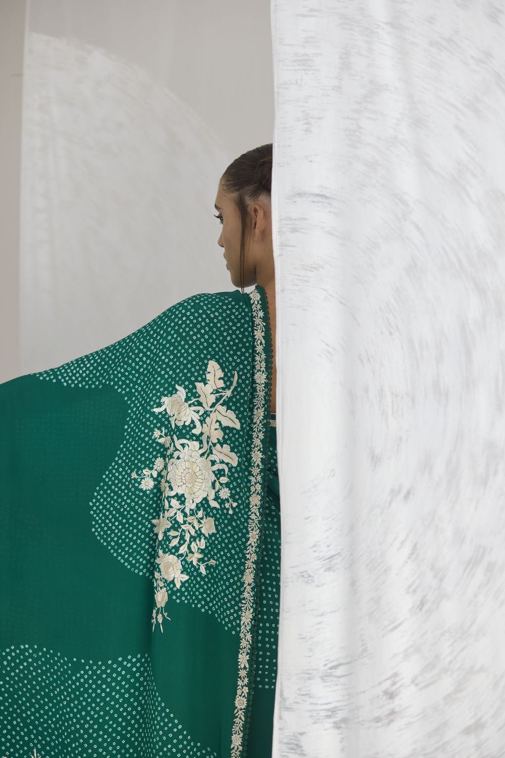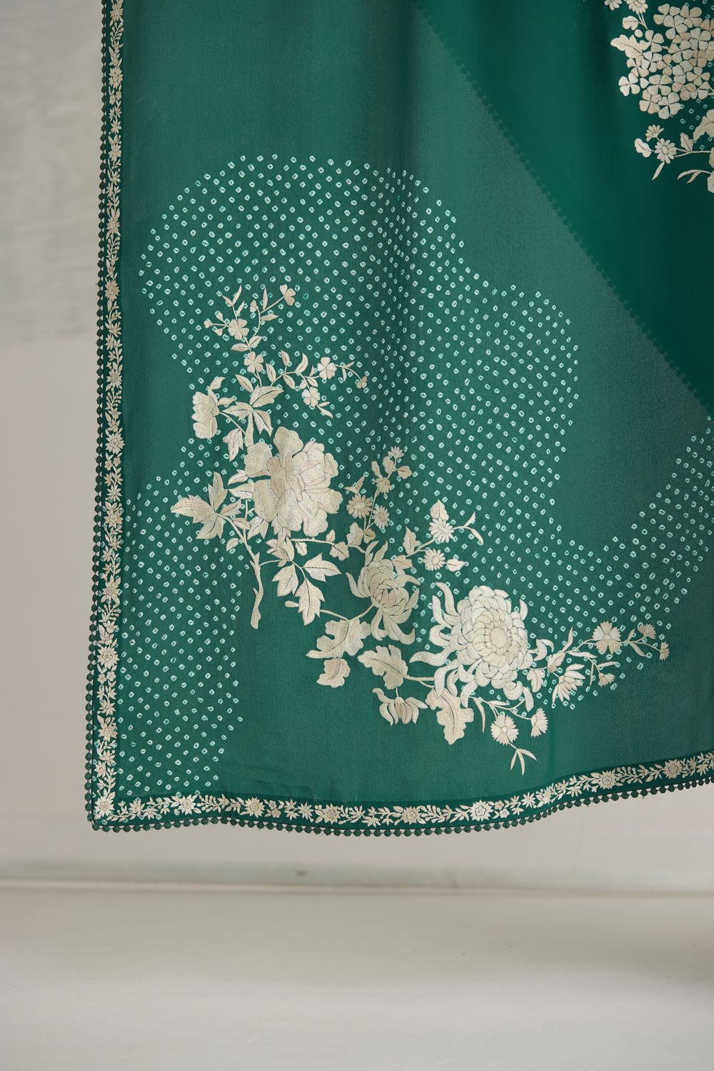 Fine Parsi needle craft juxtaposed with bandhani dots realised in a beautiful Viridian Green colour.