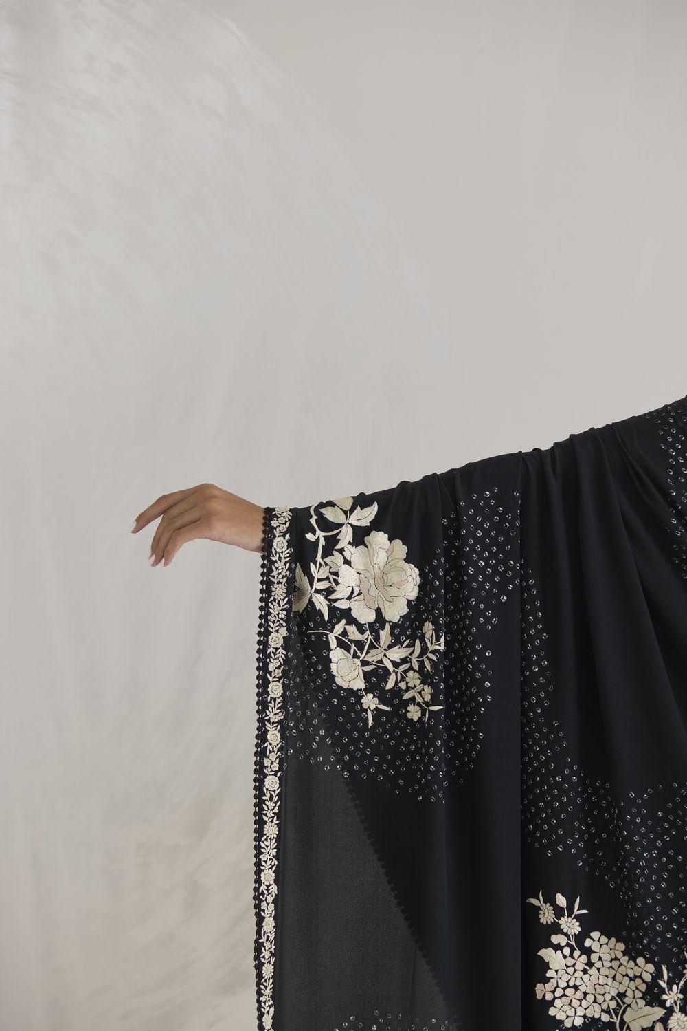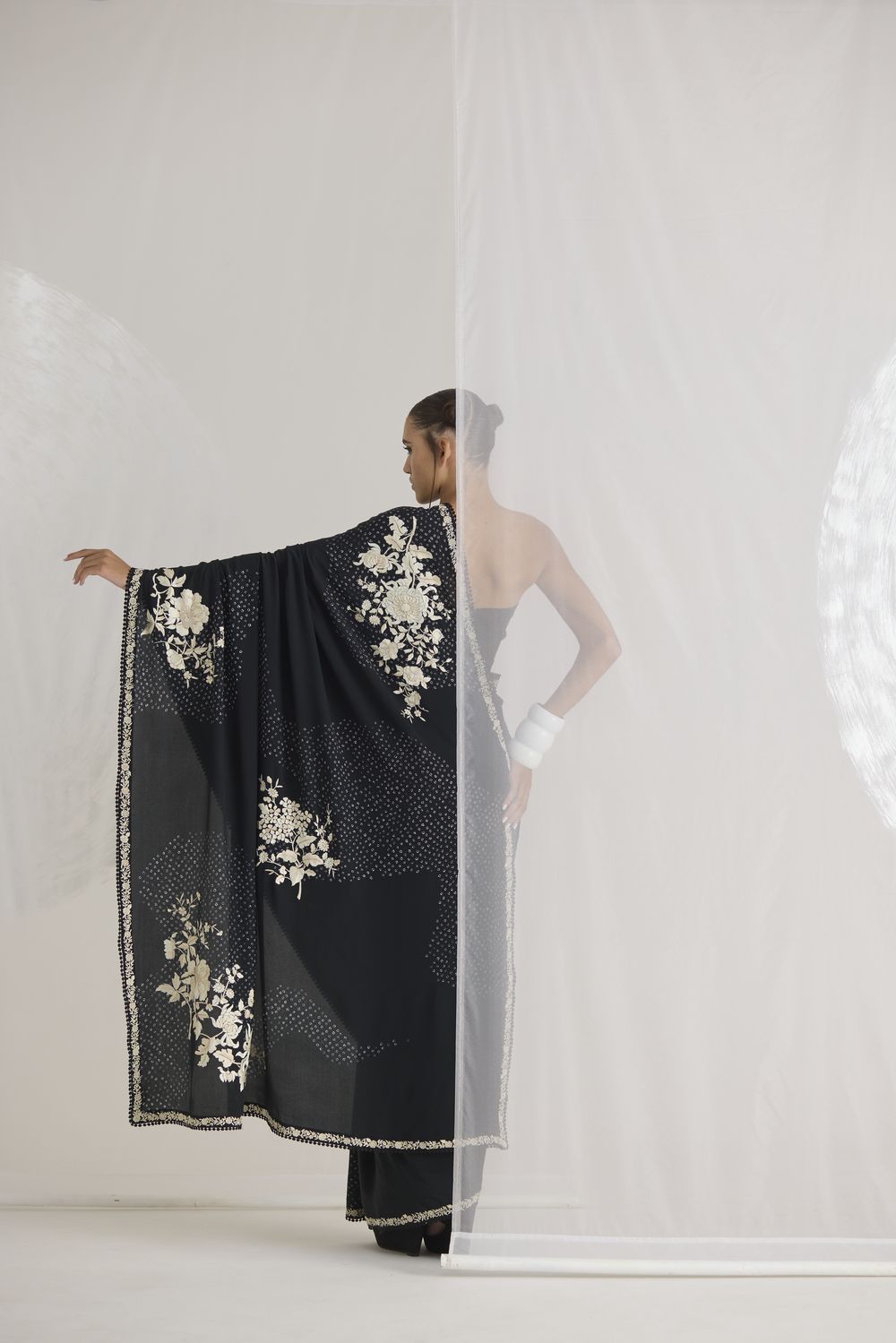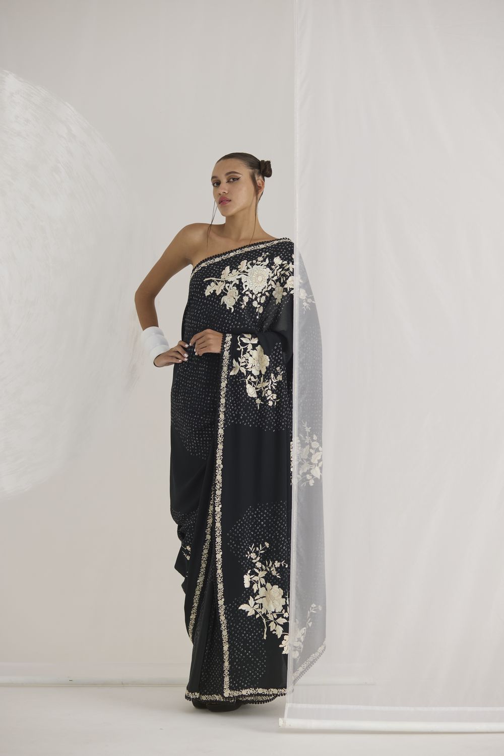 Fine Parsi needle craft juxtaposed with bandhani dots realised in a beautiful Viridian Green colour.