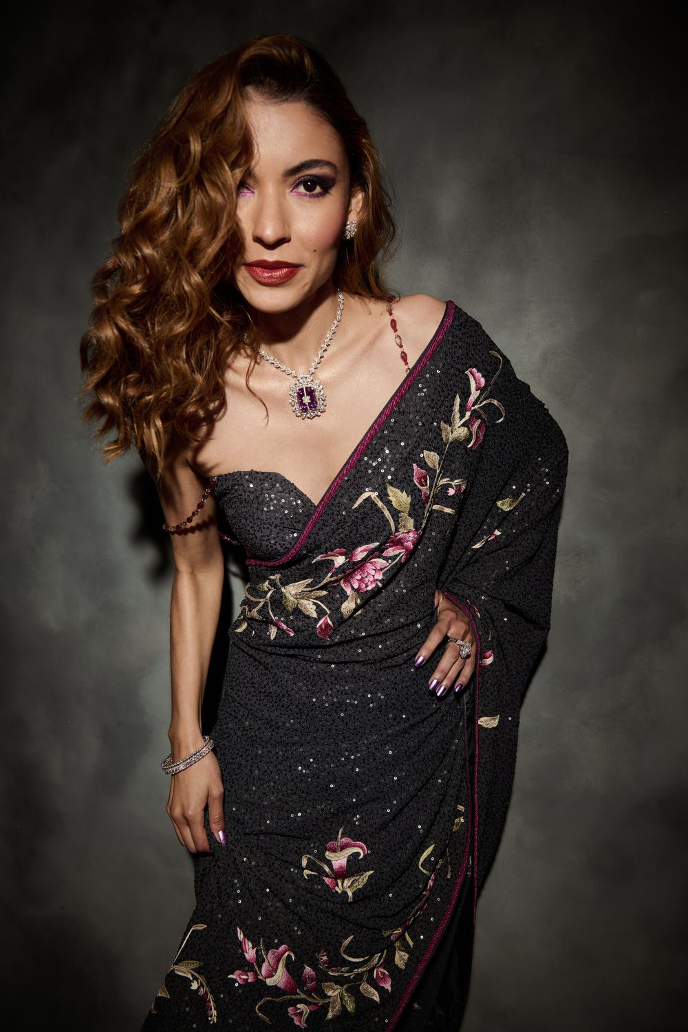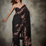 Our lead grey Peony & Lily all-sequin sari has a hand-embroidered border running through the length. Plus gorgeous floral buttis.