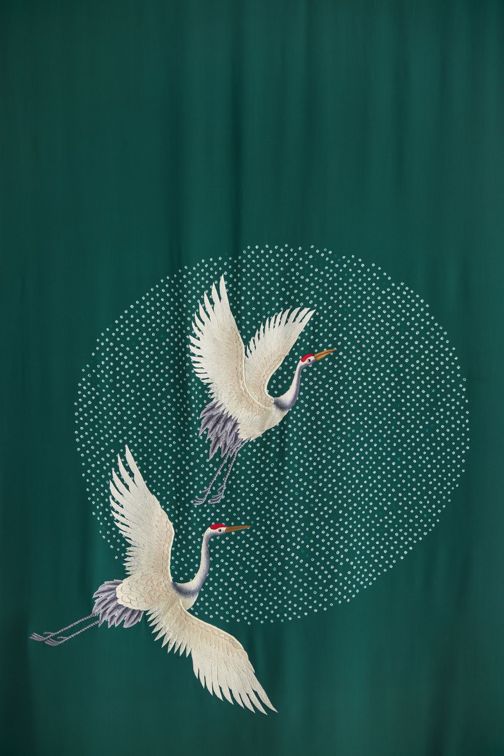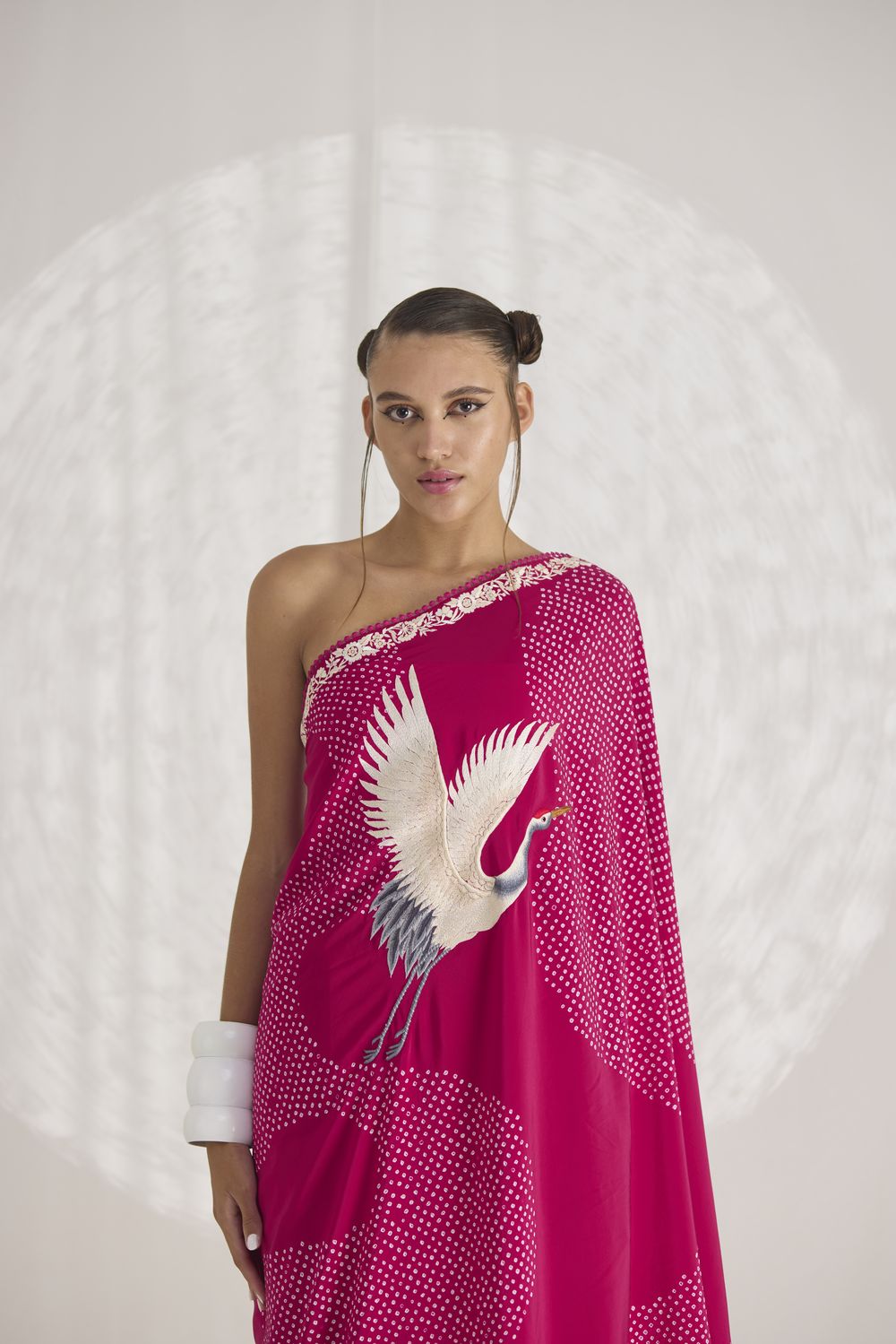 Our hand-embroidered cranes are majestically in flight over a ‘pond’ of handcrafted bandhani dots. Our ‘Crane Pond’ sari in an elegant navy shade is framed by a delicate Parsi Gara border.