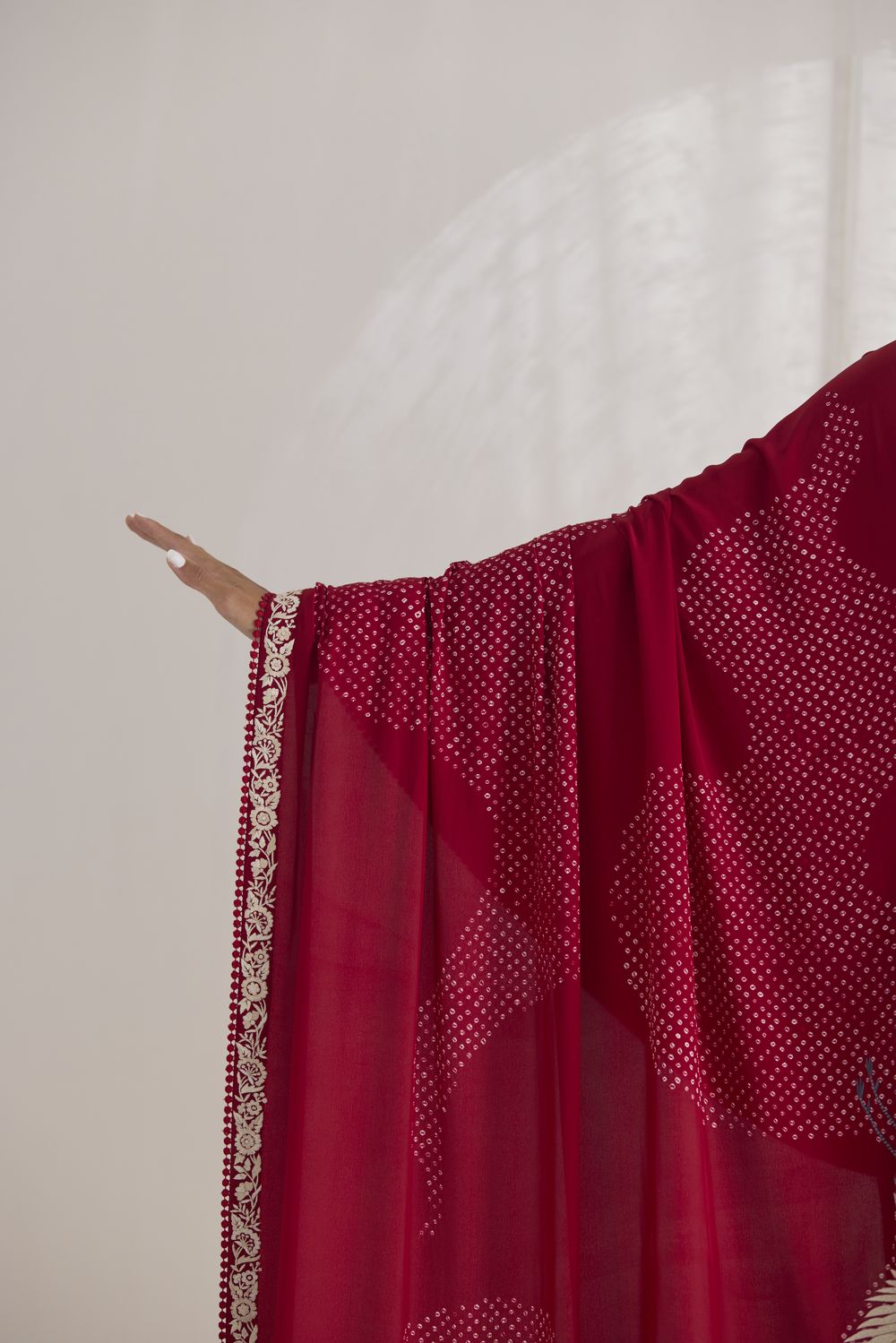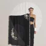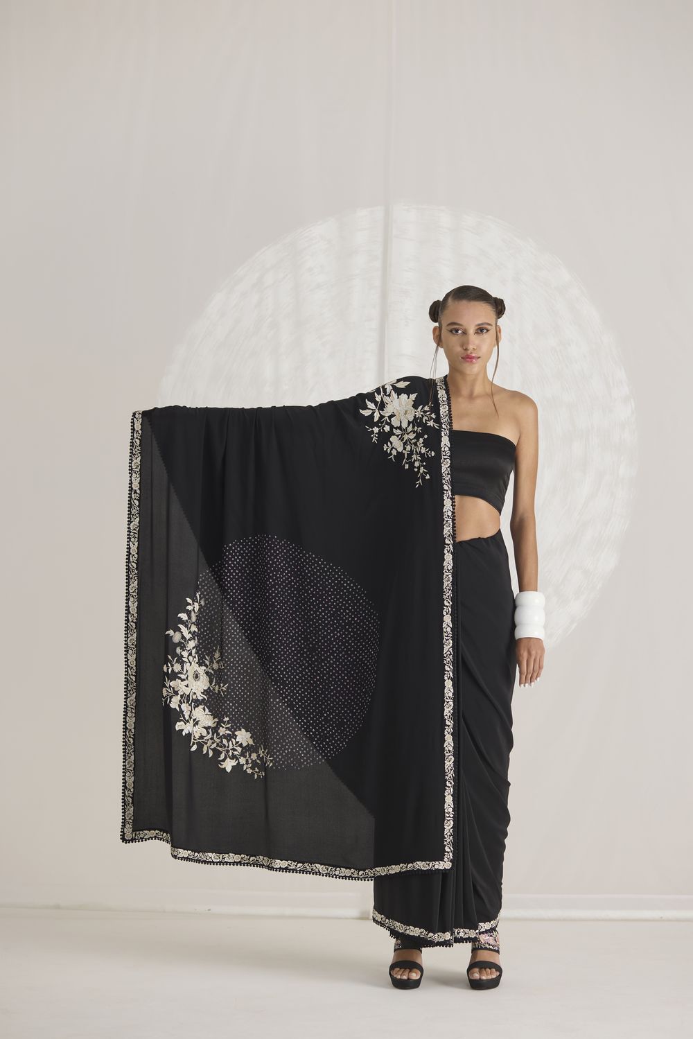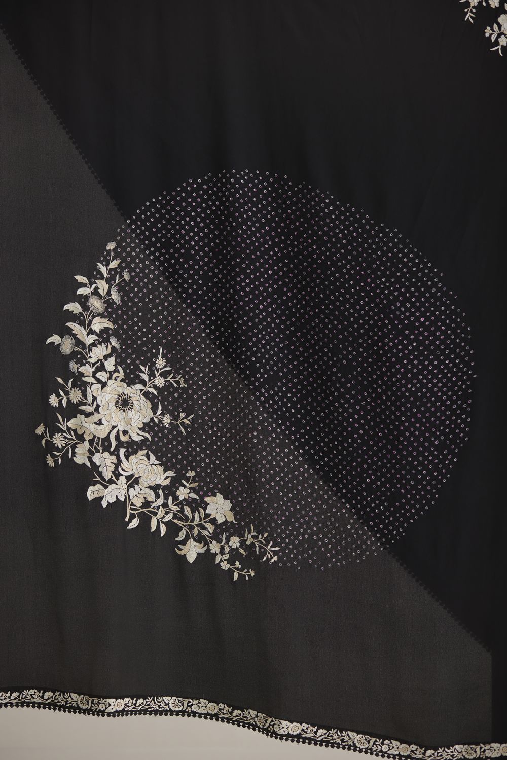 Our ‘Pond’ series features handcrafted bandhani dots that arrange themselves in a contemporary circular pattern flanked by delicate Parsi Gara embroidery.