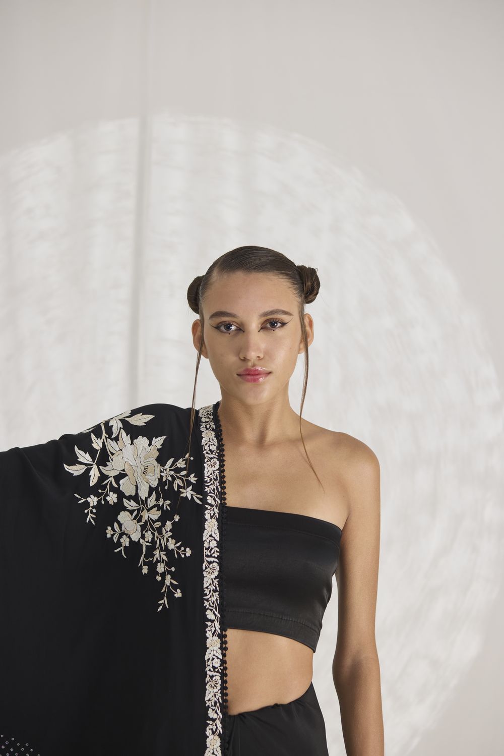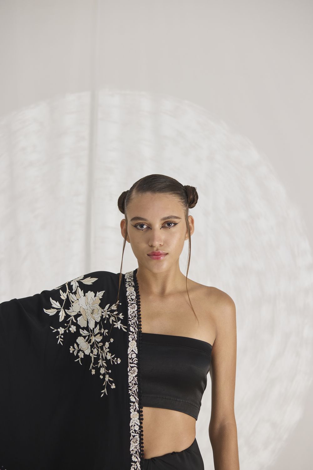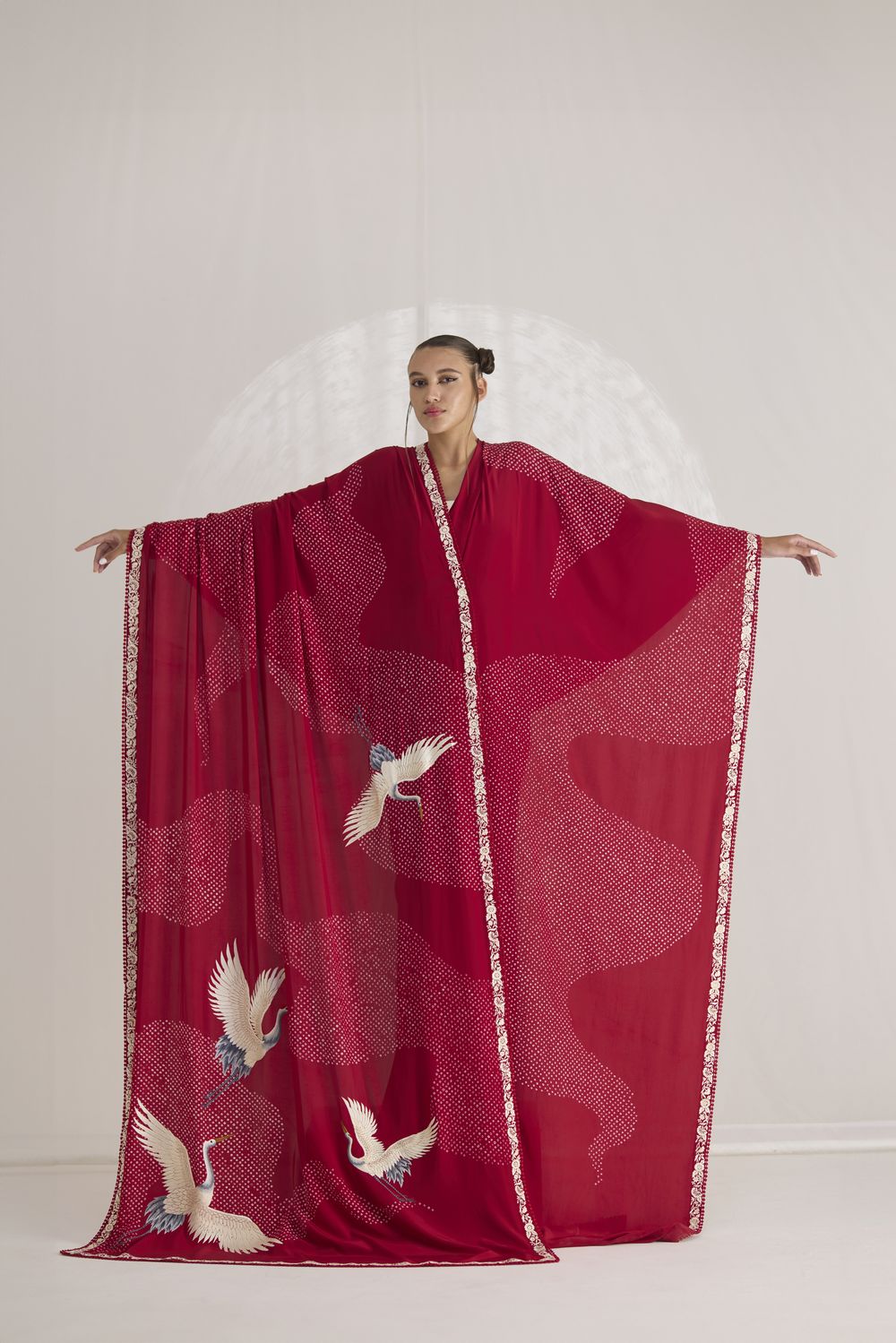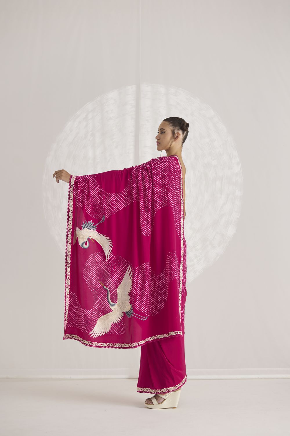 Our ‘Pond’ series features handcrafted bandhani dots that arrange themselves in a contemporary circular pattern flanked by delicate Parsi Gara embroidery.