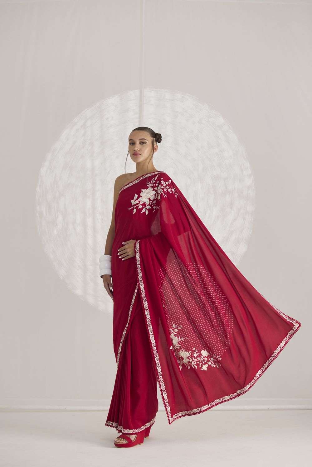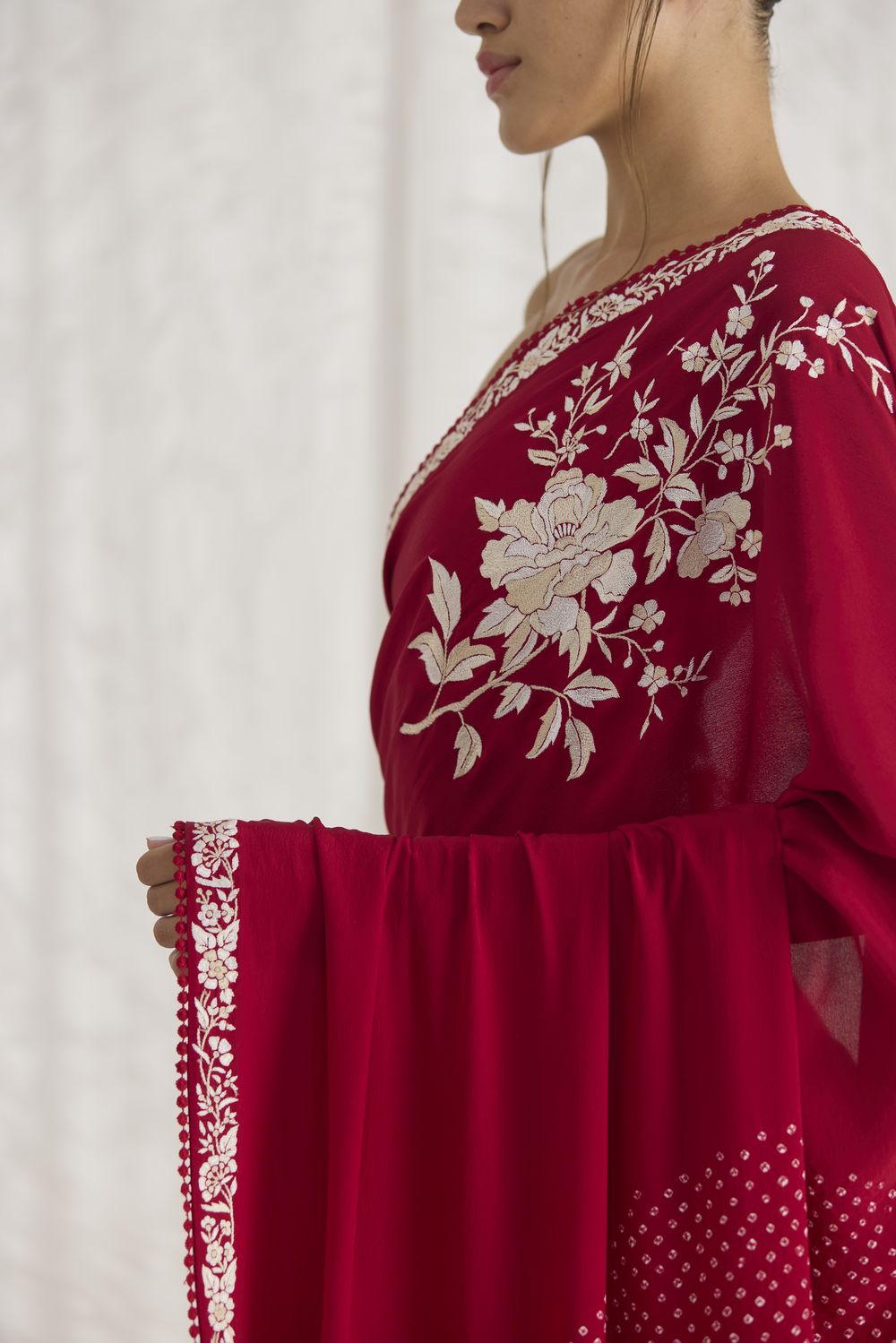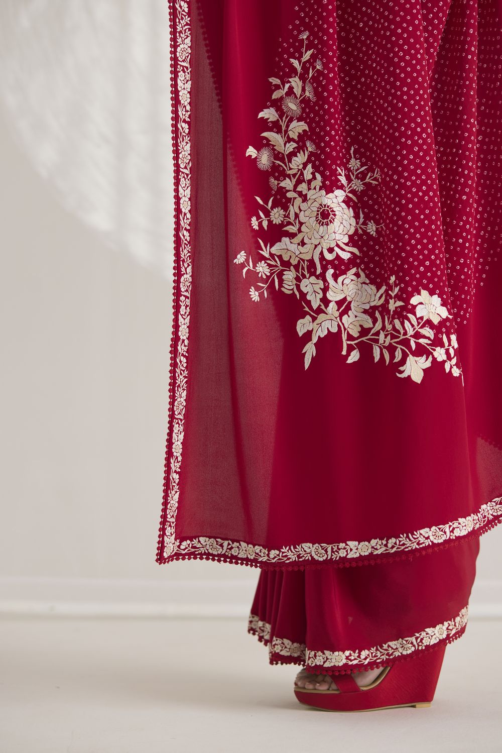 On our ‘Floral Pond’ sari hand-embroidered seasonal blooms appear alongside the bandhani ‘pond.’