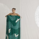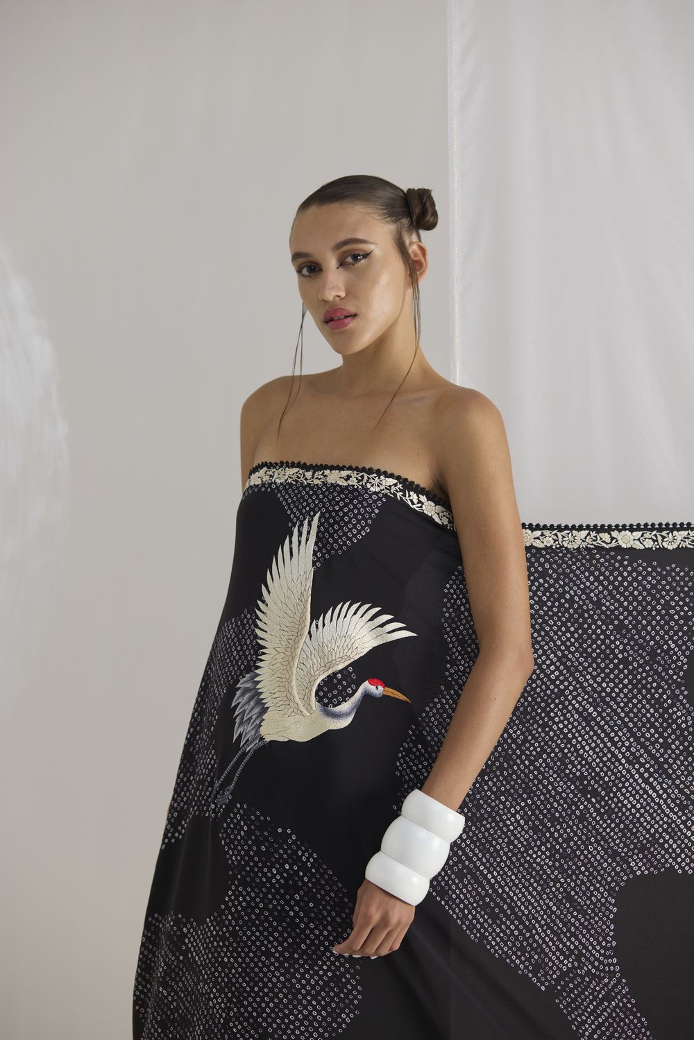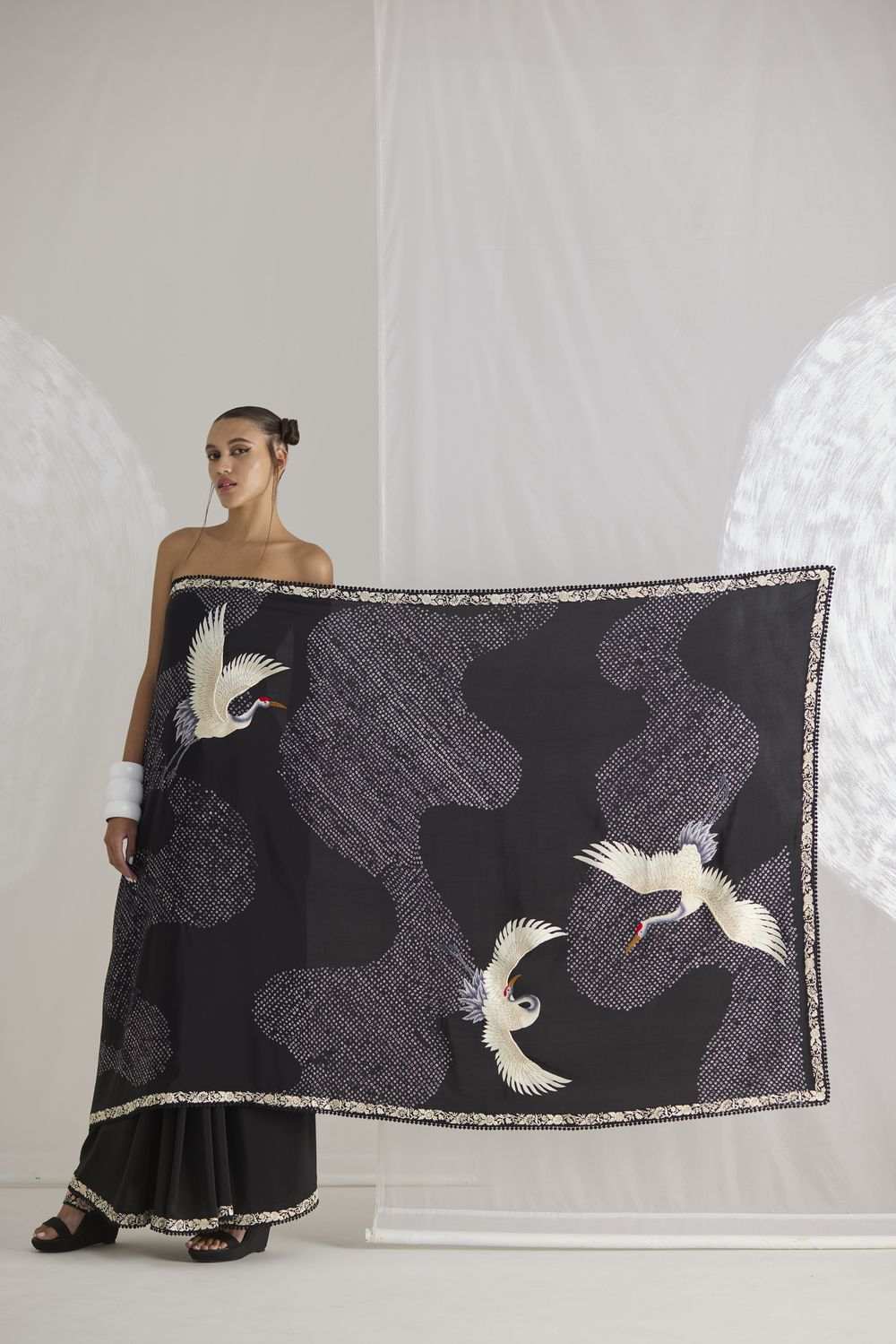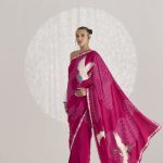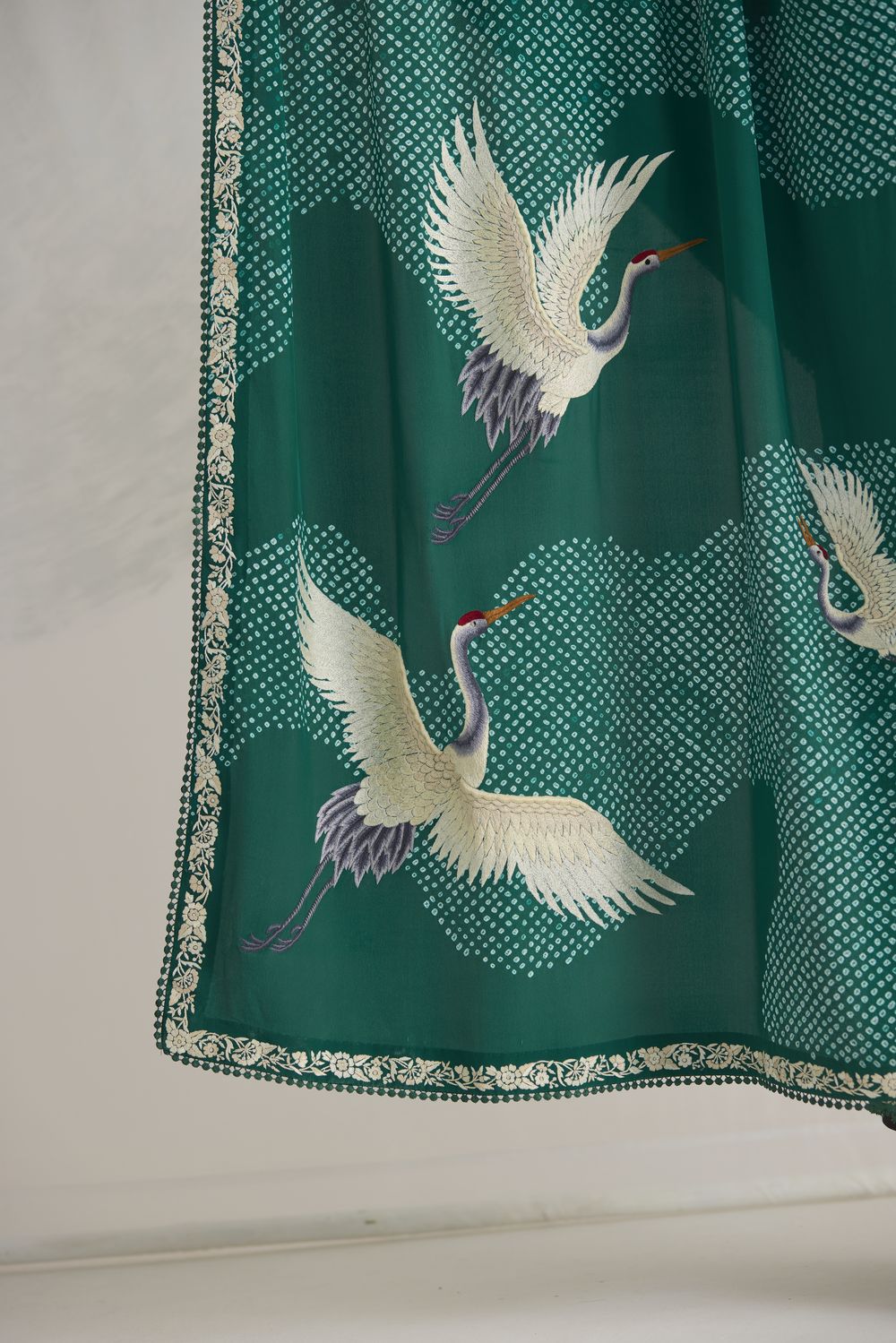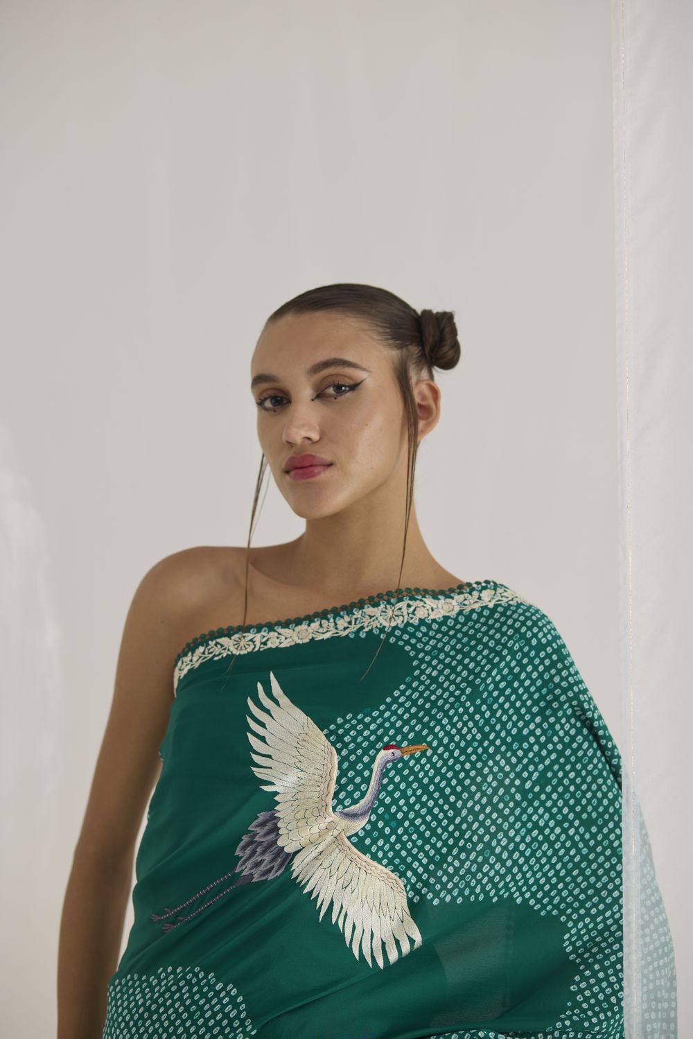 Our ‘Floral River’ sari in this lush shade serves as a meeting point for flowing bandhani dots and hand-embroidered Parsi Gara florals.
