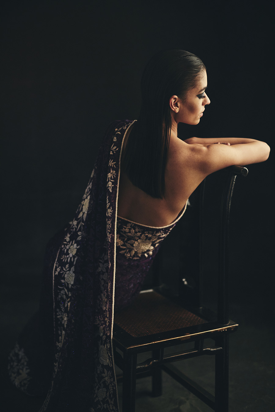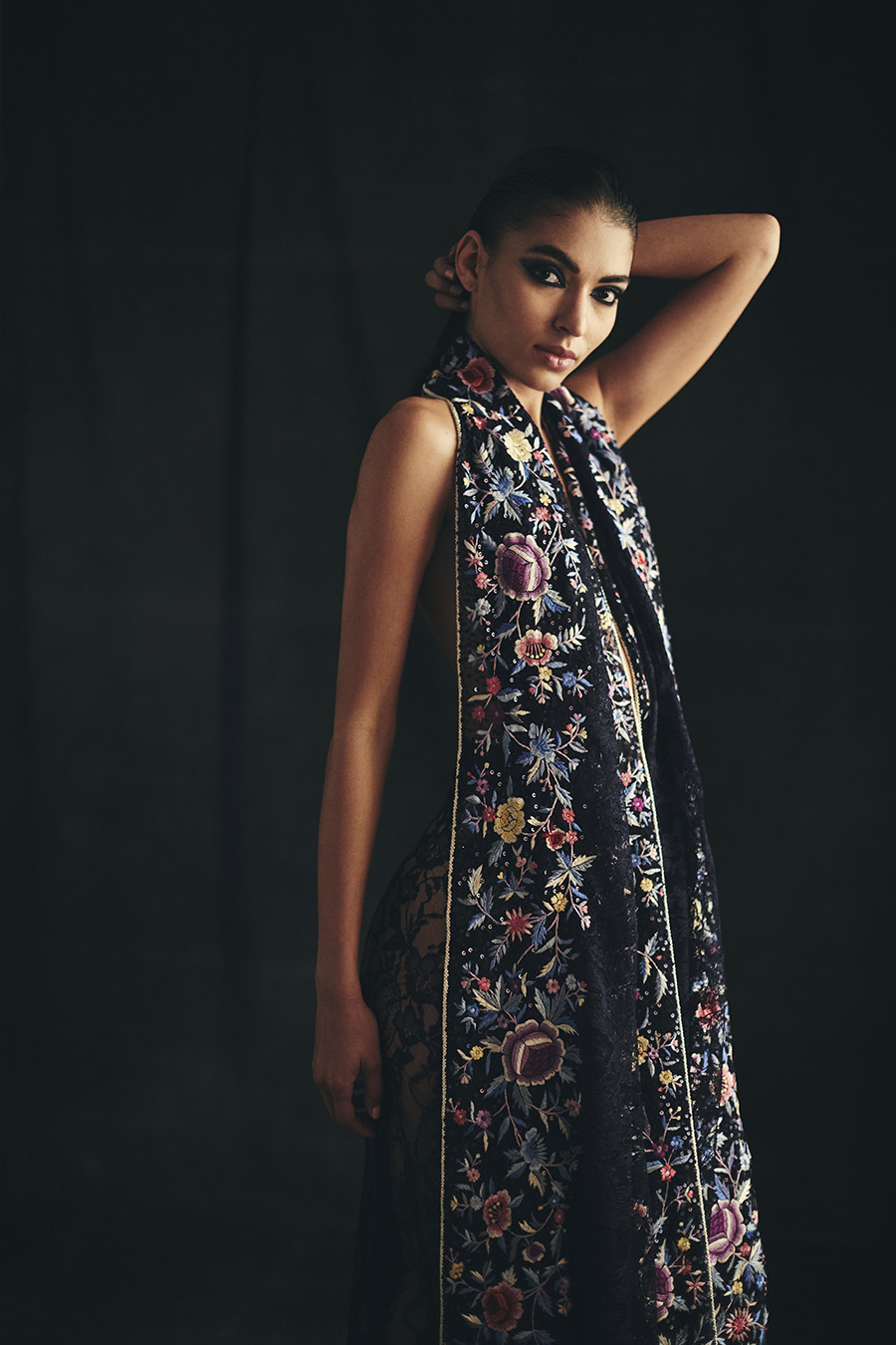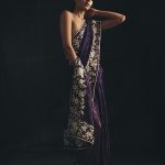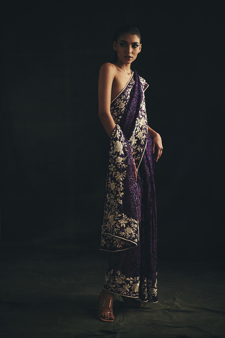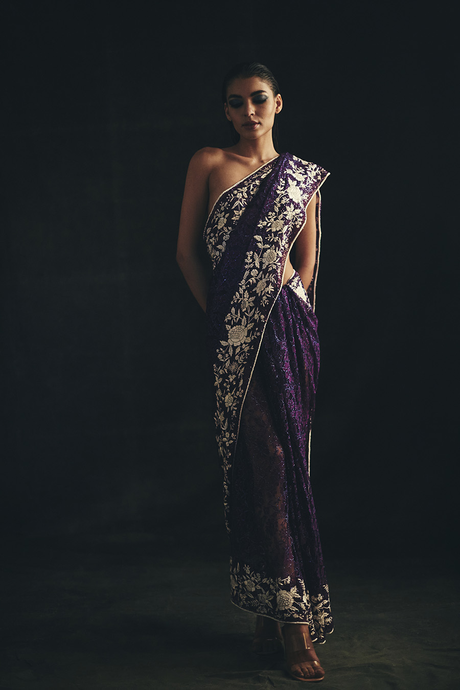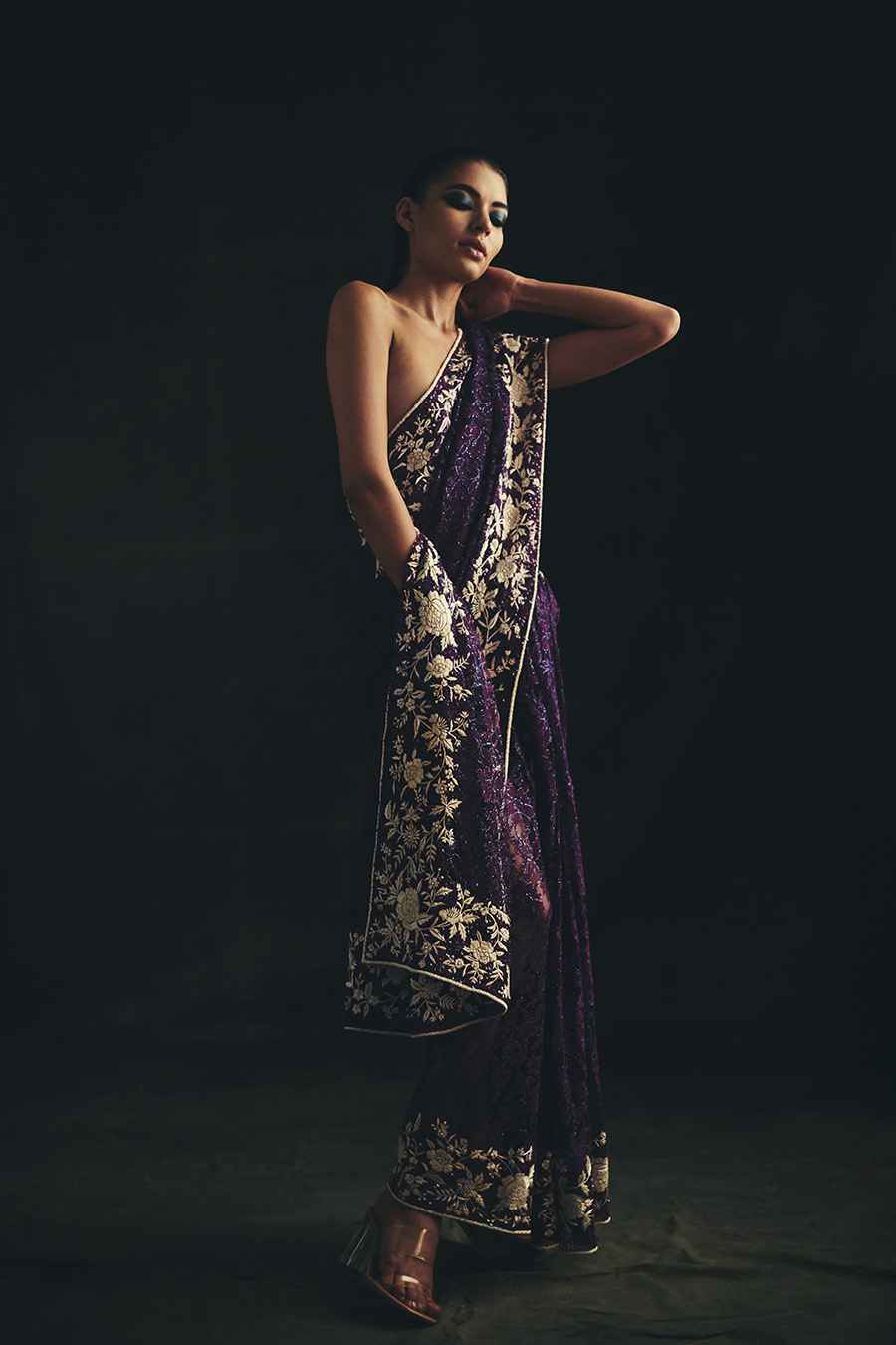 Our latest capsule of saris are all about the mystique and sensuousness of lace. Take this midnight blue number for instance, with its myriad embroidered and embellished blooms. Drape it around yourself and look no less than a heavenly body in the night sky.
