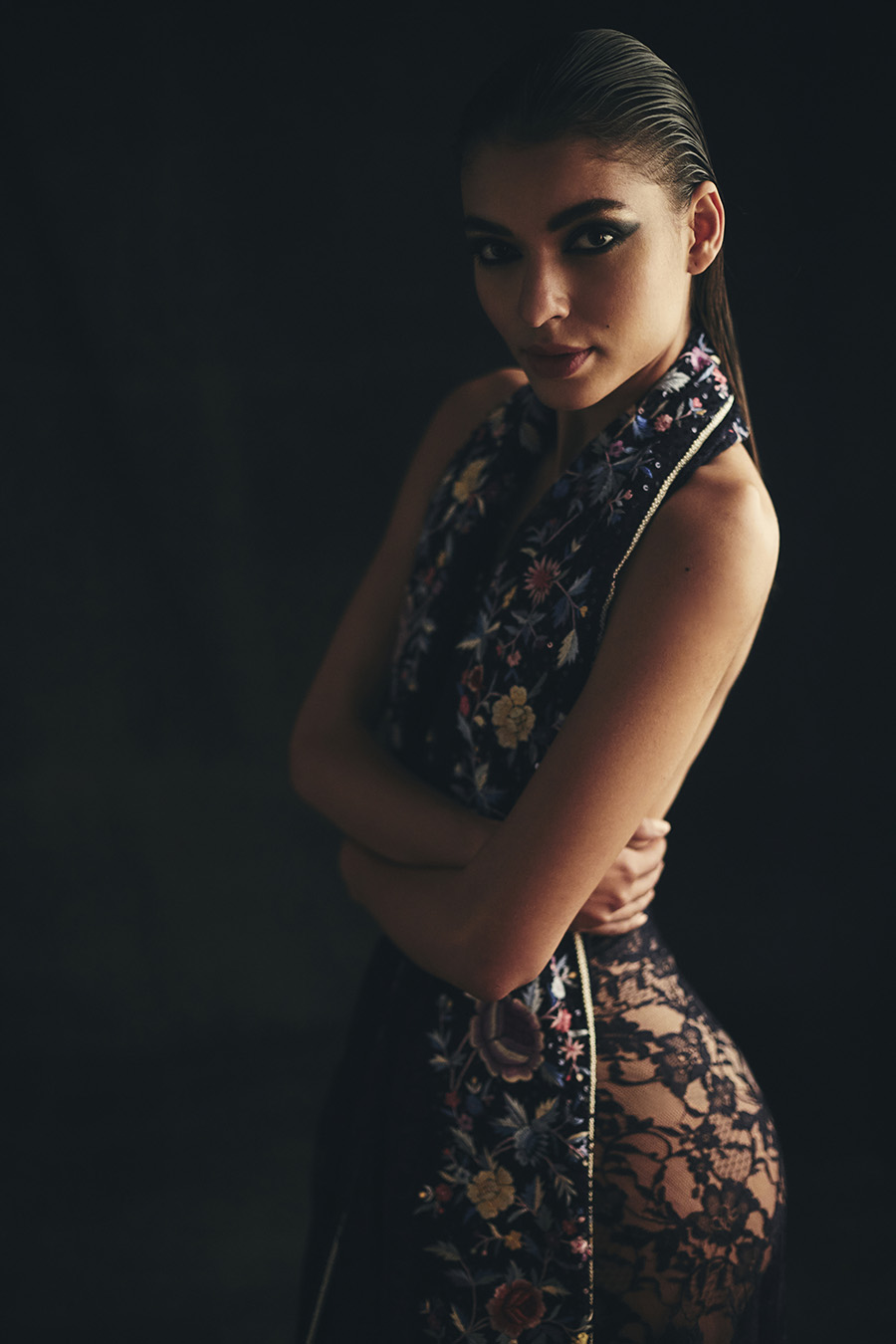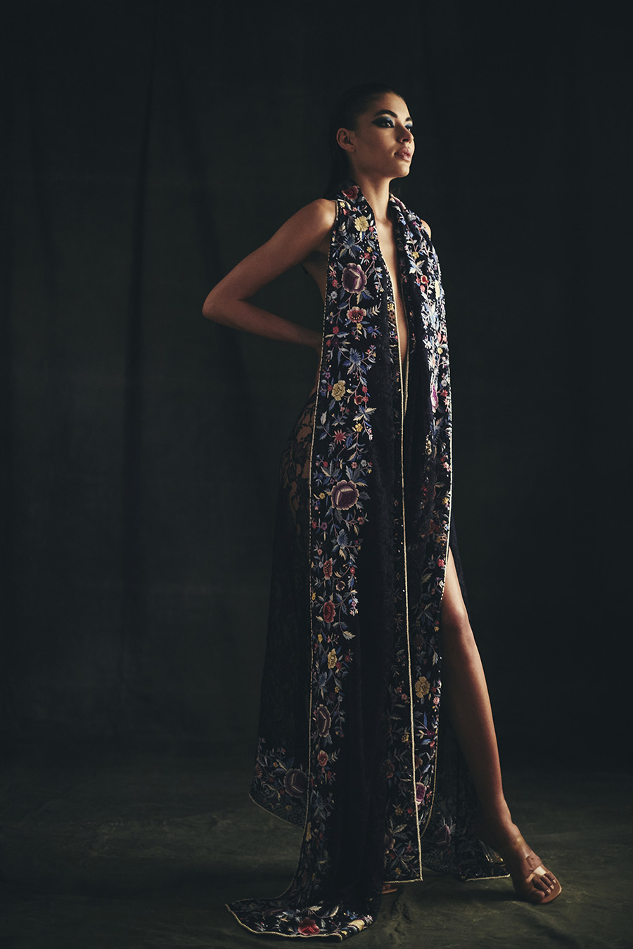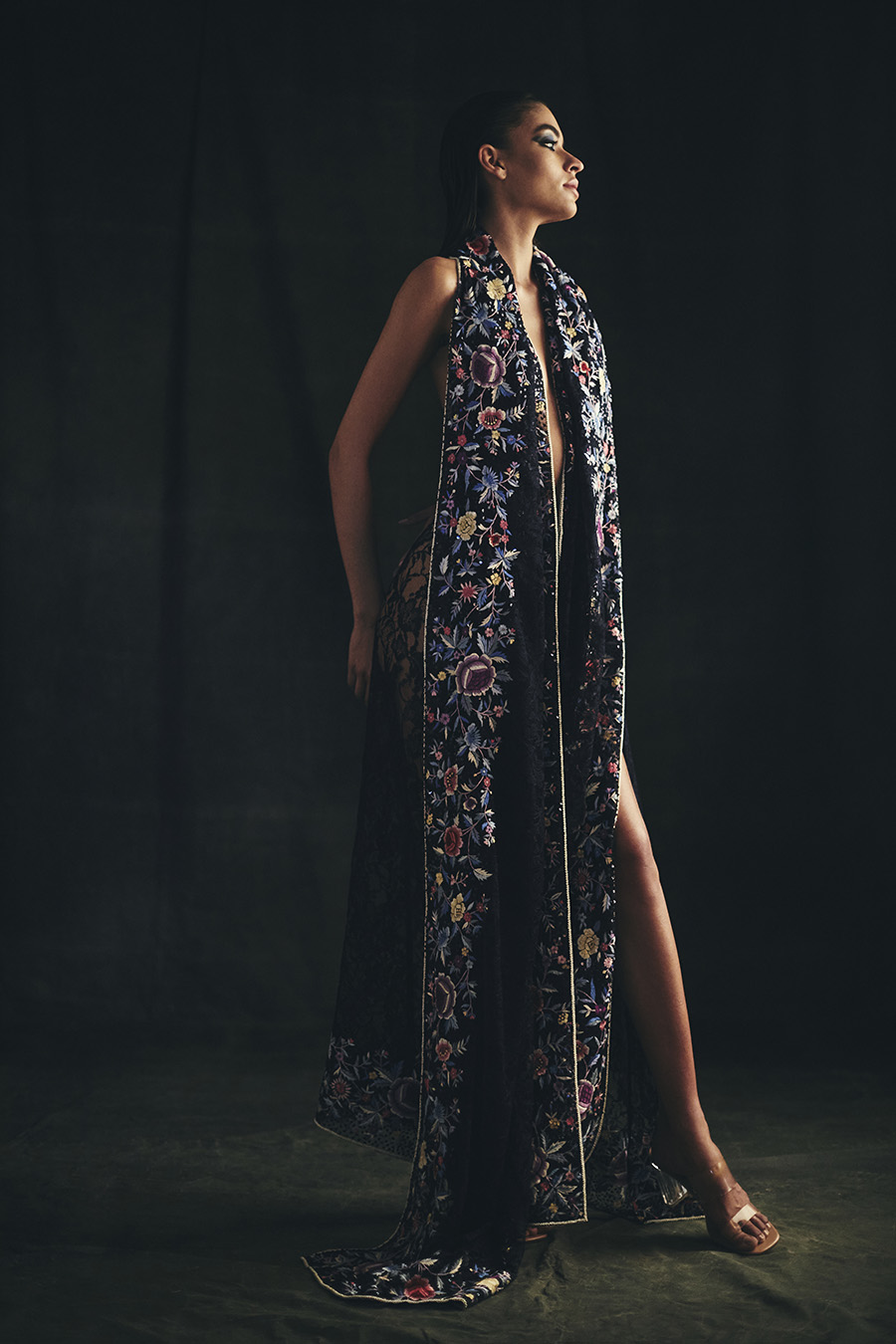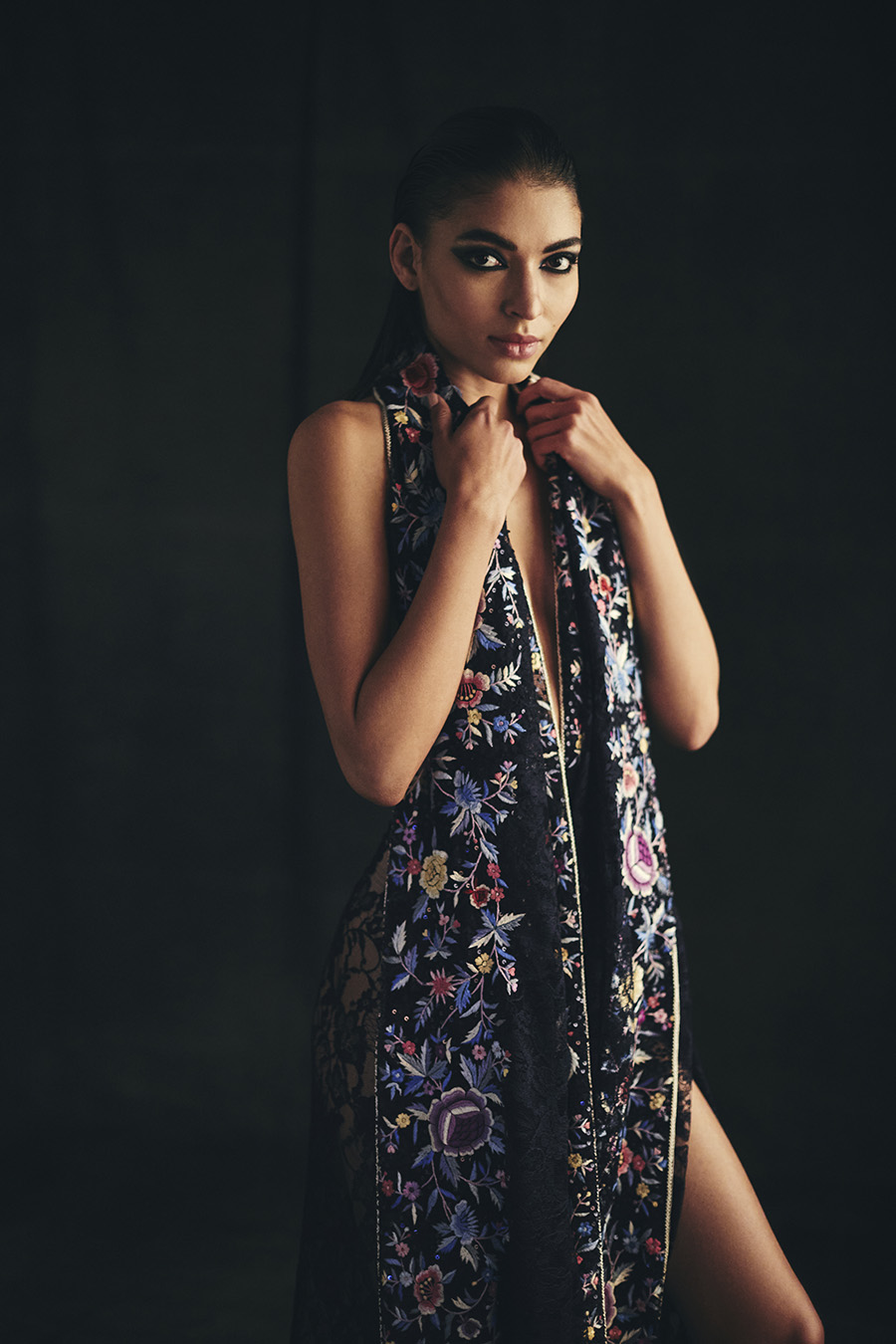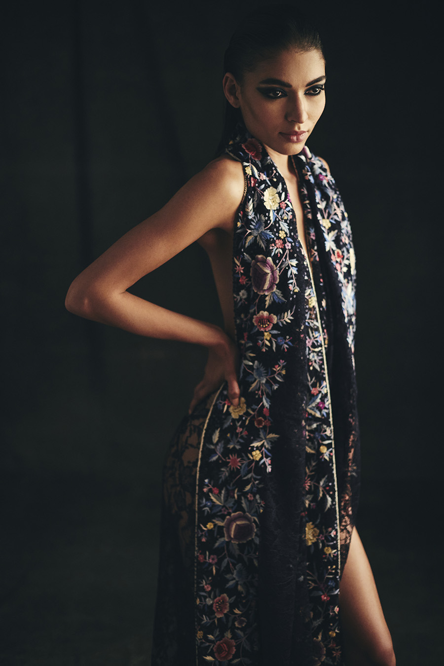 Our latest capsule of saris are all about the mystique and sensuousness of lace. Take this midnight blue number for instance, with its myriad embroidered and embellished blooms. Drape it around yourself and look no less than a heavenly body in the night sky.