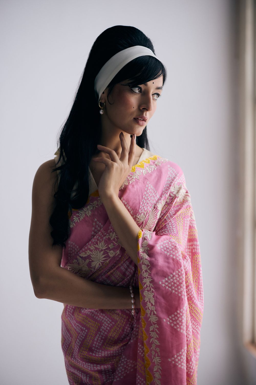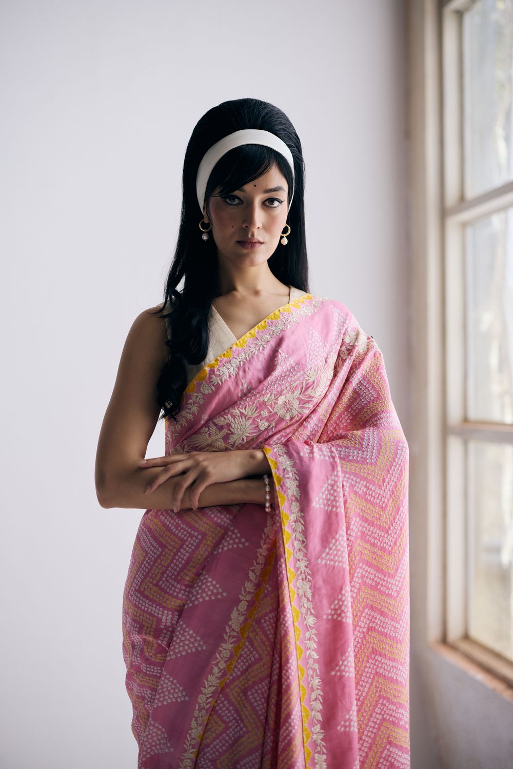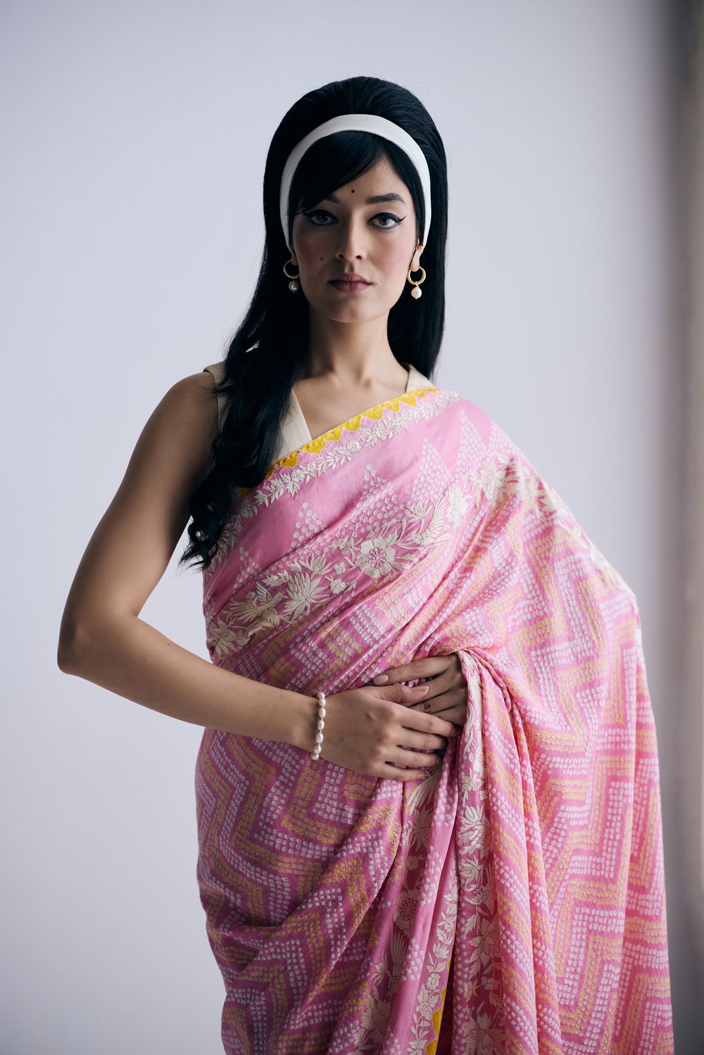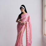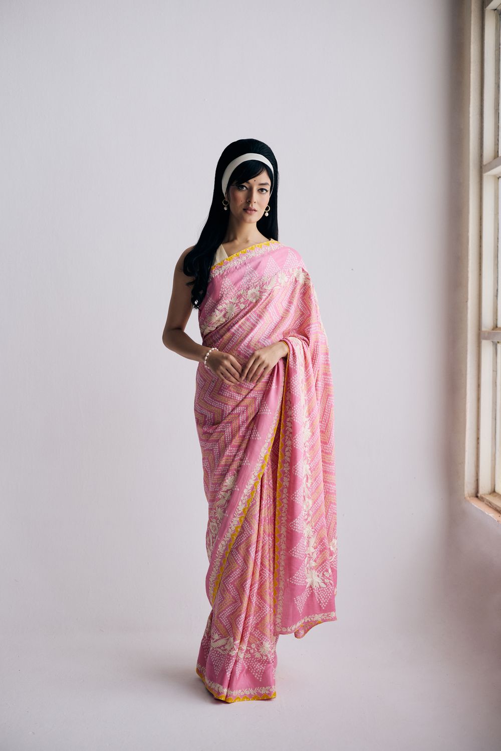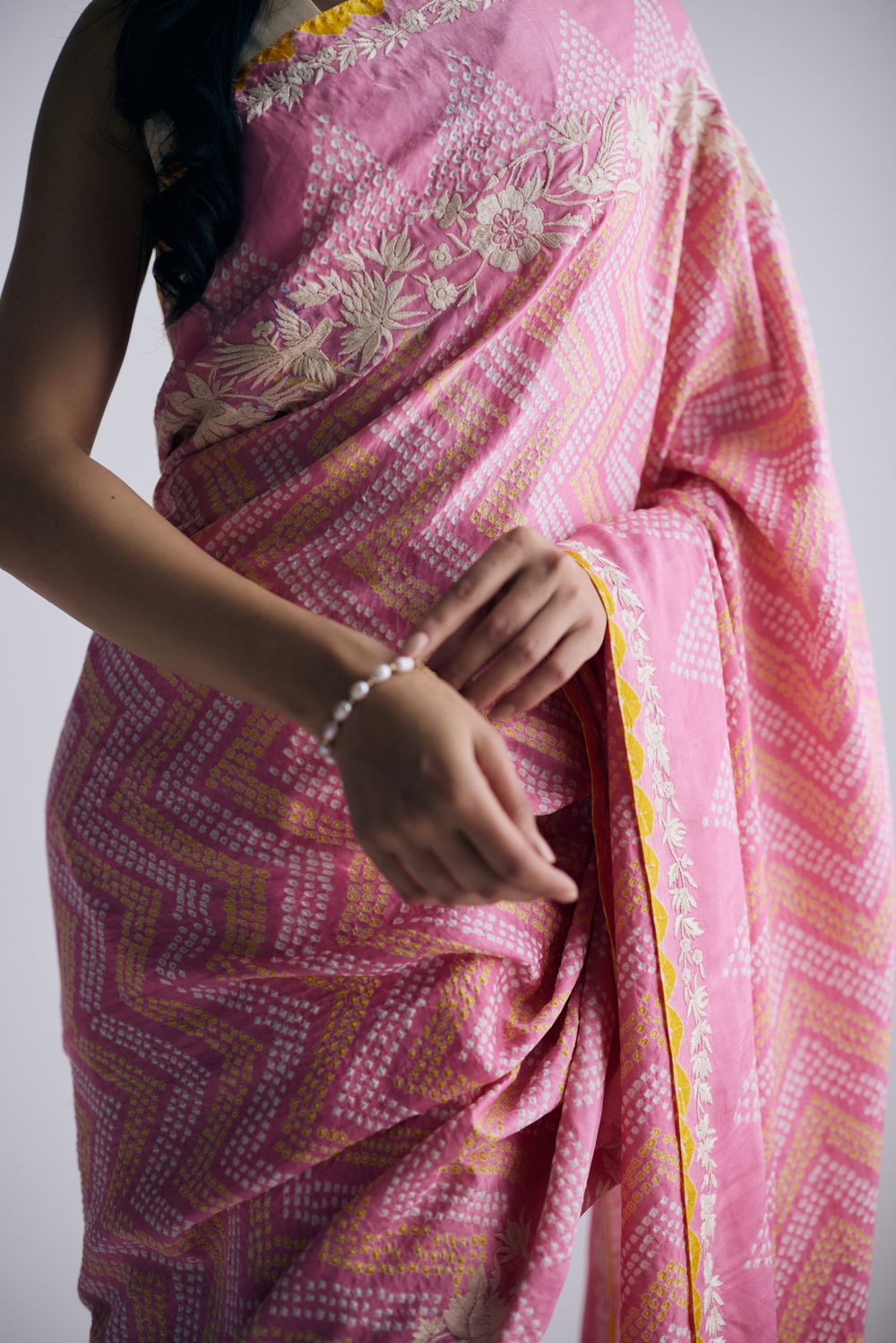 The Sharmila sari sari in a light pink, yellow and ivory combination features delicate bandhani dots arranged in leheriya-style zigzag lines and a parsi gara border with cosmos flowers