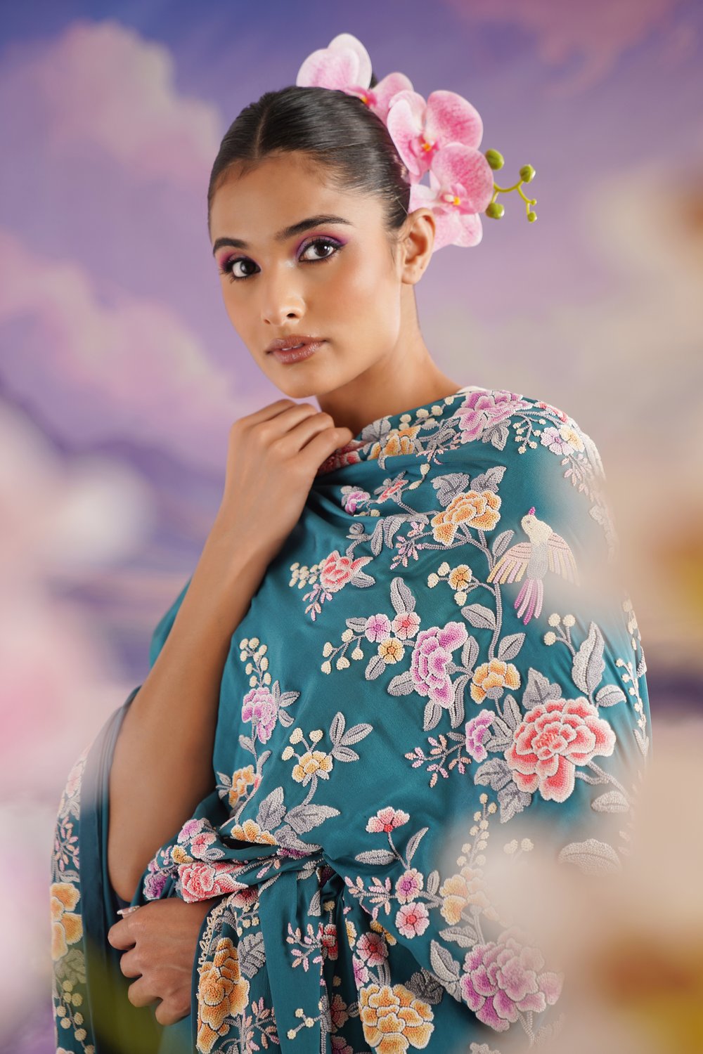 Picture precious little birds communing with flowers in an idyllic garden. A dreamscape skilfully rendered by our karigars on the Shiraz french knot sari from our ‘Peking Garden’ capsule.