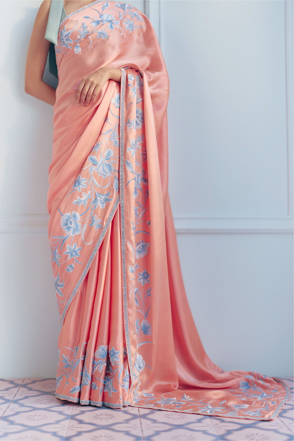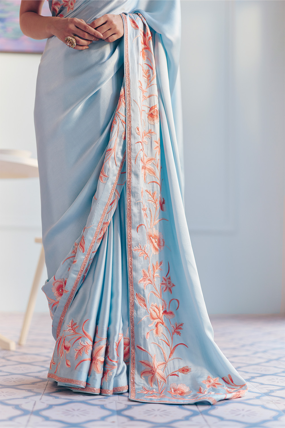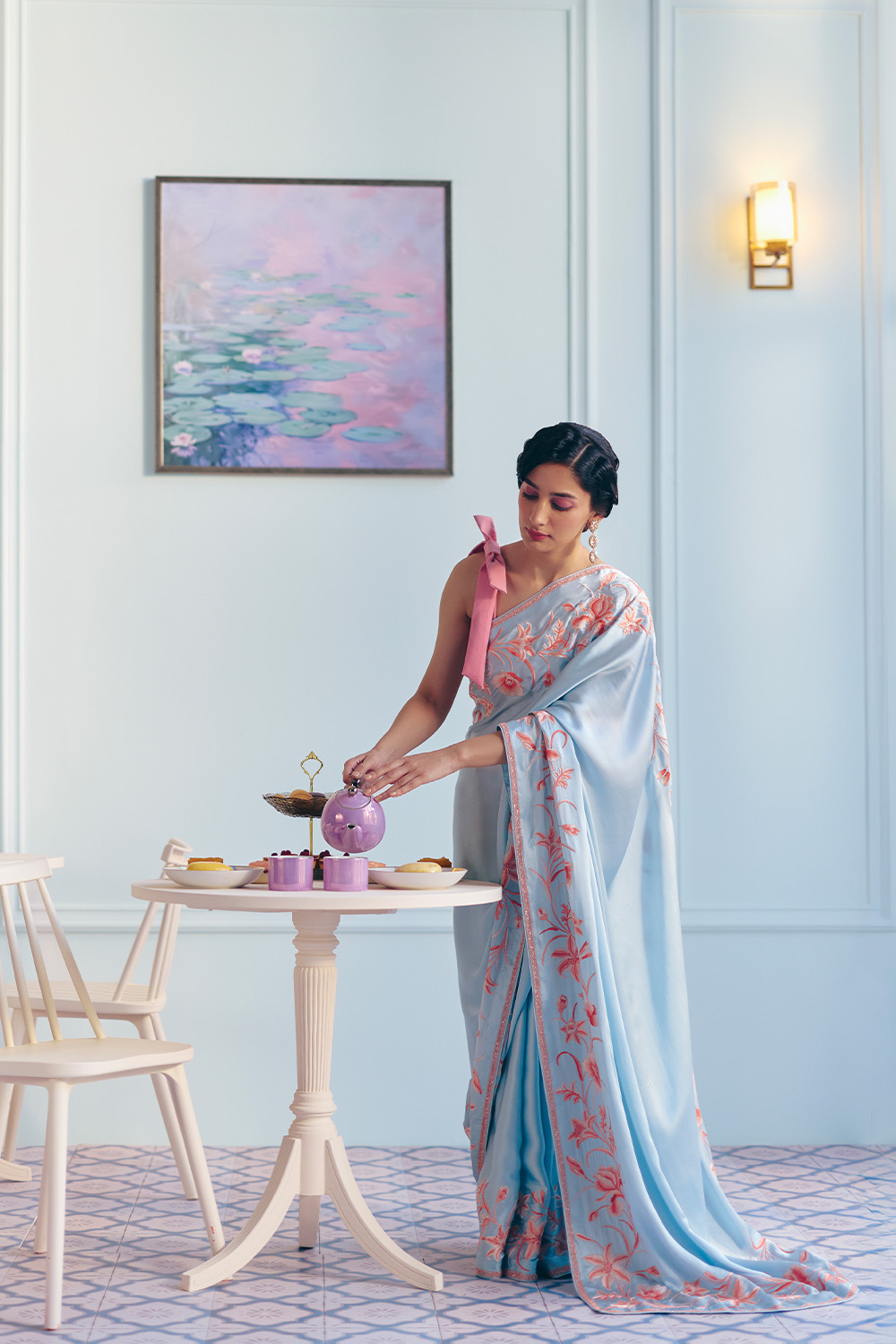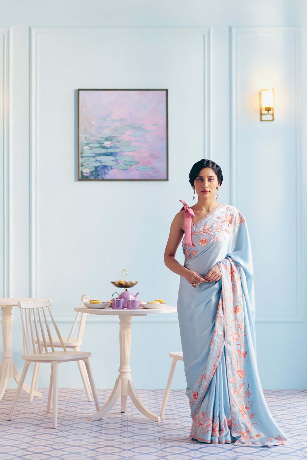 Made from lustrous satin, our ‘Shirley’ sari in Winter Blue features a luxurious hand-embroidered floral border in shades of Blush. We recognise that it’s important to look the part.