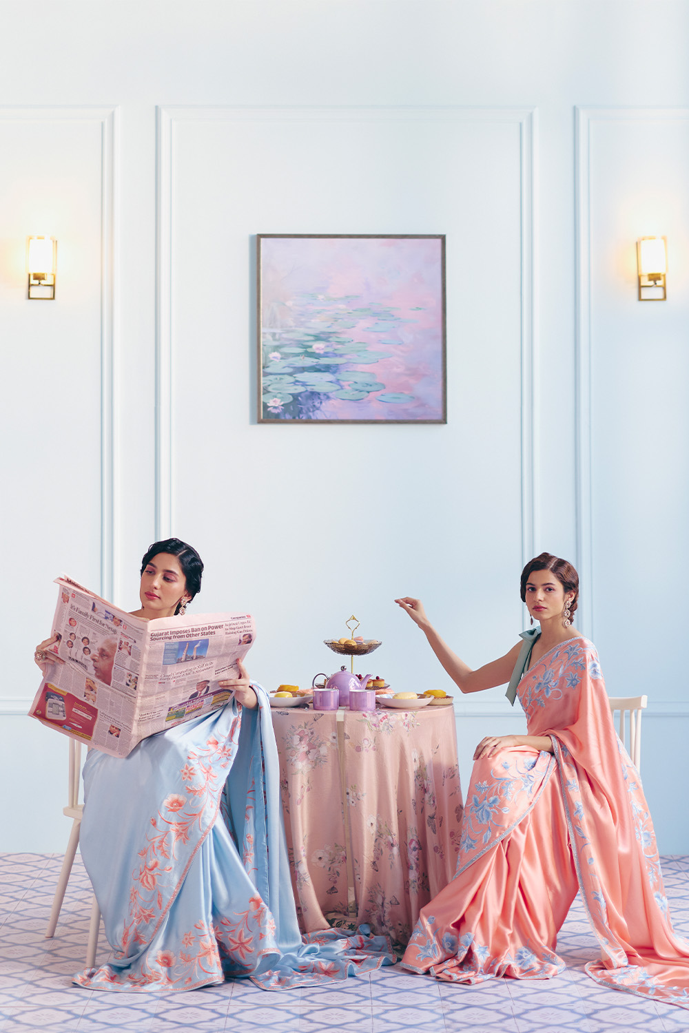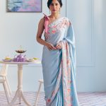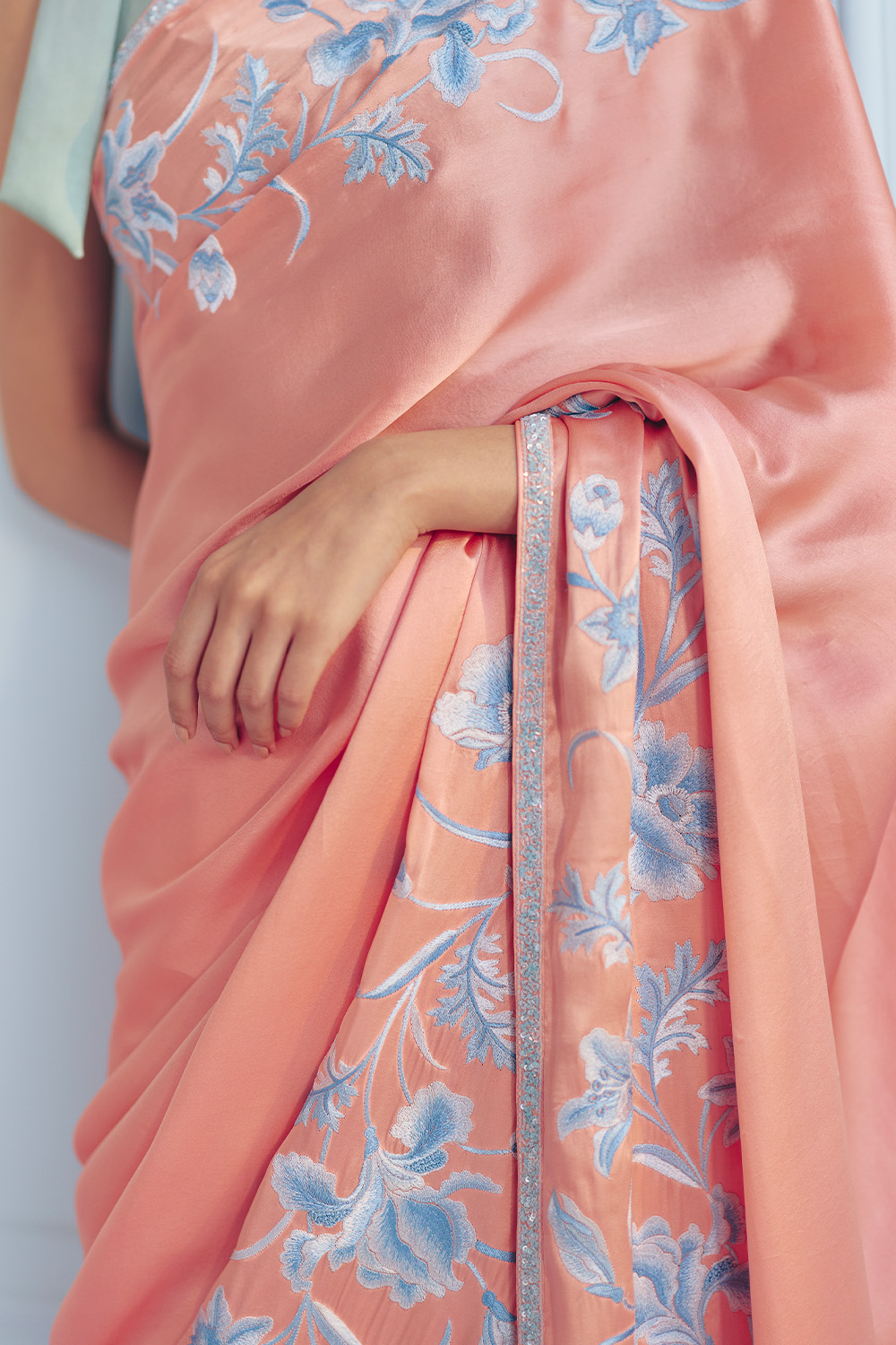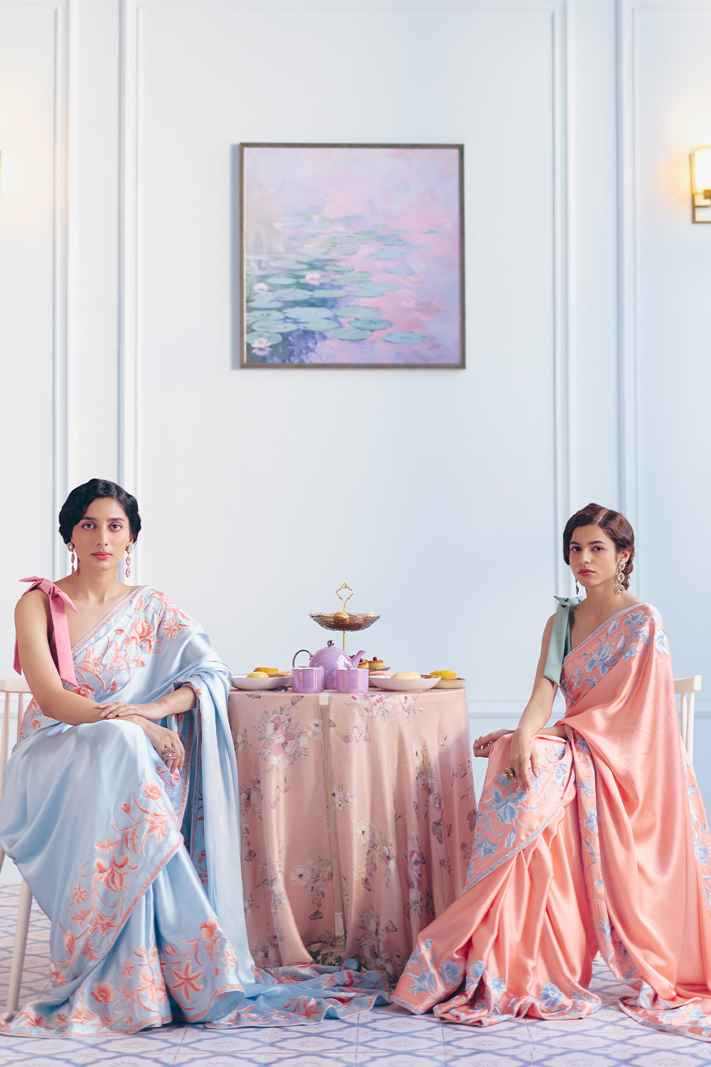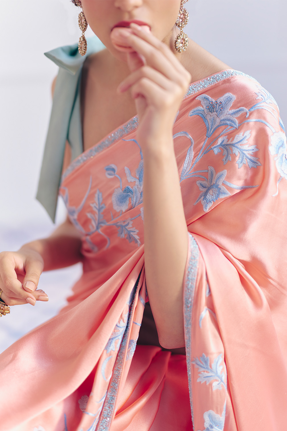 Made from lustrous satin, our ‘Shirley’ sari in Winter Blue features a luxurious hand-embroidered floral border in shades of Blush. We recognise that it’s important to look the part.