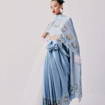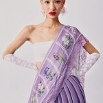 The sari (the Blue Moon colour way pictured here) is handcrafted in lightweight crepe and features a border inspired by hand-painted stamps.