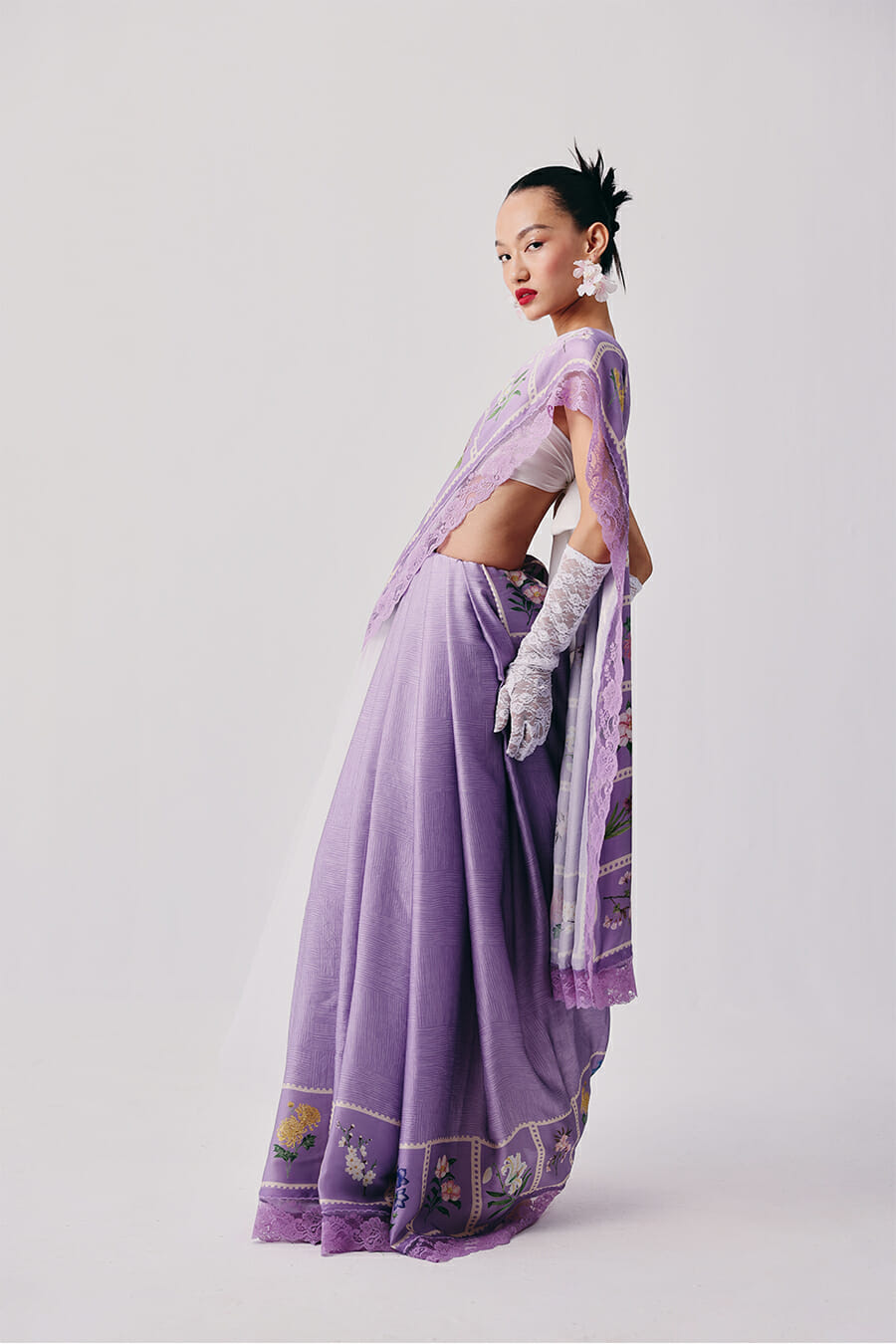 The lace-edging furthers the vintage charm of this sari which is such a fresh addition to any summer wardrobe.
