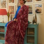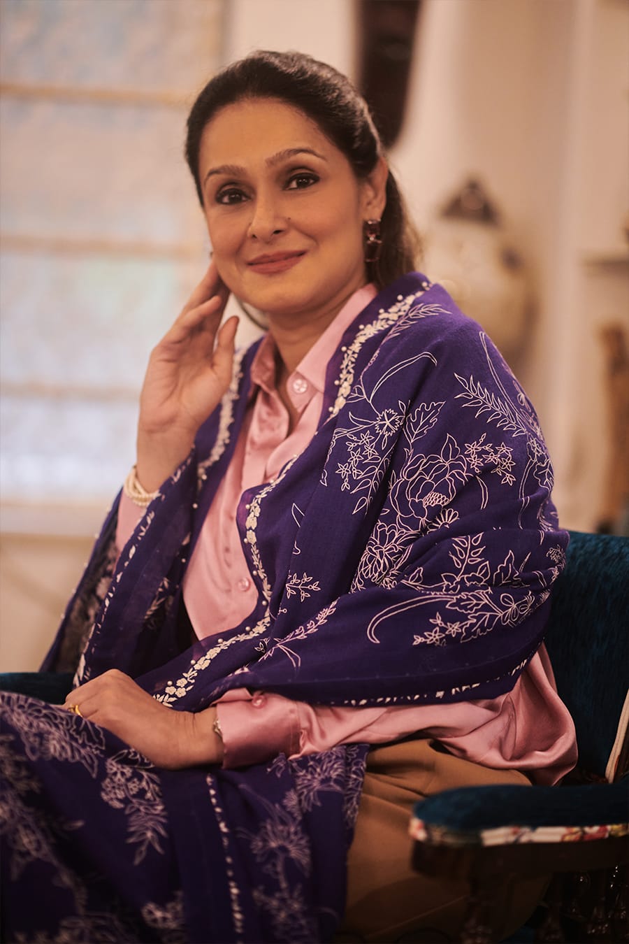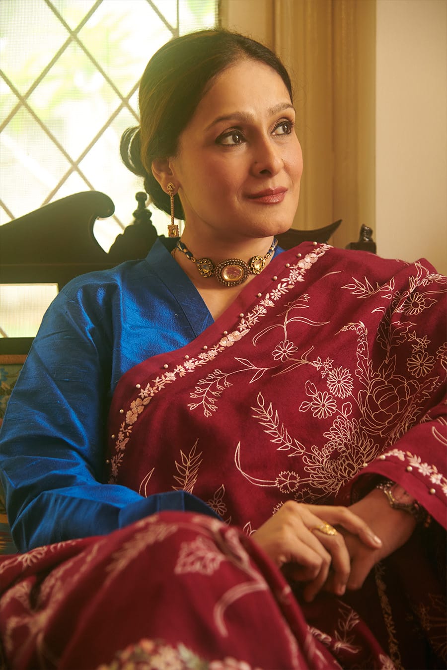 Dr Amrita Bewoor Sen @amritabewoor_sen just knows how to stay warm in style. Here she is wrapped up in our Tokyo pashmina shawl with trompe l’oeil embroidery in ivory, offset by colourful floral ends.