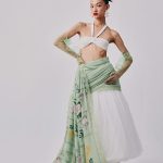 The sari (Pistachio version pictured here) handcrafted in lightweight crepe features a patchwork of florals and lace.