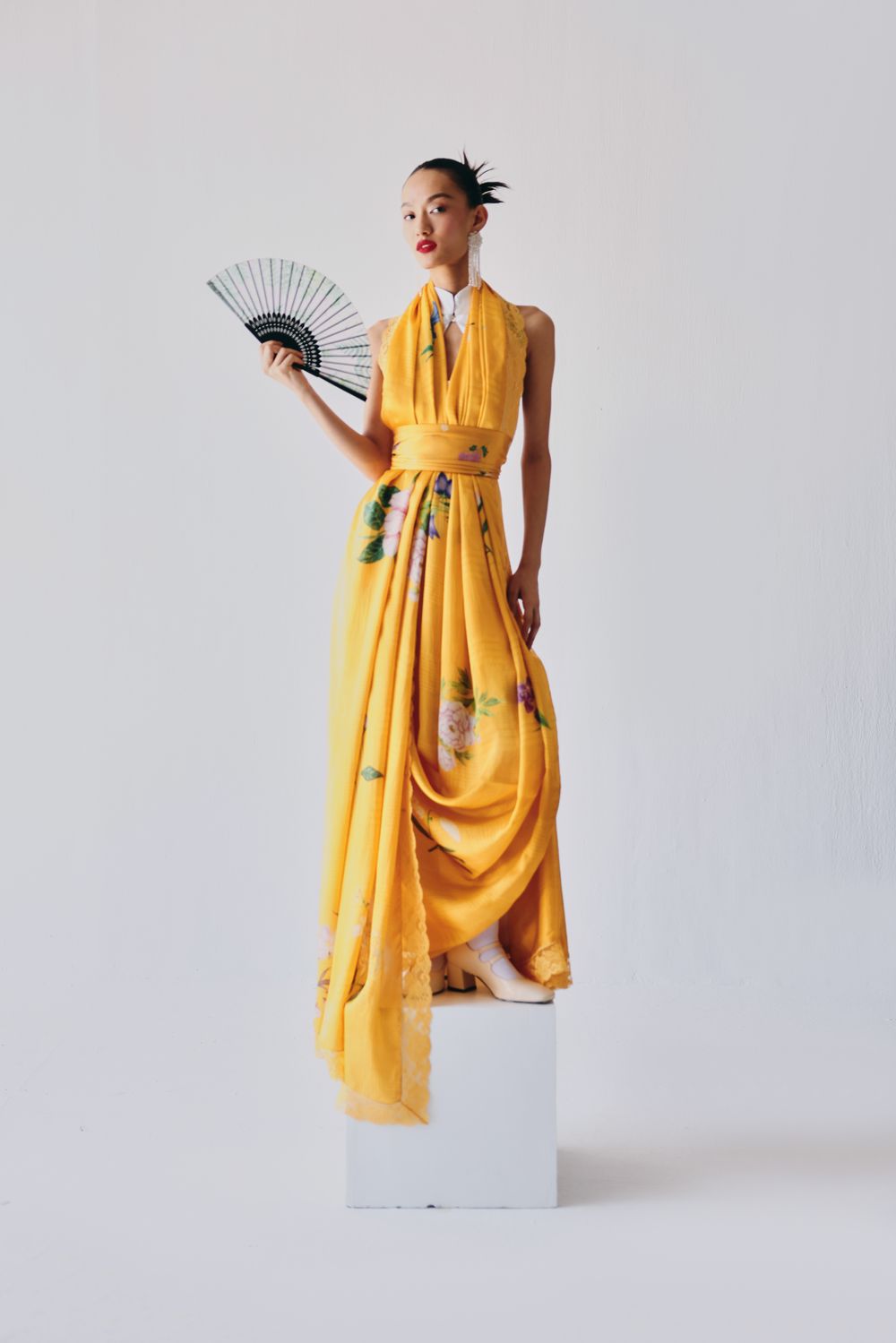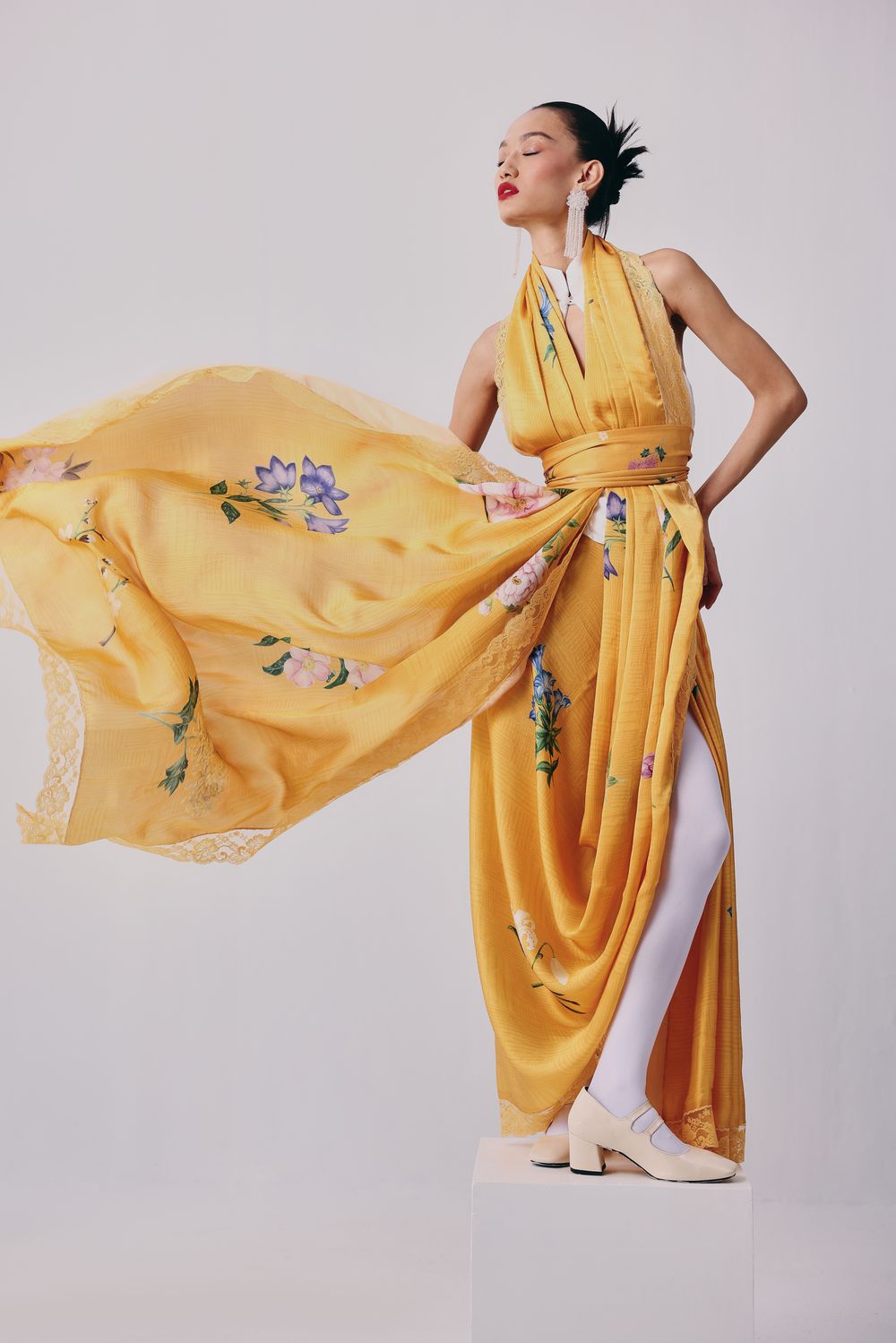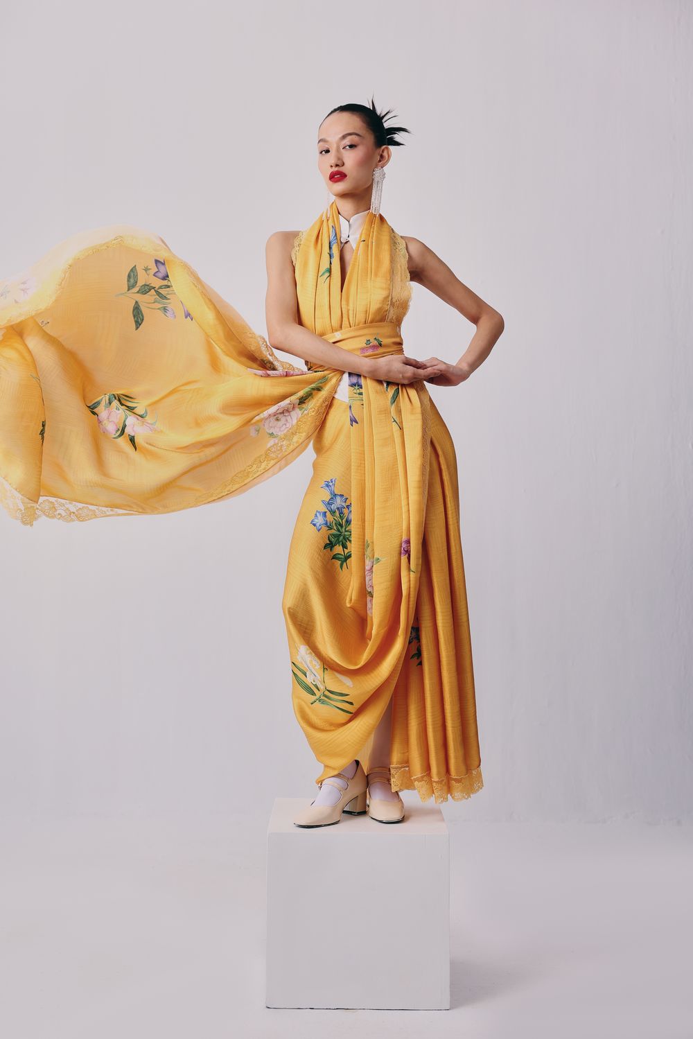The sari handcrafted in lightweight satin, comes in two delicious colour ways — Mango Sorbet (pictured here) 💛 & Blue Moon.