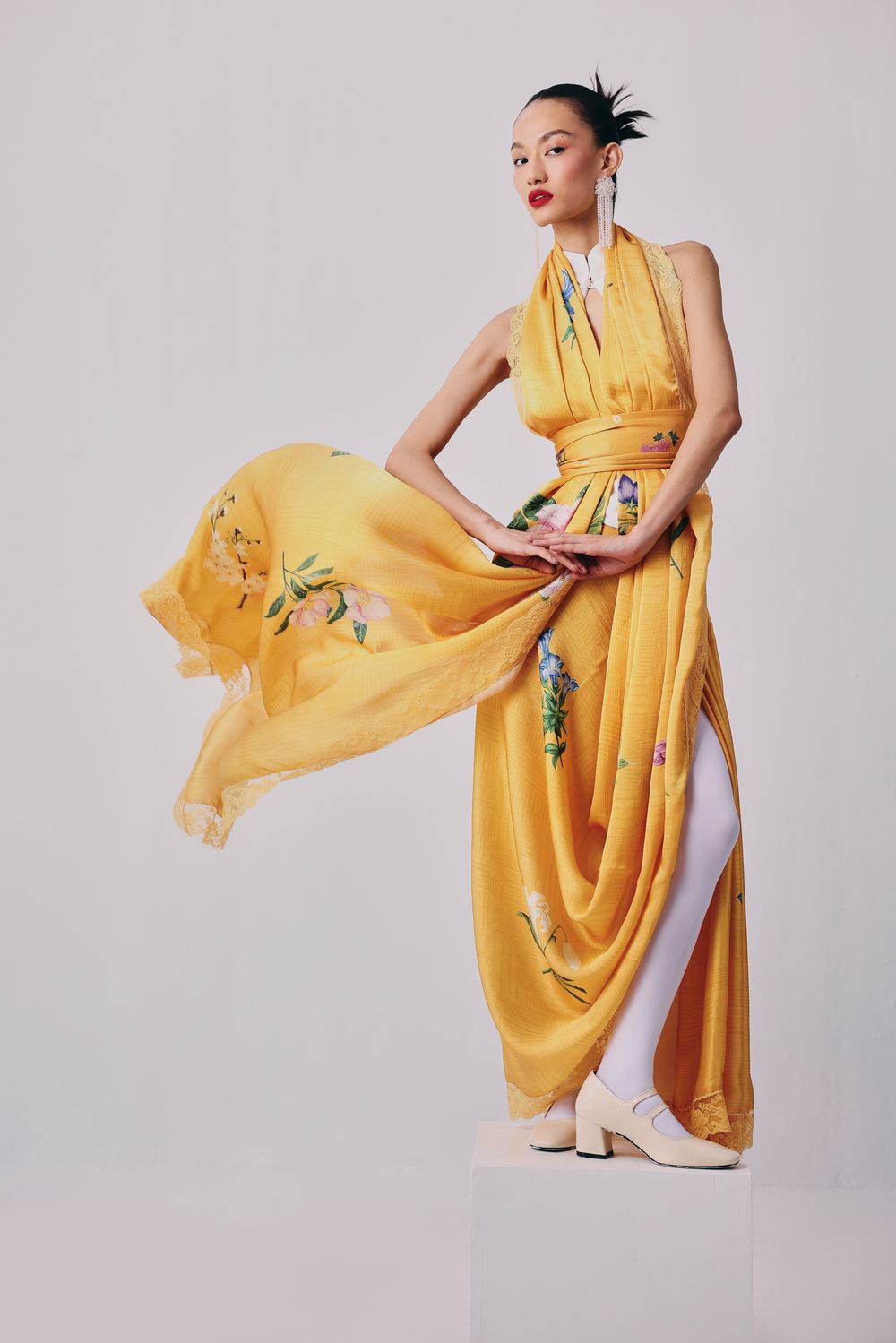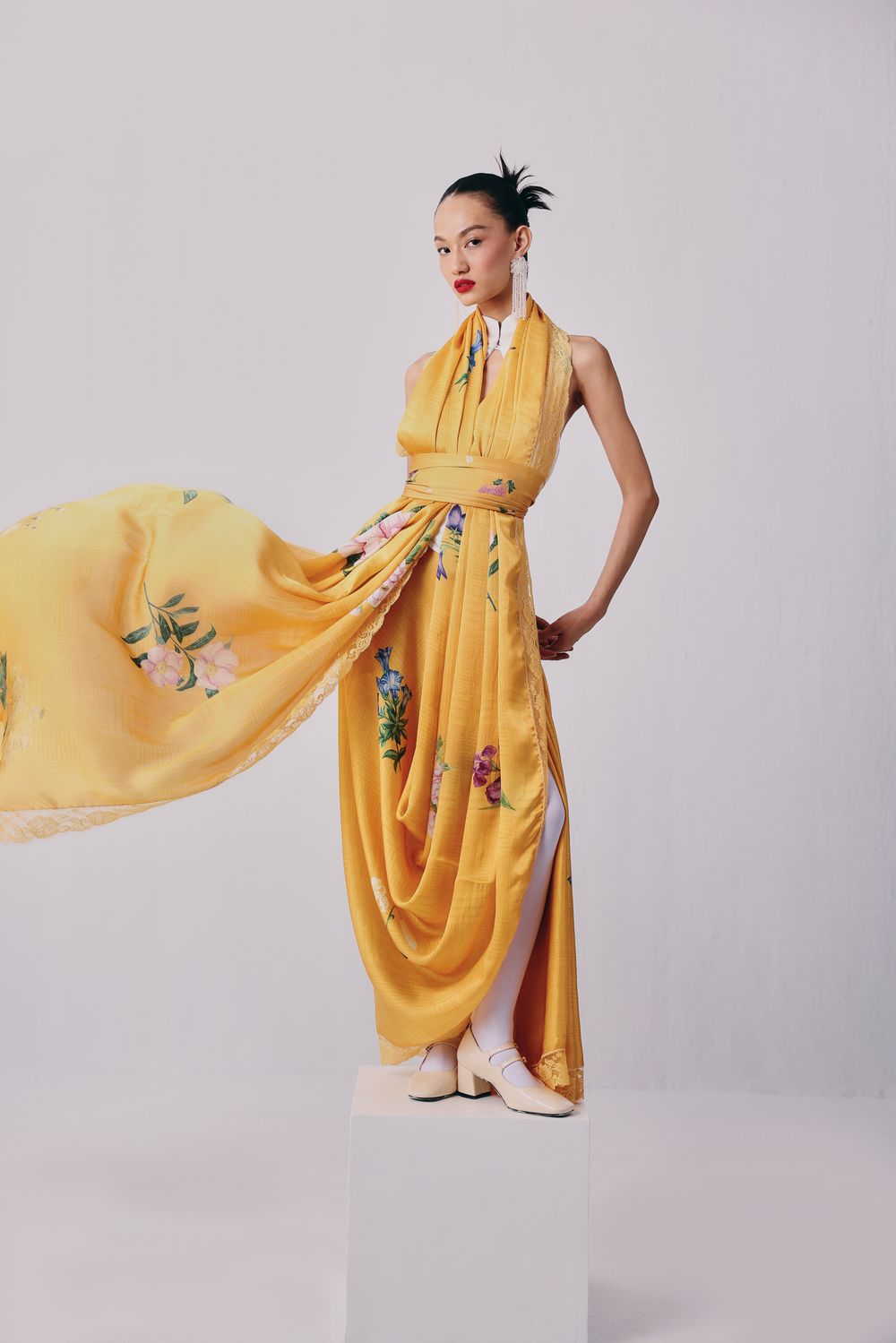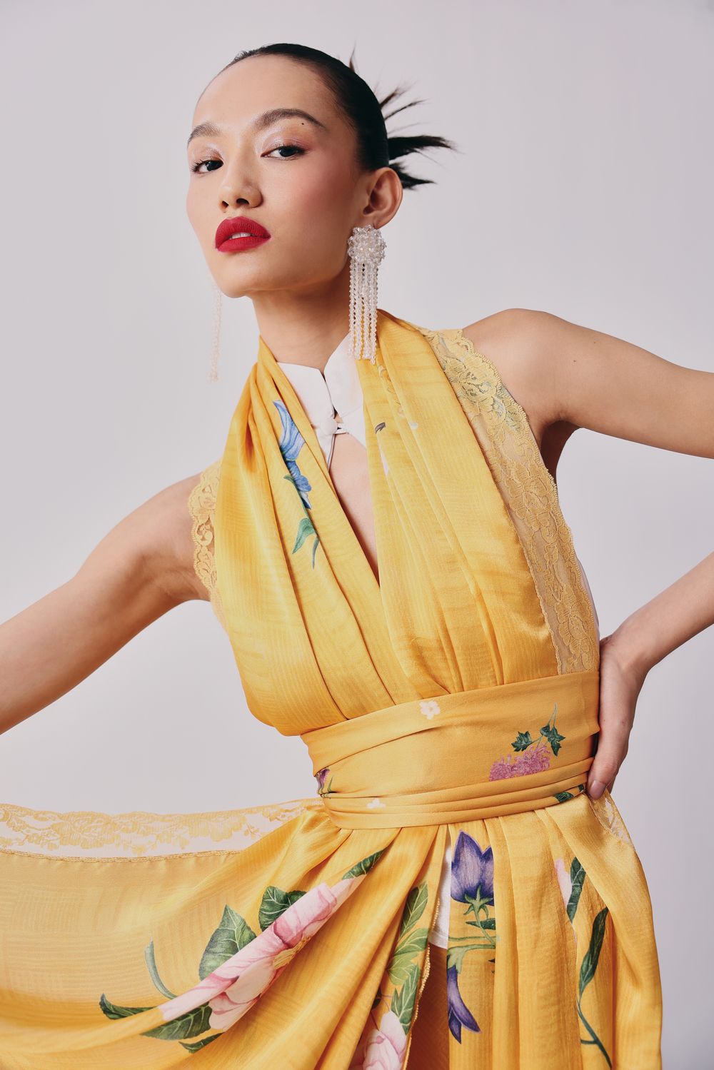 The sari handcrafted in lightweight satin, comes in two delicious colour ways — Mango Sorbet (pictured here) 💛 & Blue Moon.