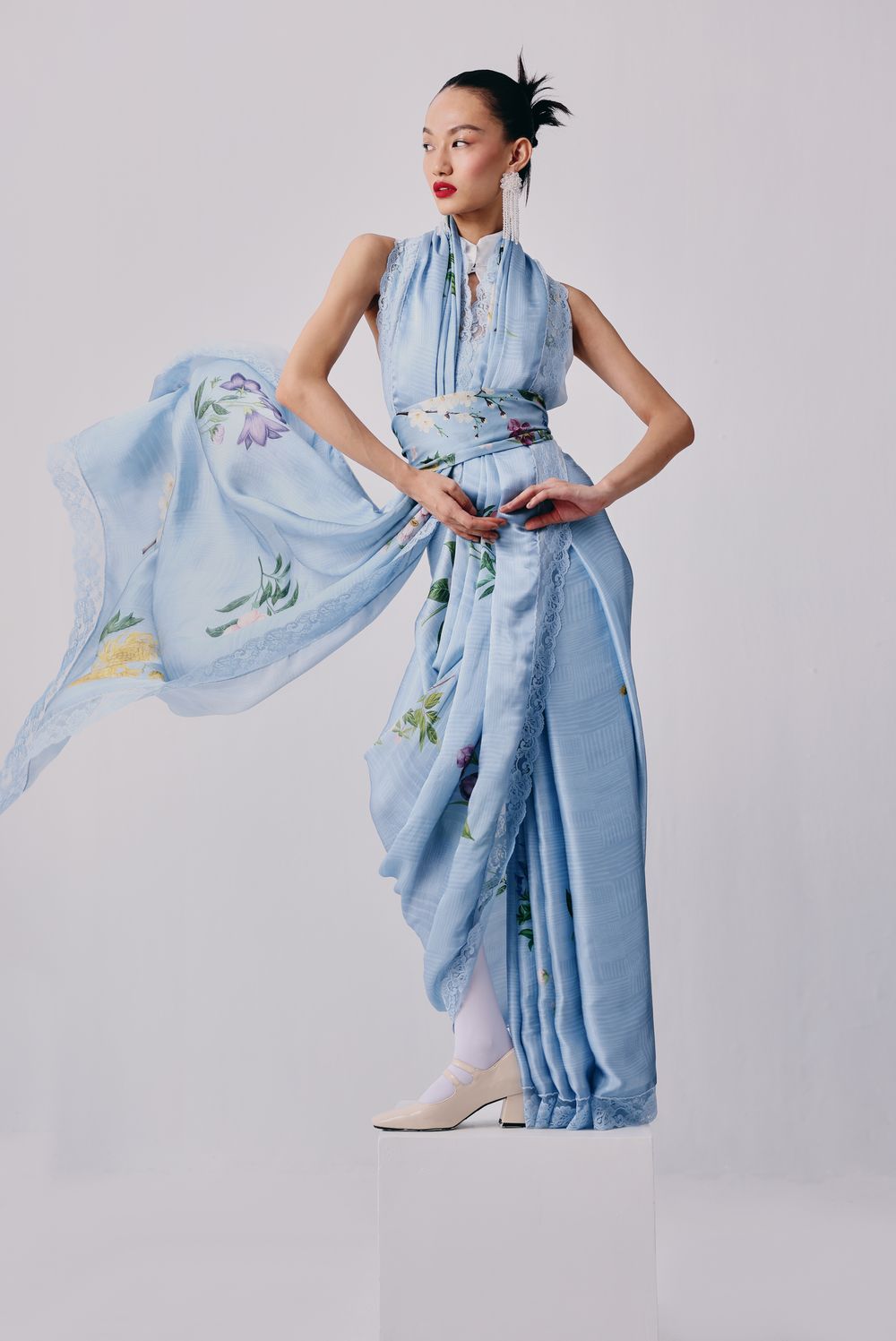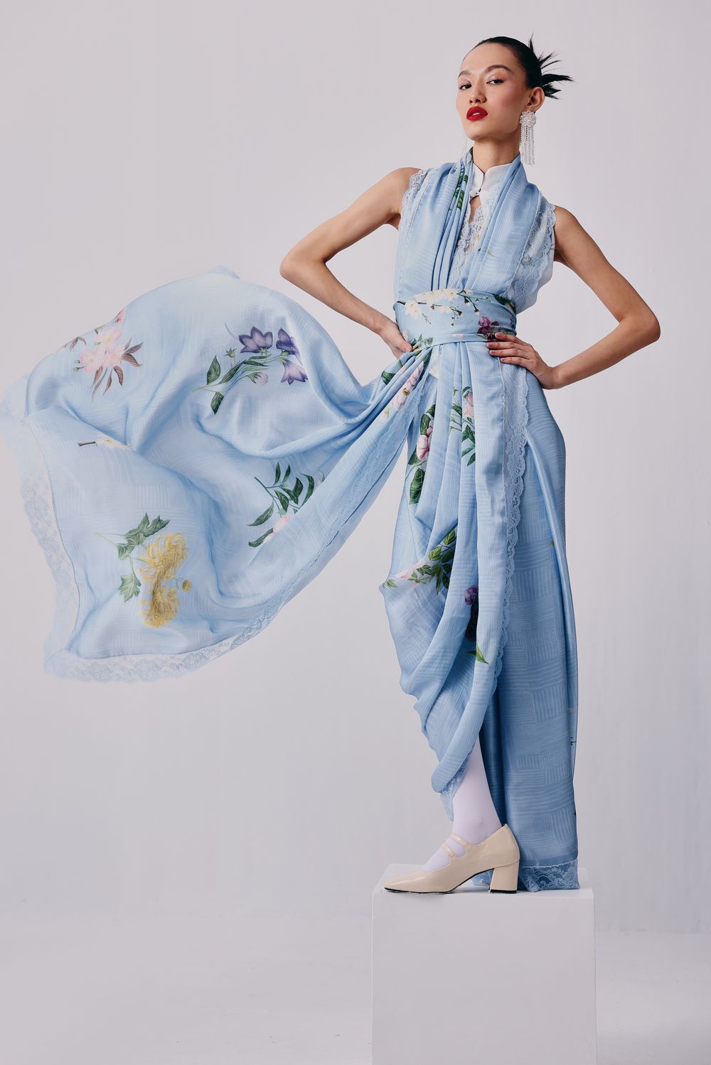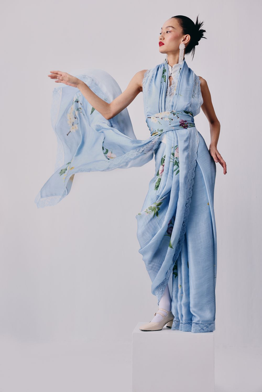 In keeping with our theme, the Ume sari celebrates the season of abundance with a smattering of Japanese florals.